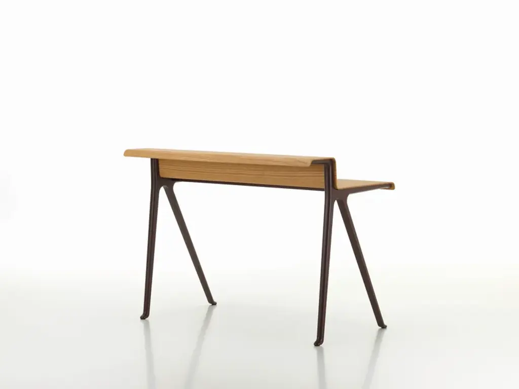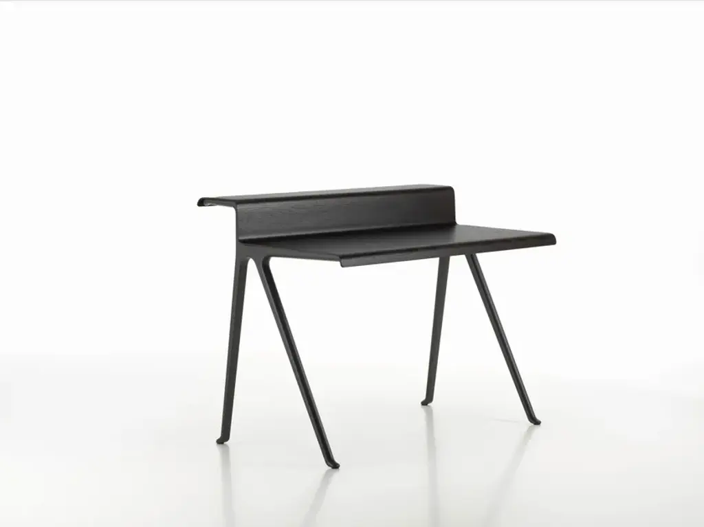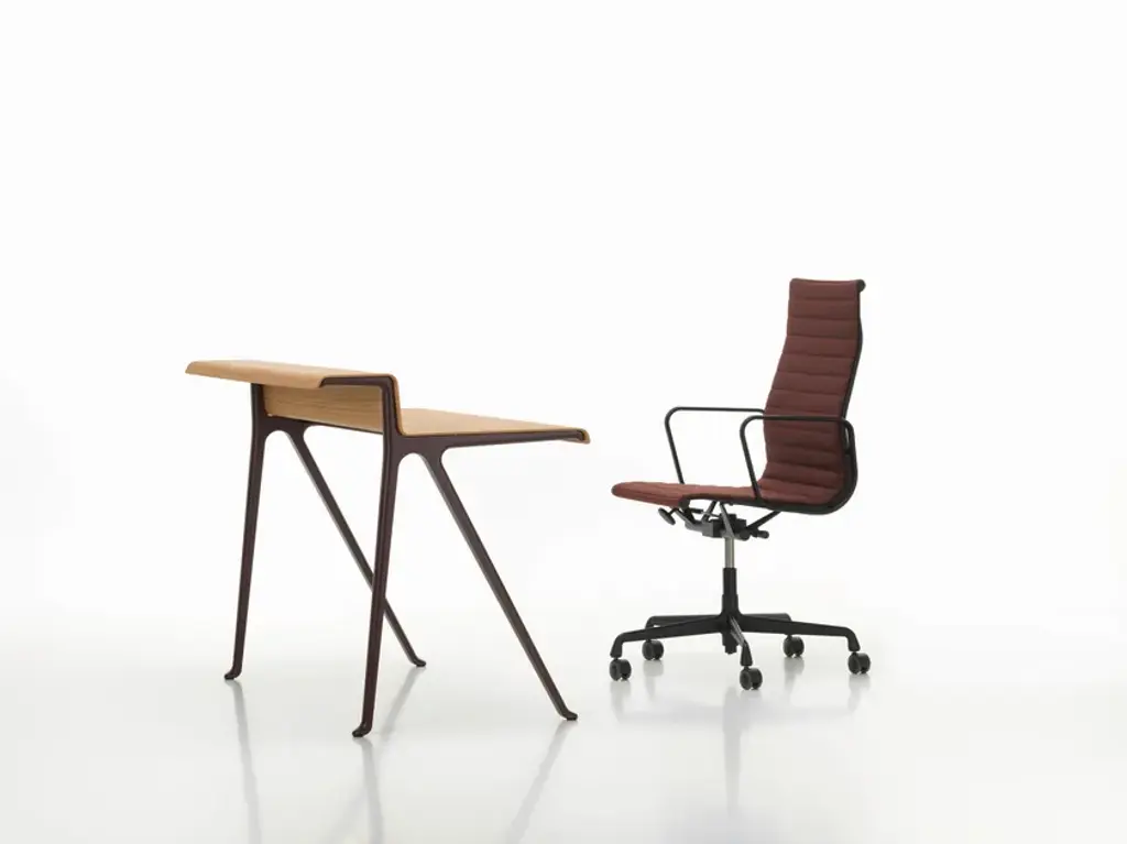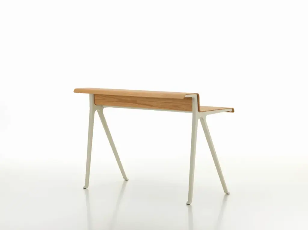 In addition to his industrial design projects, Ronan Bouroullec is also an artist, producing intricate drawings in which he repeats intuitive sequences of lines by hand with a Japanese felt tip brush. The contours of Courier can be read as an expression of this artistic verve, but also testify to Bouroullec‘s fl air for form and composition as well as his technical expertise: the desk eff ortlessly combines two high-quality materials, wood and aluminium, to create a distinctive yet unobtrusive whole.Courier thus joins George Nelson‘s Home Desk, Jean Prouvé‘s Compas Direction and Charles and Ray Eames‘s EDU in an illustrious line of aesthetically appealing objects that are both desk and sculpture. Viewed from the side, the desk‘s silhouette recalls a serif letter design – hence the name Courier, which is one of the best-known serif typefaces.MaterialsTable top: plywood with dark or natural oak veneer.Base: die-cast aluminium, powder-coated.Origin of wood: oak (Quercus robur) from Western Europe and/or Poland.