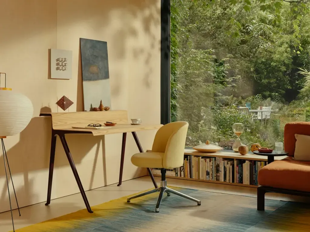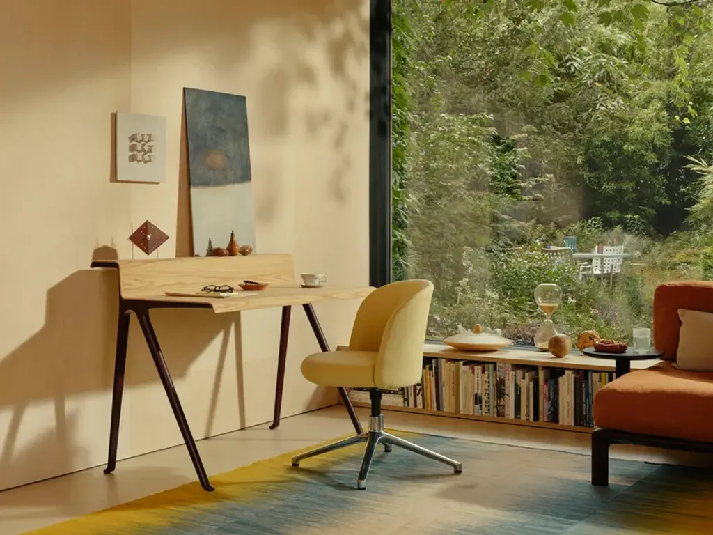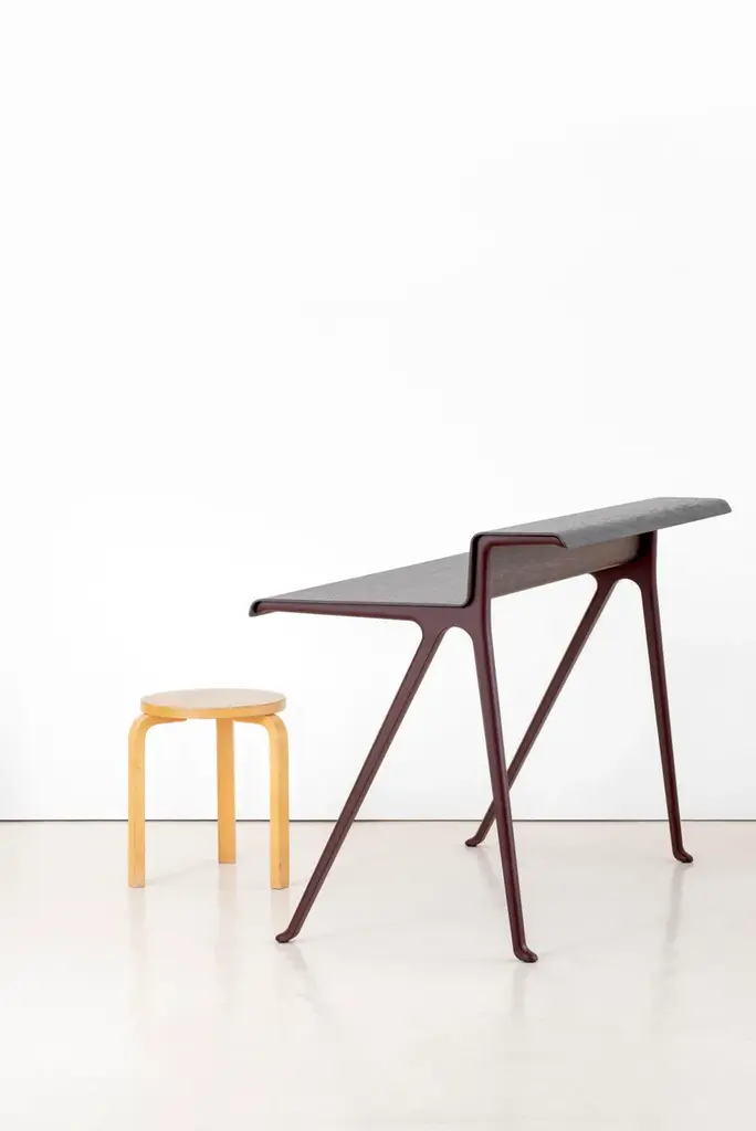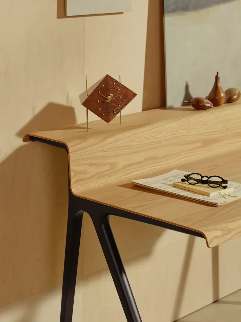 In addition to his industrial design projects, Ronan Bouroullec is also an artist, producing intricate drawings in which he repeats intuitive sequences of lines by hand with a Japanese felt tip brush. The contours of Courier can be read as an expression of this artistic verve, but also testify to Bouroullec‘s fl air for form and composition as well as his technical expertise: the desk eff ortlessly combines two high-quality materials, wood and aluminium, to create a distinctive yet unobtrusive whole.Courier thus joins George Nelson‘s Home Desk, Jean Prouvé‘s Compas Direction and Charles and Ray Eames‘s EDU in an illustrious line of aesthetically appealing objects that are both desk and sculpture. Viewed from the side, the desk‘s silhouette recalls a serif letter design – hence the name Courier, which is one of the best-known serif typefaces.MaterialsTable top: plywood with dark or natural oak veneer.Base: die-cast aluminium, powder-coated.Origin of wood: oak (Quercus robur) from Western Europe and/or Poland.
