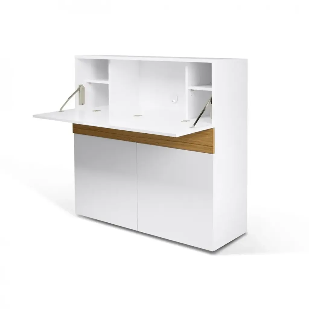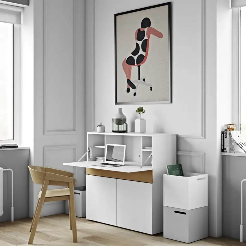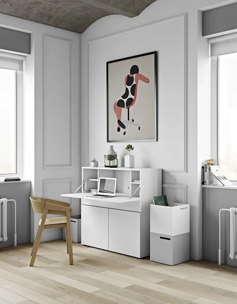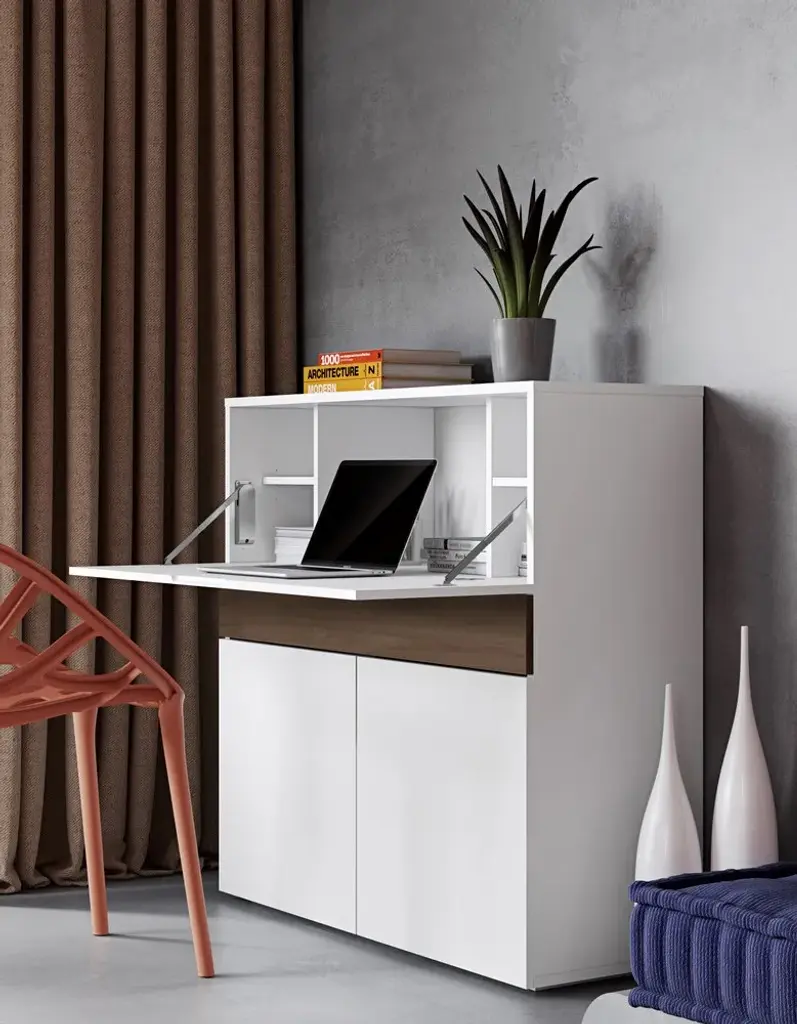 Workingstation ideal for small spaces. Featuring storage throughout the entire unit, it also has a drop-down door which converts into a working top for your laptop or tablet. Also featuring a roomy drawer and more storage behind the doors in the bottom half of the unit, the Focus is a pratical, well designed home office system.