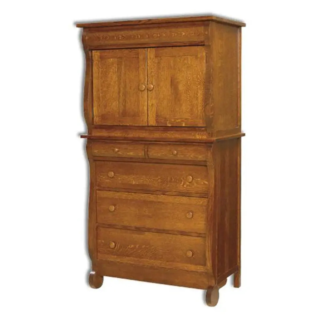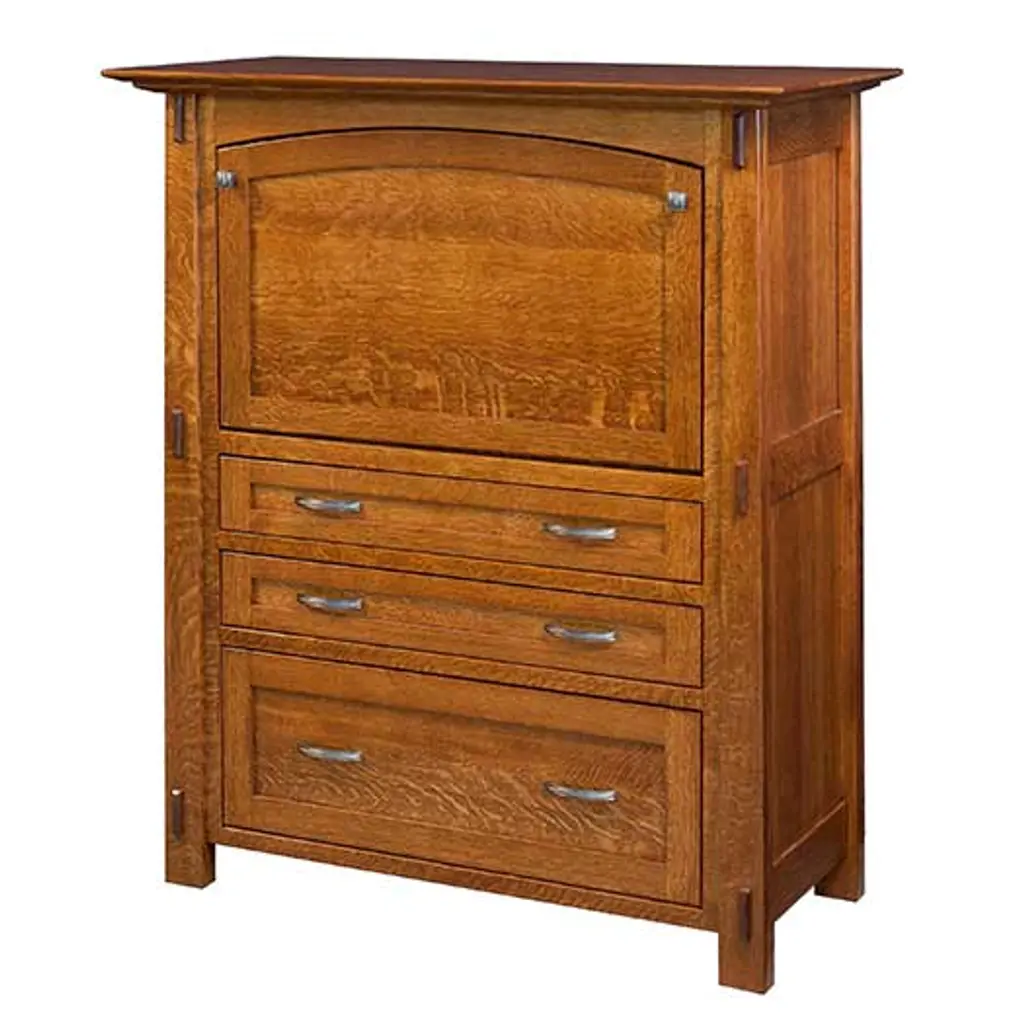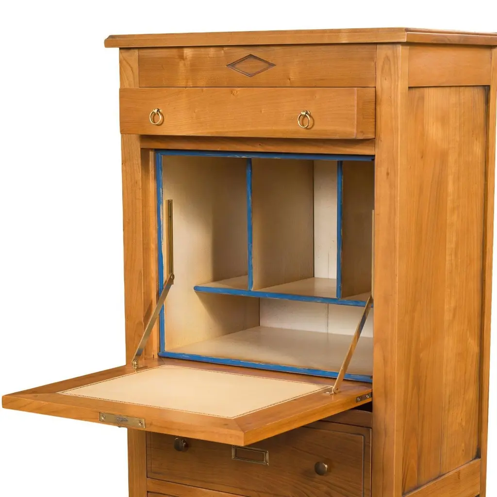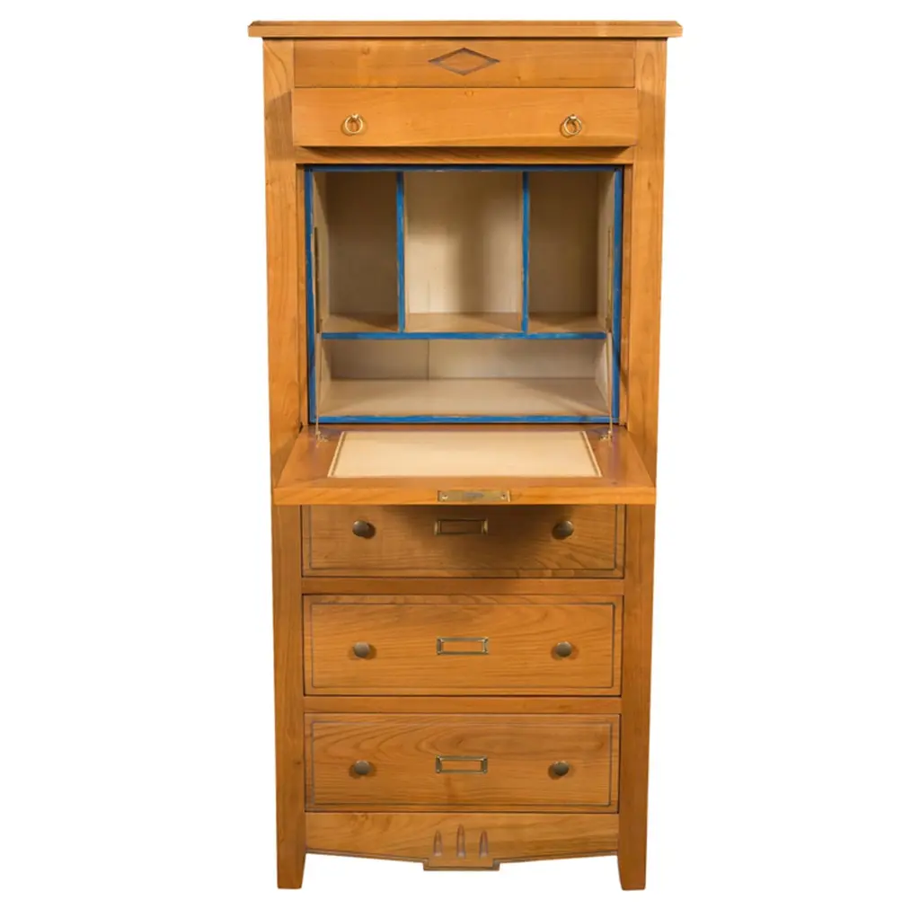 This Secretary is a handmade modernized interpretation of the French Directoire style at the end of the 18th century. This period is remarkable with its straight, classical and timeless lines.It is made of French Solid Cherry wood. Its classical finish involves a cherrywood stain and a satin varnish. The secretary features one upper drawer and three lower ones, brass knobs, a cream leather pad. The main compartment consists of 4 smaller compartments and of one drop down door with key. The inside is cream lacquered with blue painted borders. The sourcing of the solid wood comes from sustainably managed French forests.GONTIERis a cabinetmaker's furniture brand established since 1920 in Mayenne.It now belongs to the company MON PETIT MEUBLE FRANÇAIS.The manufacture of each piece of furniture remains artisanal, 100% French and of high-end quality.The solid wood comes from sustainably managed French forests, PEFC certified.We offer a 5 year warranty on every piece of furniture.As proof of their authenticity and uniqueness, our furniture is burnt with a "G" hallmark.