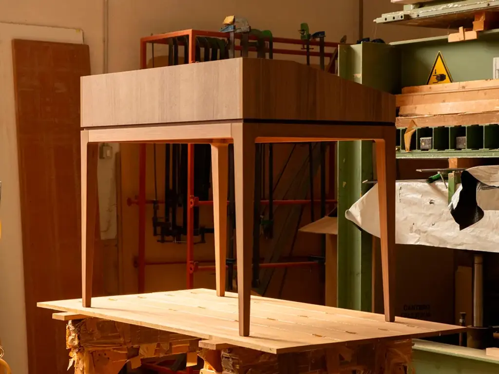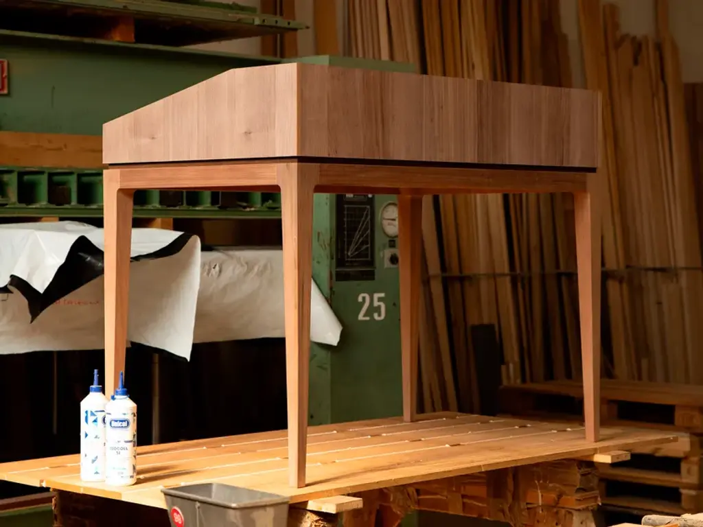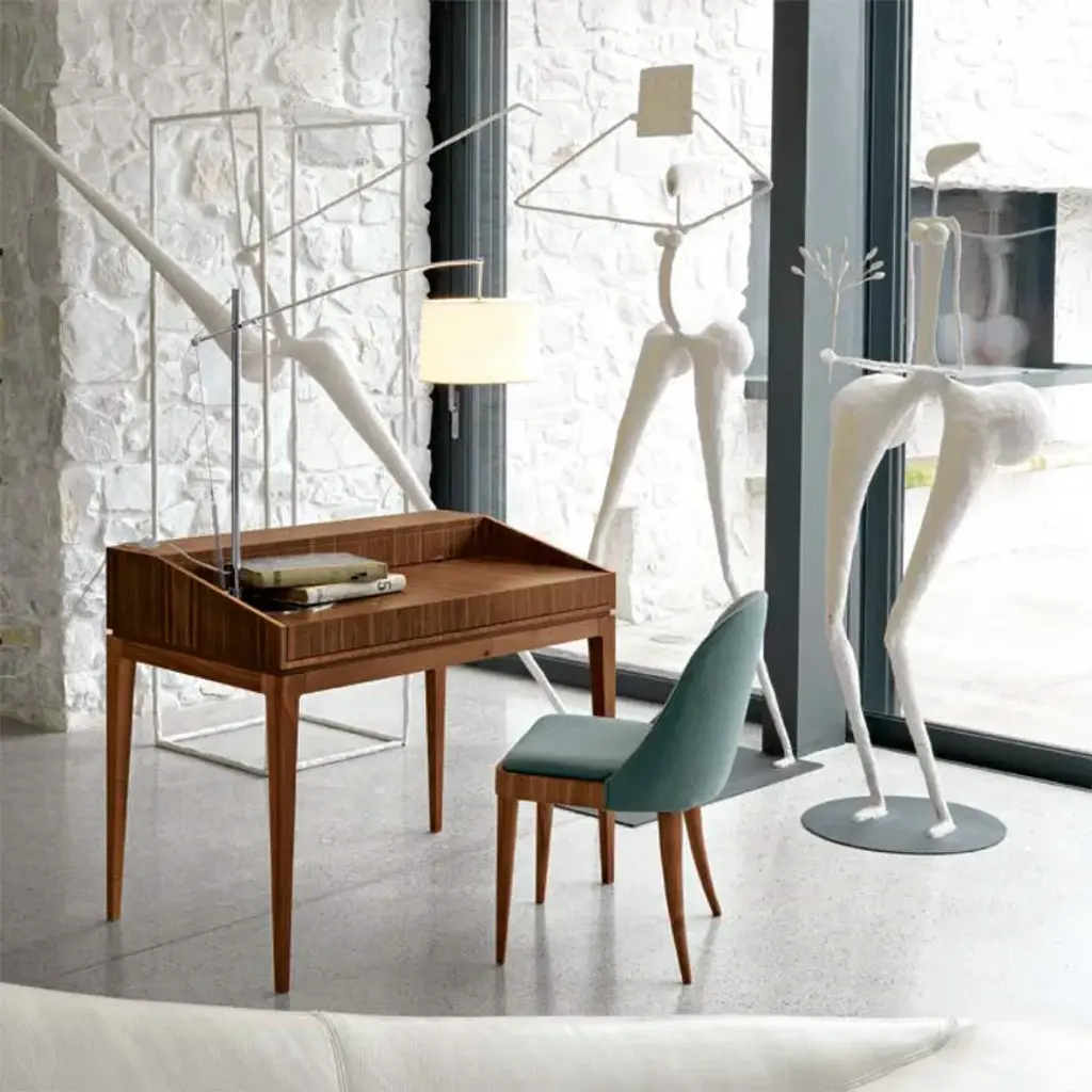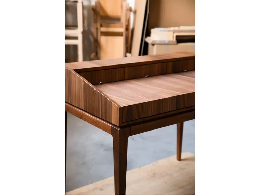 Desk G-151 Writing desk with top in walnut veneer blockboard. Structure and legs in solid walnut. Includes undertop storage compartment and three drawers.• Colour Natural Walnut• Finishing Oil