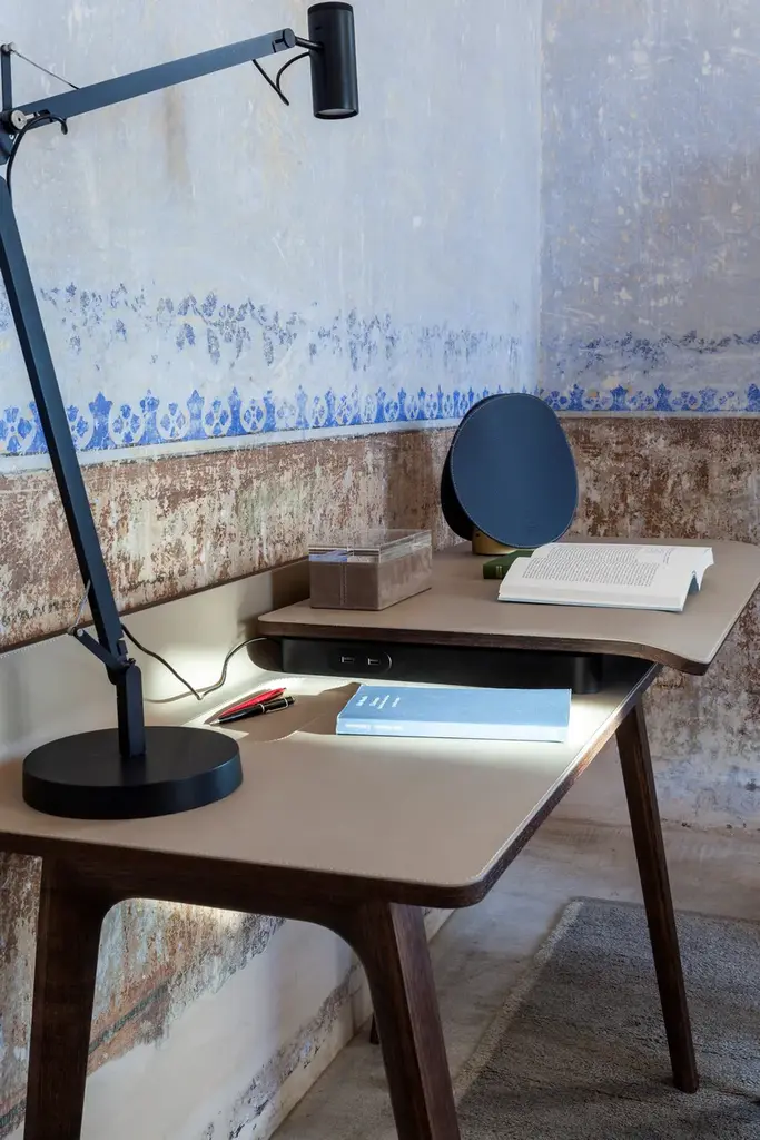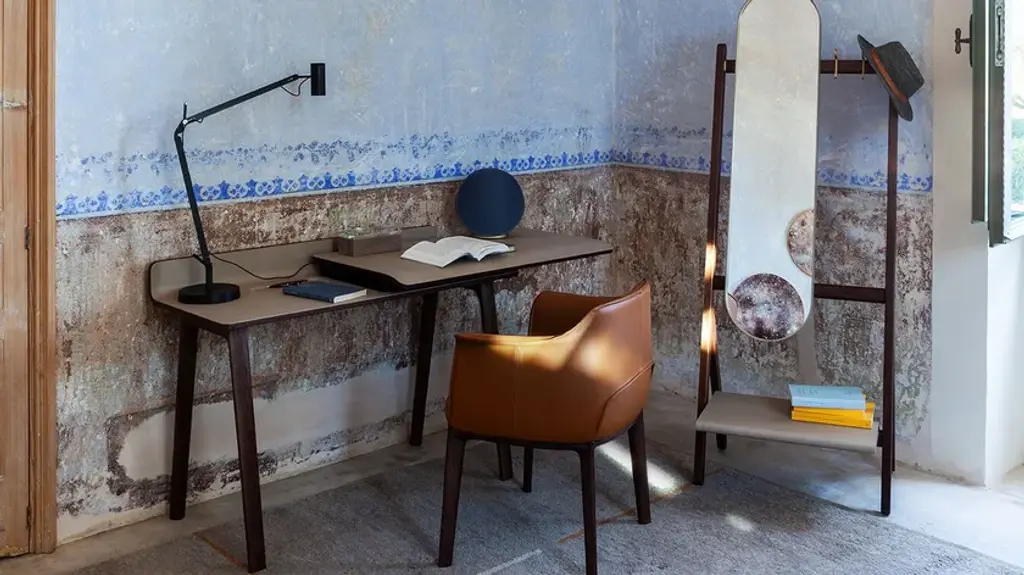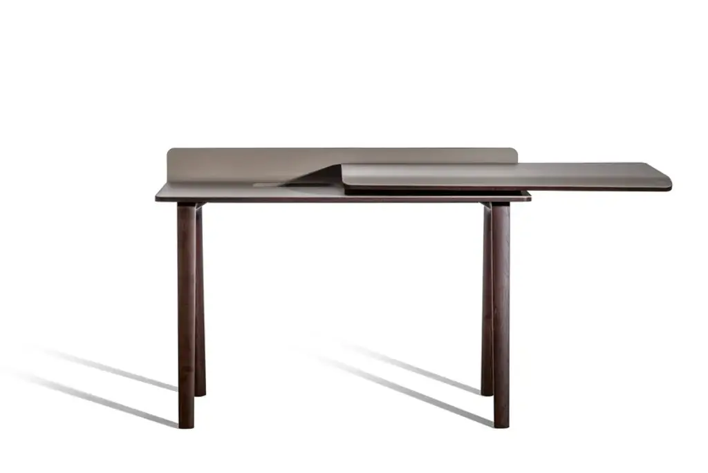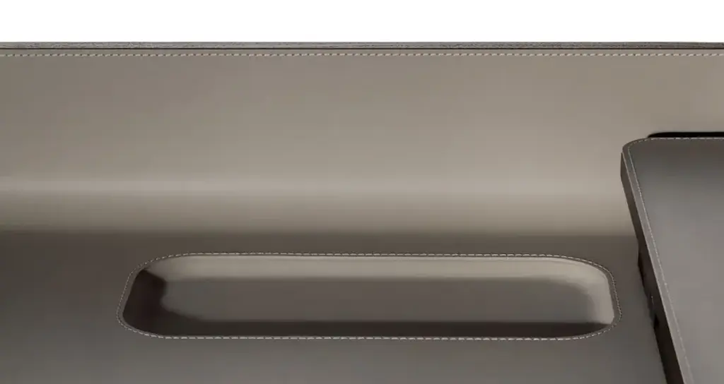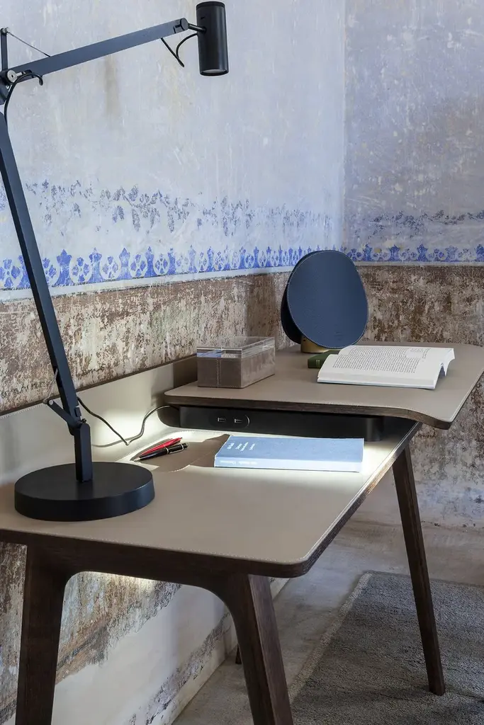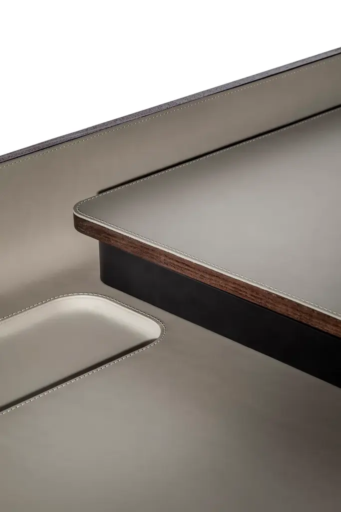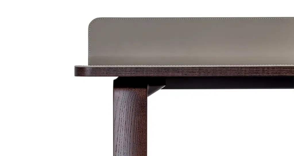In the world of Japanese calligraphy there is an invisible but deliberate continuity between points, lines and characters called “iren” (意連). This continuous motion ensures that there is a perfect harmony between the symbols even though they appear divided.Even in an era like ours, so dominated by technology, the spirit of the Iren desk lies not only in its quest for beauty and simplicity but above all in its revival of a natural and harmonious action: a desk that gives rise to new work scenarios and rituals in a naturally fluid relationship between body and object. Designer Kensaku Oshiro envisaged the Iren desk as a small domestic workstation that easily adapts to modern lifestyles. Thanks to a simple motion, two overlapping surfaces slide over each other to create new work and storage spaces. The beauty of the desk is not diminished by its electronic connections: its recharging and USB points are located in a metallic black box that supports the upper surface, wrapped in an elegant leather or saddle-leather cover. The gently sloping upper surface ensures a softer feel while also providing better support for the forearms. The wall version can have an LED light fitted at the back so the desk can be used when the natural light starts to dim.The Iren desk by Poltrona Frau comes in a free-standing version, with the desktop supported by a sawhorse base in solid ash, or a wall-mounted version, supported by brackets. The customer can choose whether the desktop slides left or right when making their order.