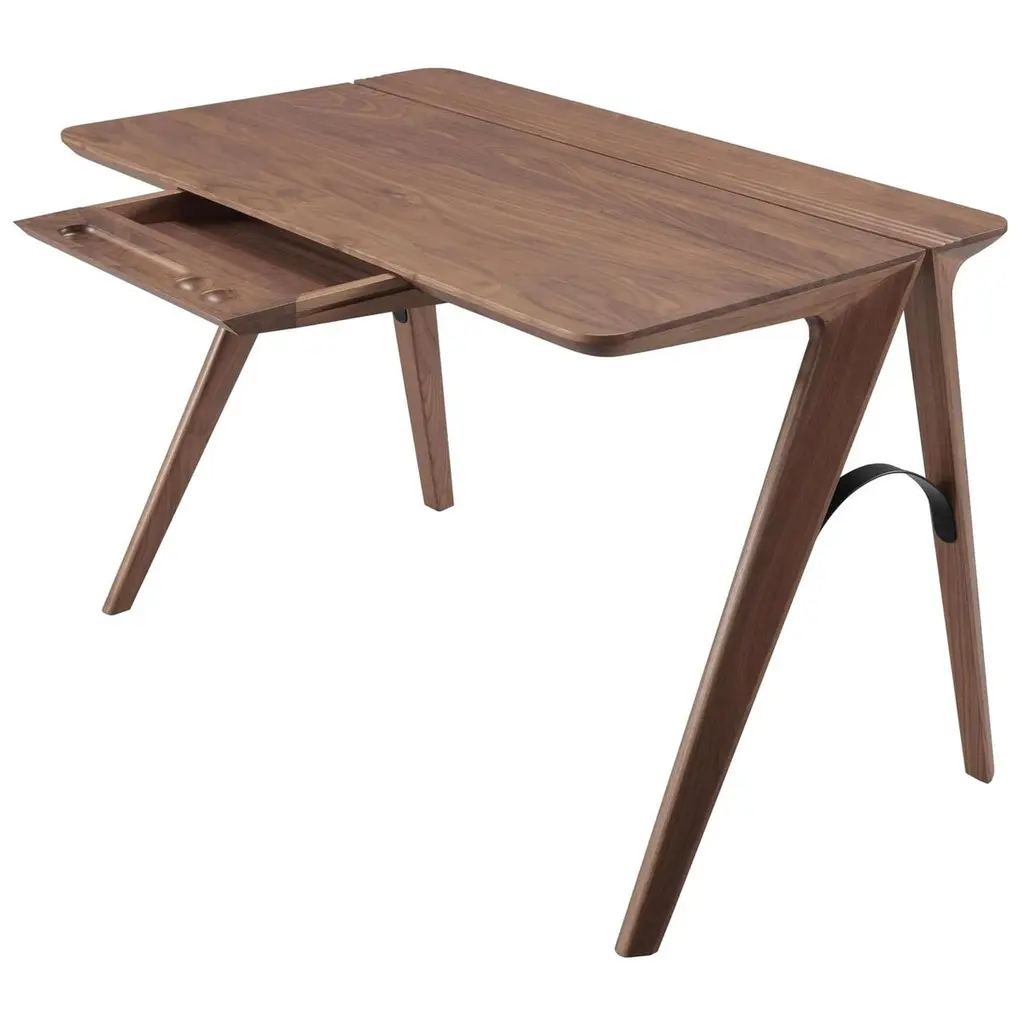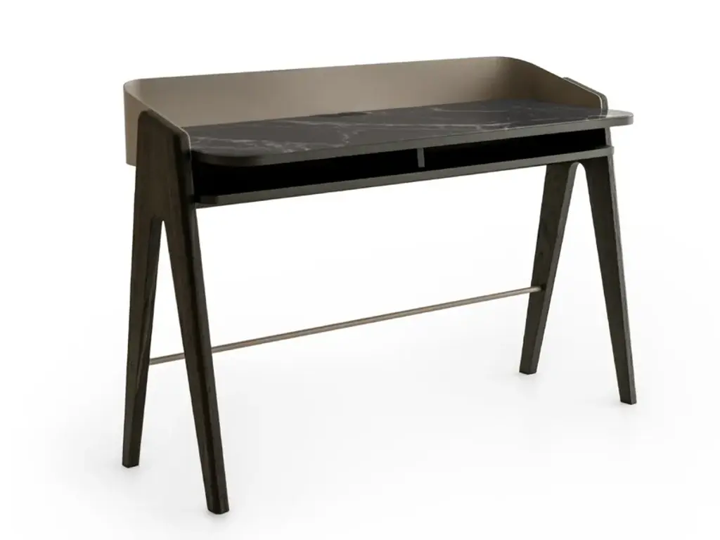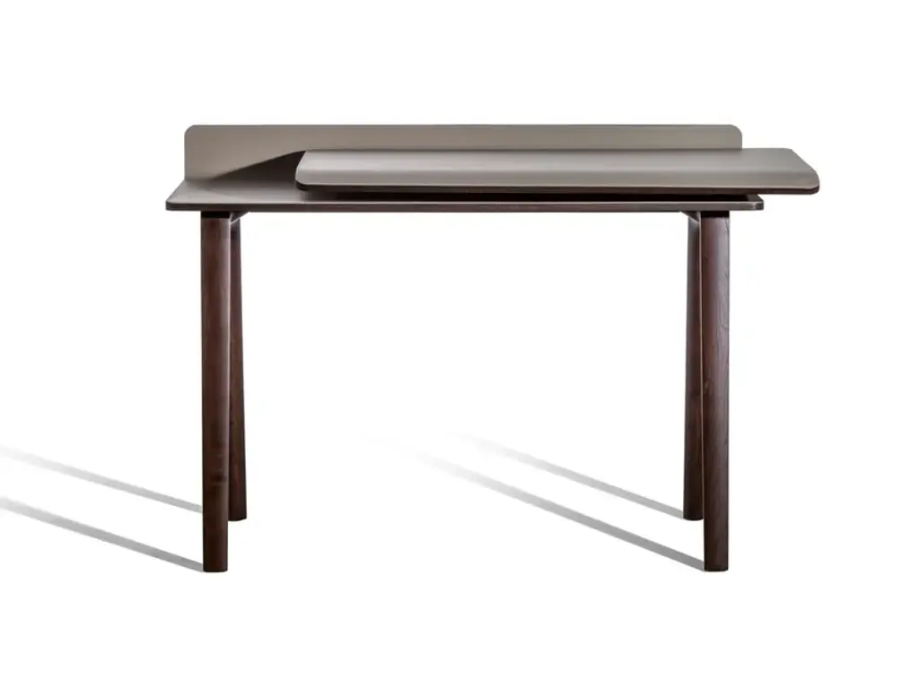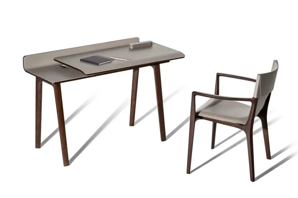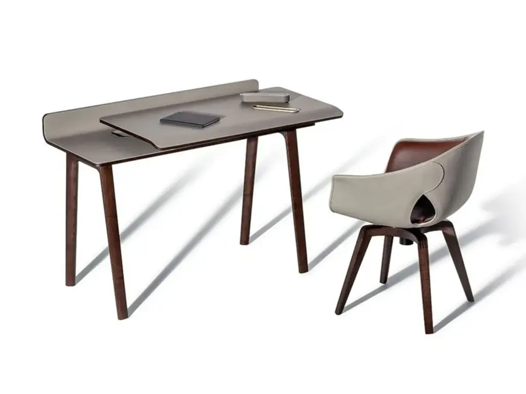 In the world of Japanese calligraphy there is an invisible but deliberate continuity between points, lines and characters called “iren” (意連). This continuous motion ensures that there is a perfect harmony between the symbols even though they appear divided.Even in an era like ours, so dominated by technology, the spirit of the Iren desk lies not only in its quest for beauty and simplicity but above all in its revival of a natural and harmonious action: a desk that gives rise to new work scenarios and rituals in a naturally fluid relationship between body and object. Designer Kensaku Oshiro envisaged the Iren desk as a small domestic workstation that easily adapts to modern lifestyles. Thanks to a simple motion, two overlapping surfaces slide over each other to create new work and storage spaces. The beauty of the desk is not diminished by its electronic connections: its recharging and USB points are located in a metallic black box that supports the upper surface, wrapped in an elegant leather or saddle-leather cover. The gently sloping upper surface ensures a softer feel while also providing better support for the forearms. The wall version can have an LED light fitted at the back so the desk can be used when the natural light starts to dim.The Iren desk by Poltrona Frau comes in a free-standing version, with the desktop supported by a sawhorse base in solid ash, or a wall-mounted version, supported by brackets. The customer can choose whether the desktop slides left or right when making their order.
