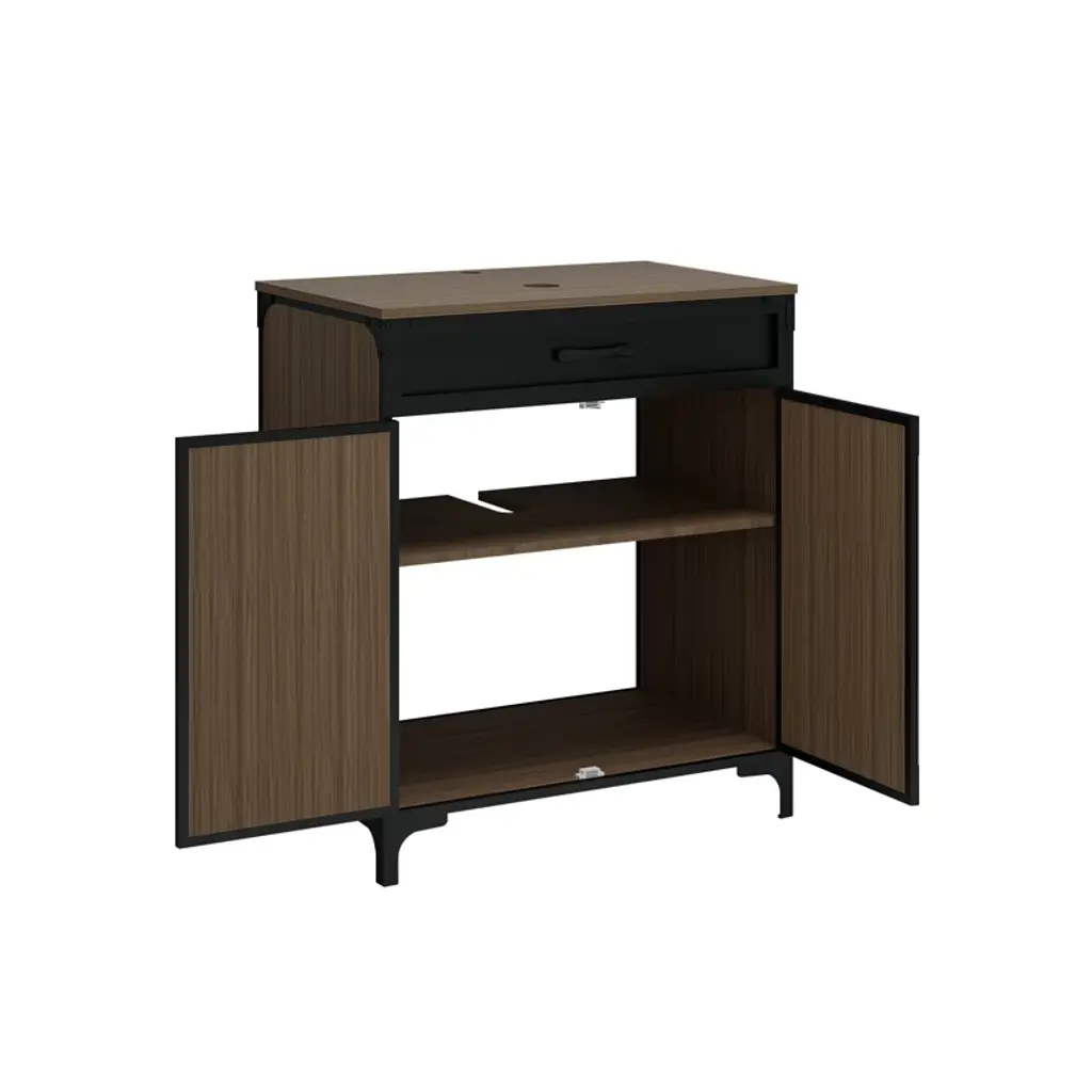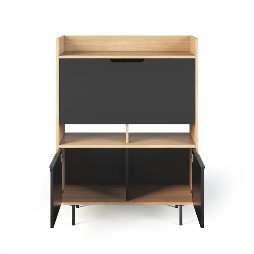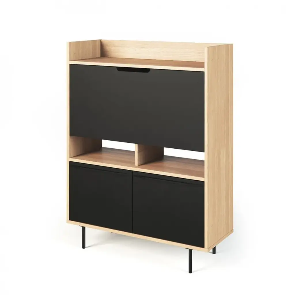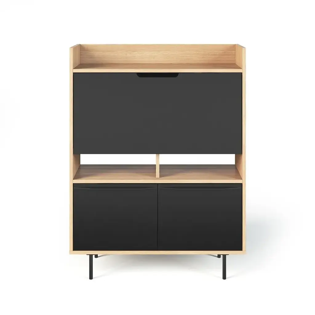 Lime is a writing desk made of chipboard. The work station has a drop-down door that converts into a working top, two open shelves, and two cabinets with adjustable shelving. An ideal solution for smaller spaces. Due to the height and depth, this unit has to be fixed to a wall (adapted fitings are included). The desk top can be support 5 kg.The pairing of oak and black finishes that gives the Lime product line its distinctive look manages to be both retro and sophisticated. Offering a dynamic range of multifunctional products with creative and unique storage options, the Lime family includes a sideboard, coffee table, console, and work station.