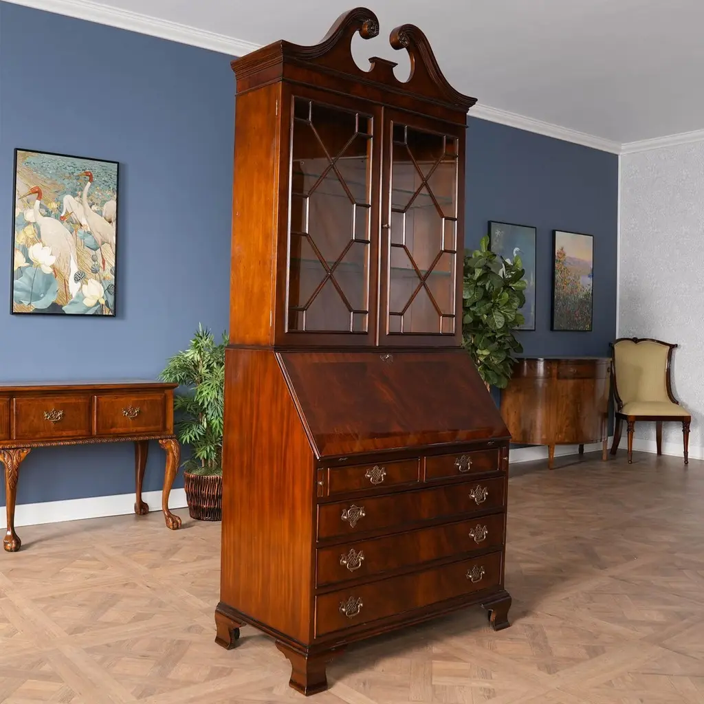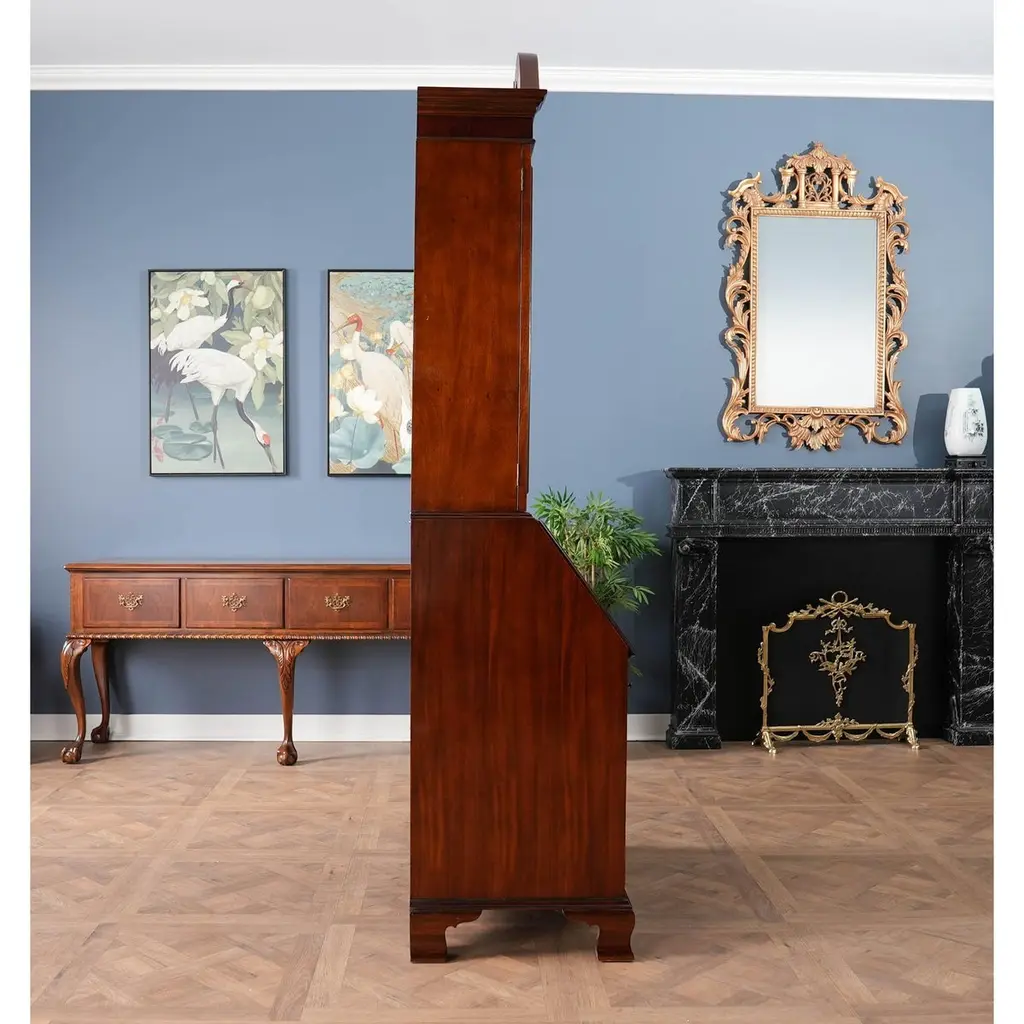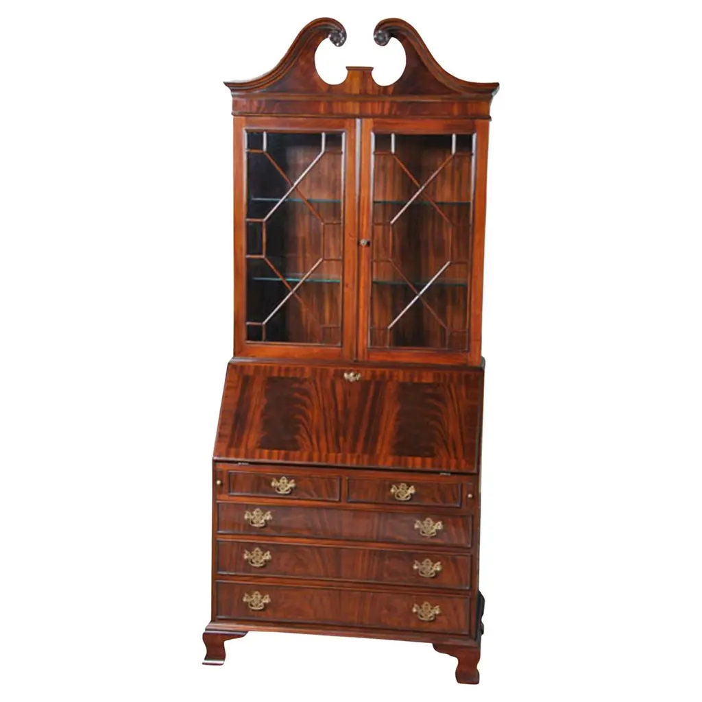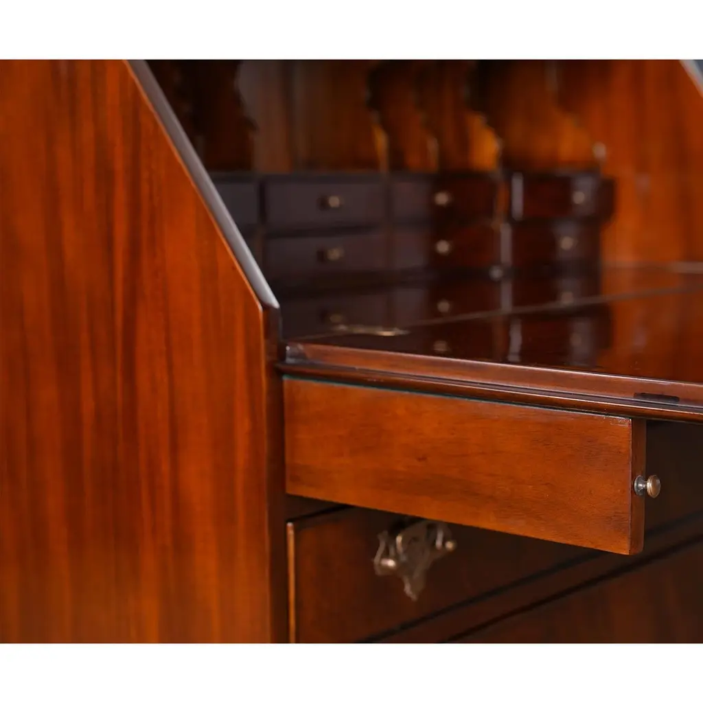 The Mahogany Secretary Desk from Niagara Furniture. This reproduction slant front writing desk has all the outstanding qualities of an antique original. Made of select mahogany solids and veneers the bookcase has a lovely hand carved swan neck, arched pediment. There are two glass shelves in the upper section of the bookcase. The desk section has four graduated drawers resting over top of shaped, ogee bracket feet. The interior of the desk is fitted with a bank of serpentine shaped drawers each of which is dovetailed and custom fit for it’s compartment. An extremely functional piece of furniture with useful storage space, this high quality Mahogany Secretary Desk is a work of art in itself. It will be the focal point in any room setting.Measures 40″w x 22″d x 91″h metric 102 56 231