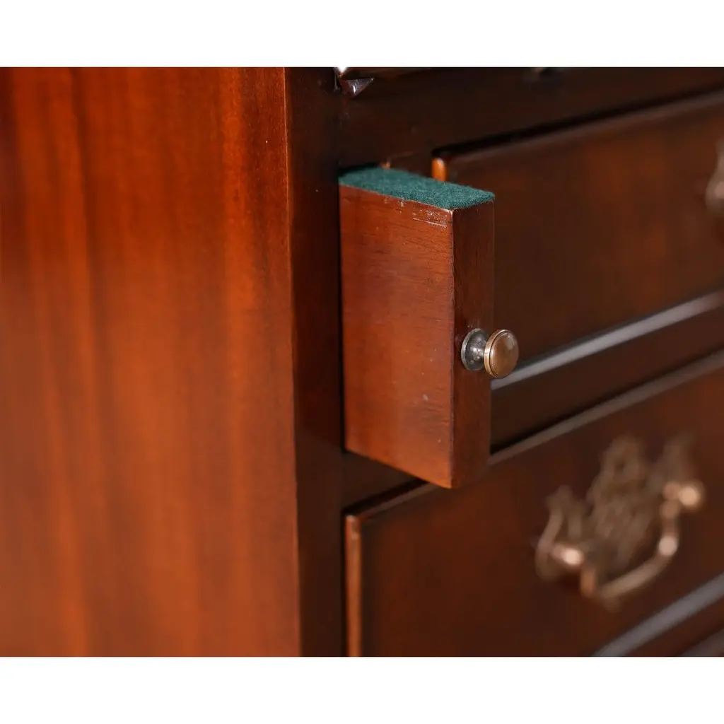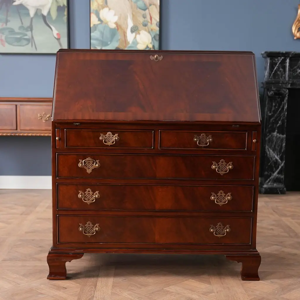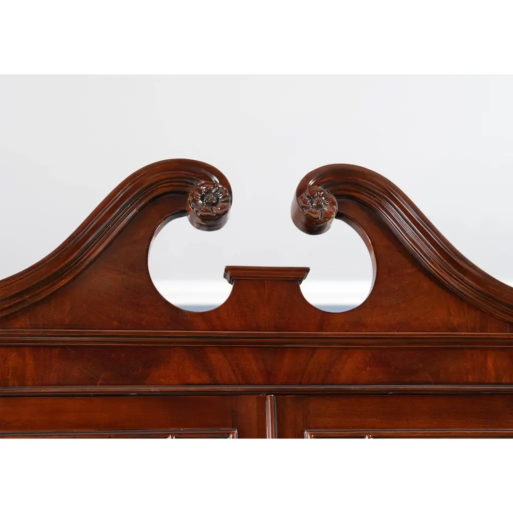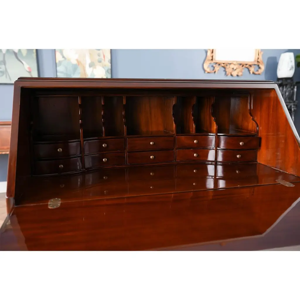The Mahogany Secretary Desk from Niagara Furniture. This reproduction slant front writing desk has all the outstanding qualities of an antique original. Made of select mahogany solids and veneers the bookcase has a lovely hand carved swan neck, arched pediment. There are two glass shelves in the upper section of the bookcase. The desk section has four graduated drawers resting over top of shaped, ogee bracket feet. The interior of the desk is fitted with a bank of serpentine shaped drawers each of which is dovetailed and custom fit for it’s compartment. An extremely functional piece of furniture with useful storage space, this high quality Mahogany Secretary Desk is a work of art in itself. It will be the focal point in any room setting.Measures 40″w x 22″d x 91″h metric 102 56 231