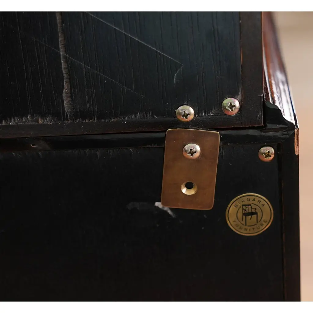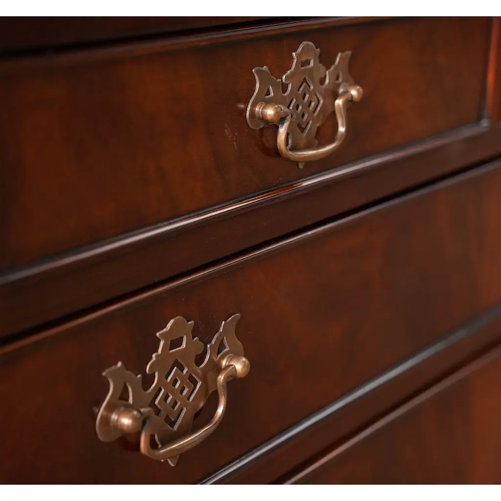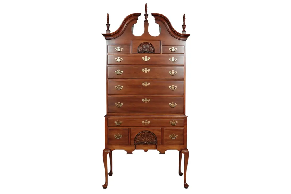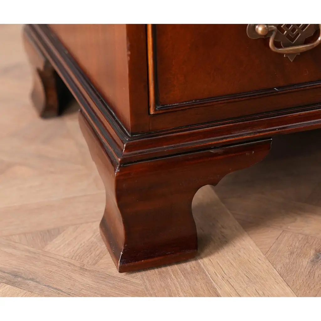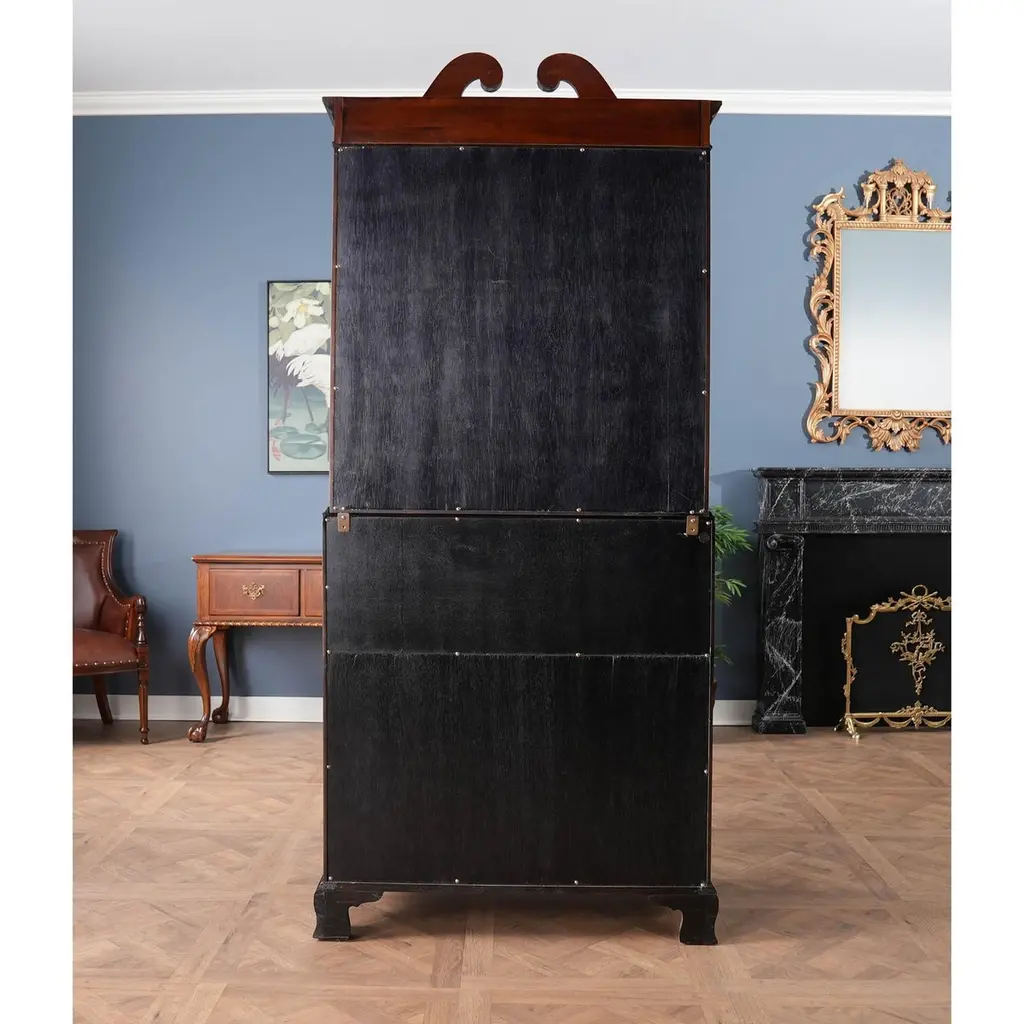 The Mahogany Secretary Desk from Niagara Furniture. This reproduction slant front writing desk has all the outstanding qualities of an antique original. Made of select mahogany solids and veneers the bookcase has a lovely hand carved swan neck, arched pediment. There are two glass shelves in the upper section of the bookcase. The desk section has four graduated drawers resting over top of shaped, ogee bracket feet. The interior of the desk is fitted with a bank of serpentine shaped drawers each of which is dovetailed and custom fit for it’s compartment. An extremely functional piece of furniture with useful storage space, this high quality Mahogany Secretary Desk is a work of art in itself. It will be the focal point in any room setting.Measures 40″w x 22″d x 91″h metric 102 56 231