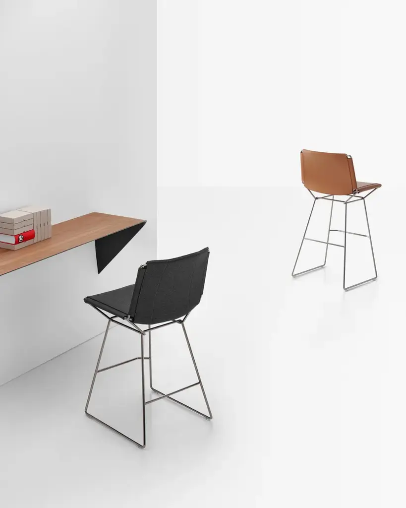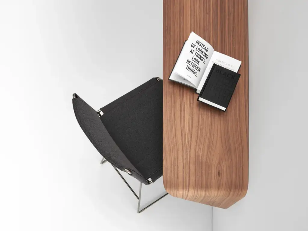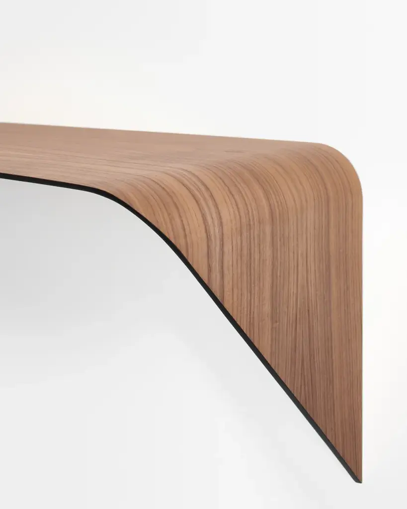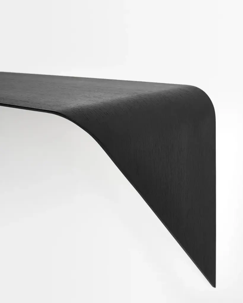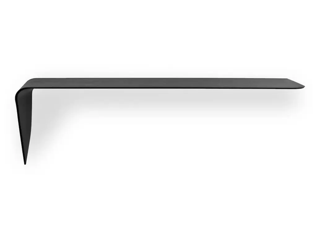 Shelf and/or wall-mounted desk. The minimal shape and tapered thickness create a product with a unique, highly iconic design.Its key features are its formal strength and the versatility with which it can be easily integrated with other furnishings.It is an “accent” that can interact spontaneously with its surroundings and be used in many different ways.The shelf is in medium density fibreboard with varying thicknesses and moulded into a curve.It is attached to the wall with a bracket.FinishesMatt lacquered white, canaletto walnut and black ash.DimensionsLength 134 cm, depth 40 cm, height 44 cm.For further information about specs, please refer to the technical section at the end of the price list(tables of materials/colours).