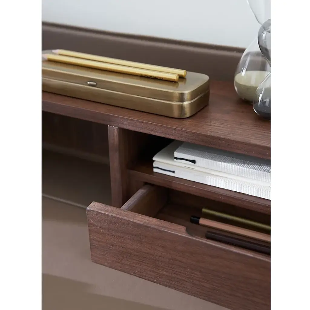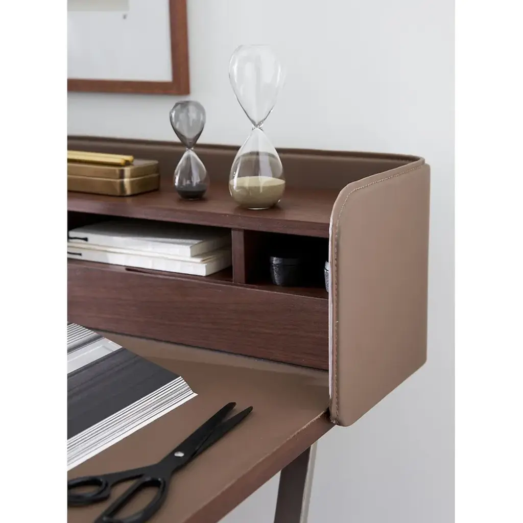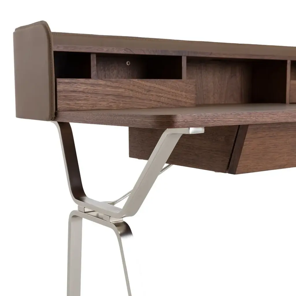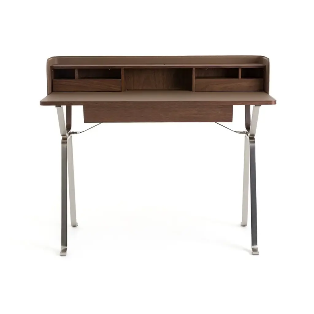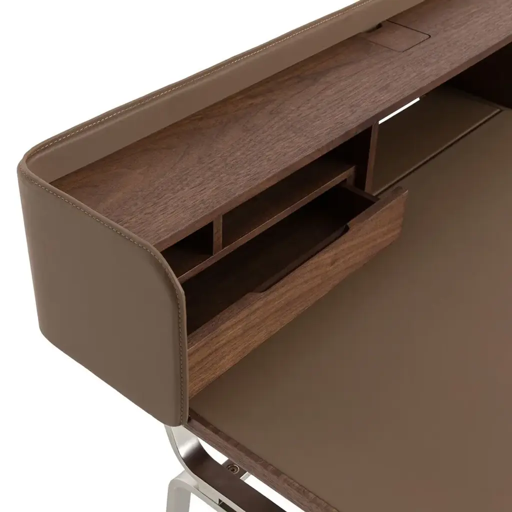 Elegance is the watchword of the Nelsen office. A unique furnishing accessory that combines a walnut and Italian leather top with a flat iron base, matte satin nickel finish.Behind its elegant appearance hides a functional desk with three drawers, one of which is reserved for a computer keyboard, as well as several niches and a cable holder. An AMPM creation.Walnut veneered MDF structure, covered in sheepskin, correct grain, aniline finish, chrome tanning. FSC® certified woodFlat iron metal base with matt satin nickel finish2 small drawers and 1 undercounter drawer with soft closing systemNiches and cable entry holeAllemande brand hardware