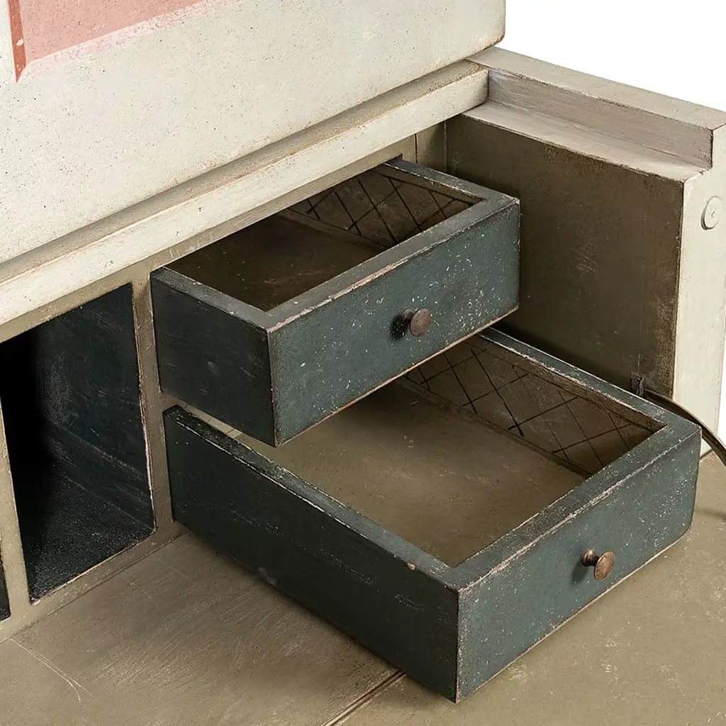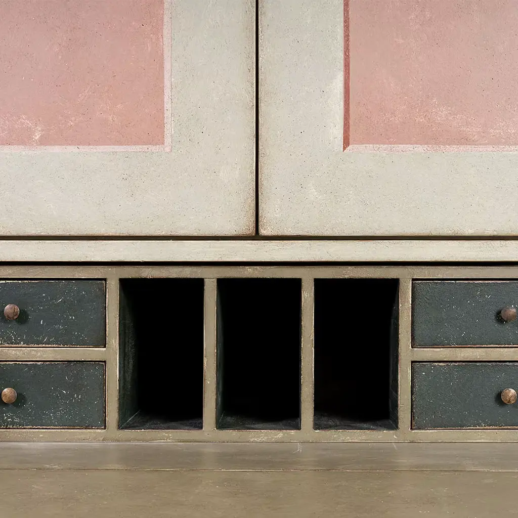 The Pesaro Secretary Dresser is a refined tribute to historical artistry and meticulous craftsmanship, drawing inspiration from the intricate mosaics of the Basilica di San Marco. Its soft pink and light green exterior contrasts beautifully with a rich dark green interior, creating a visually captivating balance that adds depth and character to any space. Handcrafted from solid beech wood, each cabinet is a testament to traditional Venetian techniques from the 18th century, with hand-painted details and delicate antiquing effects that lend a timeless, storied charm. Beyond its elegant façade, the Pesaro offers generous storage through a thoughtfully arranged combination of drawers and shelves, perfect for organizing documents, stationery, or personal treasures. Customization options are available for size, color, and decorative elements. Please contact the Concierge for more information.