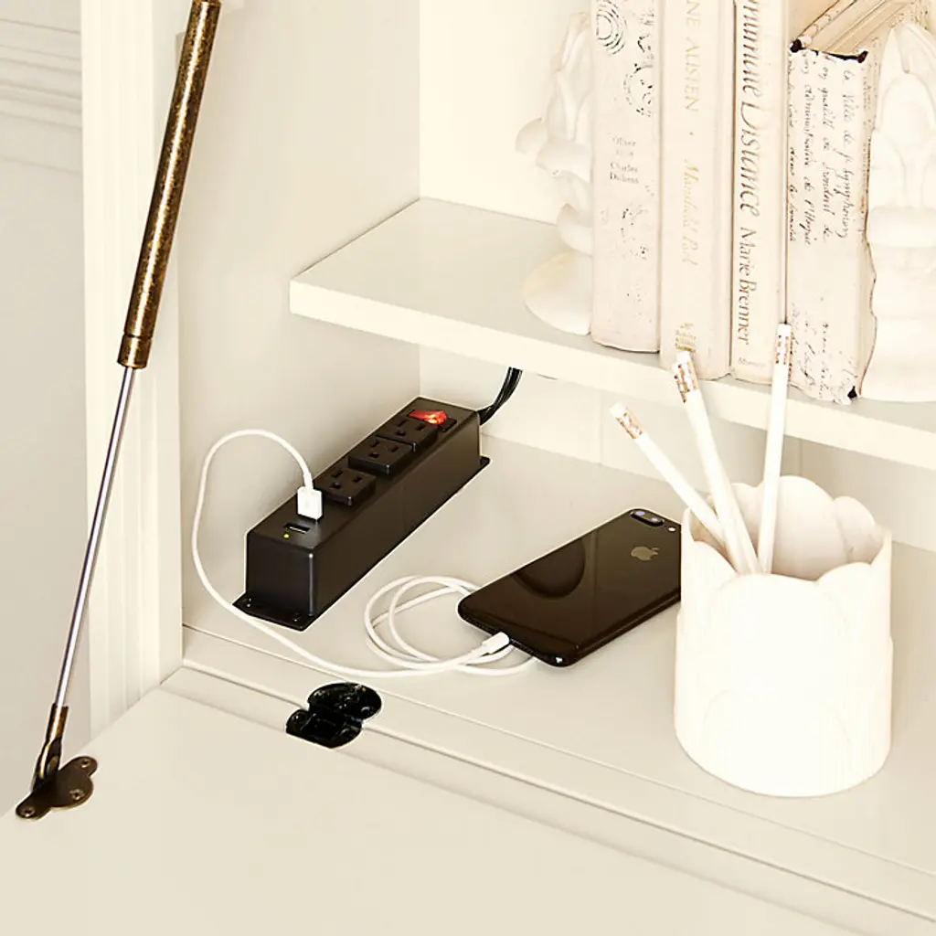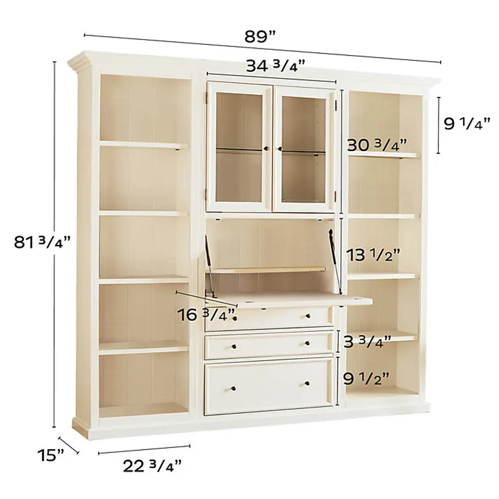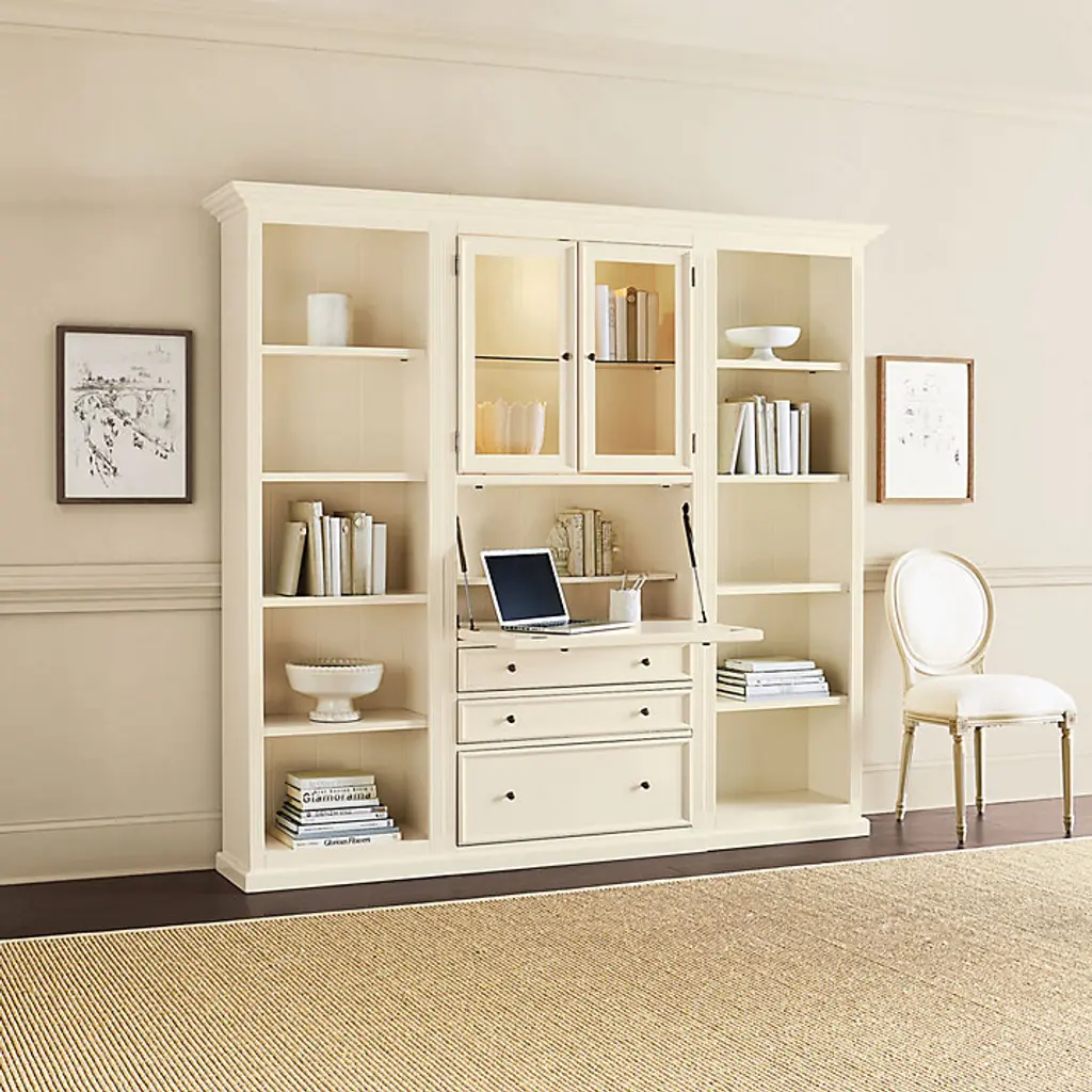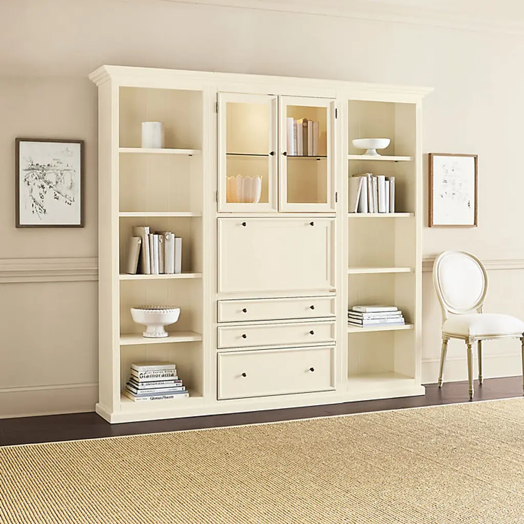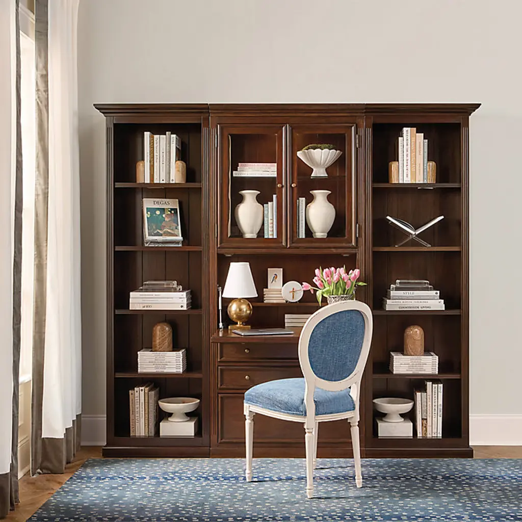 Our Tuscan home office furniture blends modern versatility with the classic looks of a custom built-in. Each piece in the collection works with every other, so you can design a workstation or storage solution to fit your space and needs perfectly. Perfect for a small home office or tucked along an open wall in the living area or guest room, the 3-Piece Tuscan Secretary Group blends classic styling with hard-working modern utility. Upper Cabinet has one adjustable glass shelf and a built-in 3-way light for display that adjusts with a simple touch. Drop-down desk features a power strip with three plug-ins and two USB ports, plus a removable second shelf inside. Left and Right Bookcases feature paneled interiors, one fixed shelf, and three adjustable shelves each. Two storage drawers and bottom file drawer (for legal or letter size files) open on full-extension glides. Tuscan 3-Piece Secretary Desk Group features: