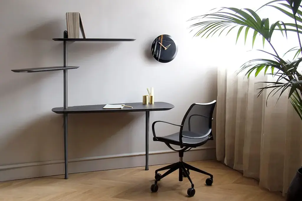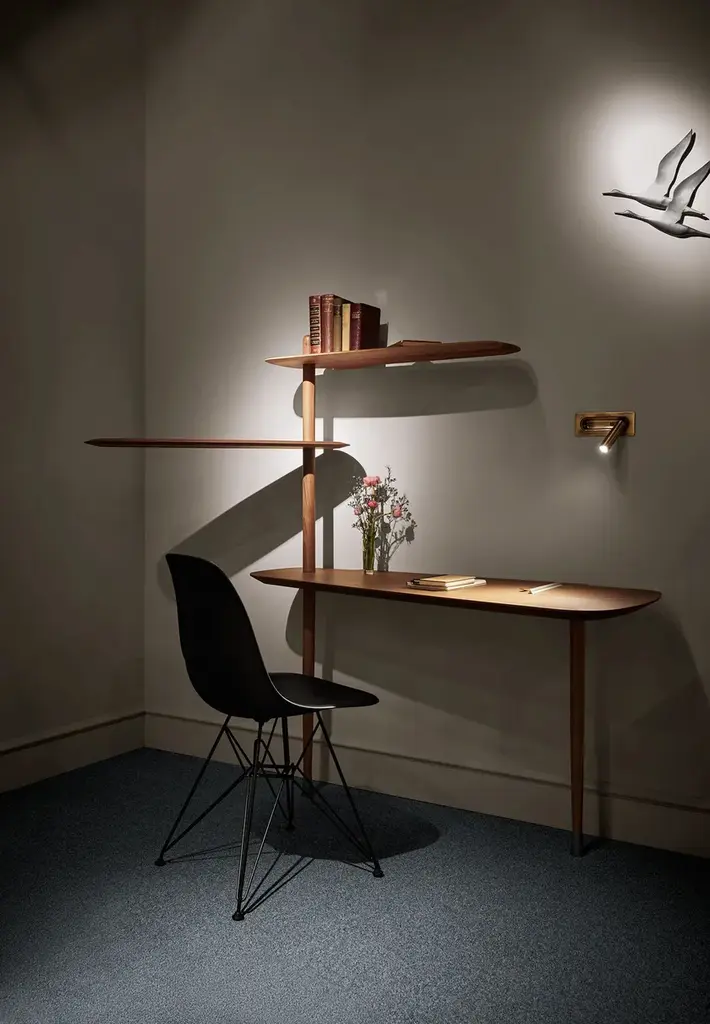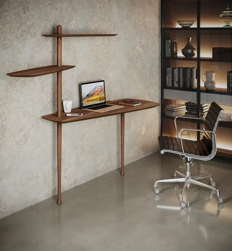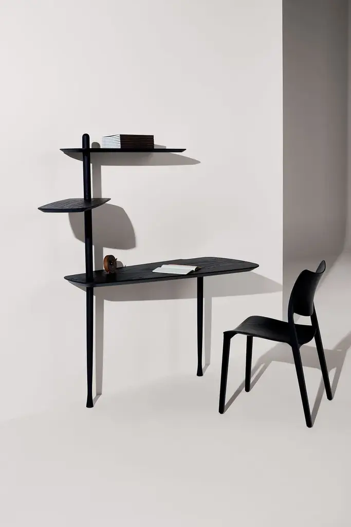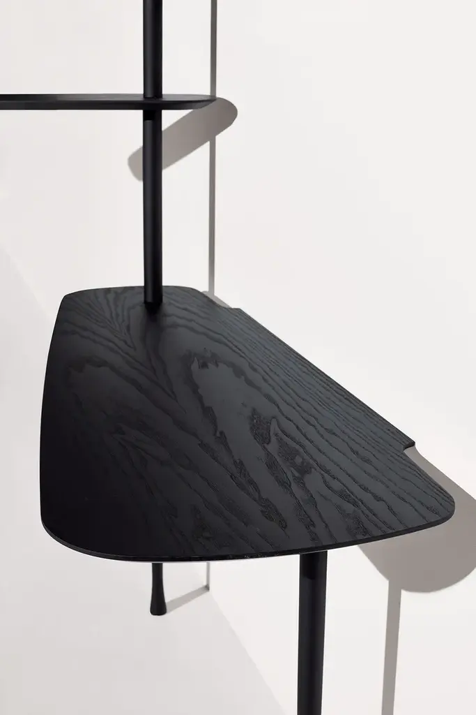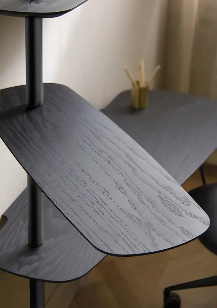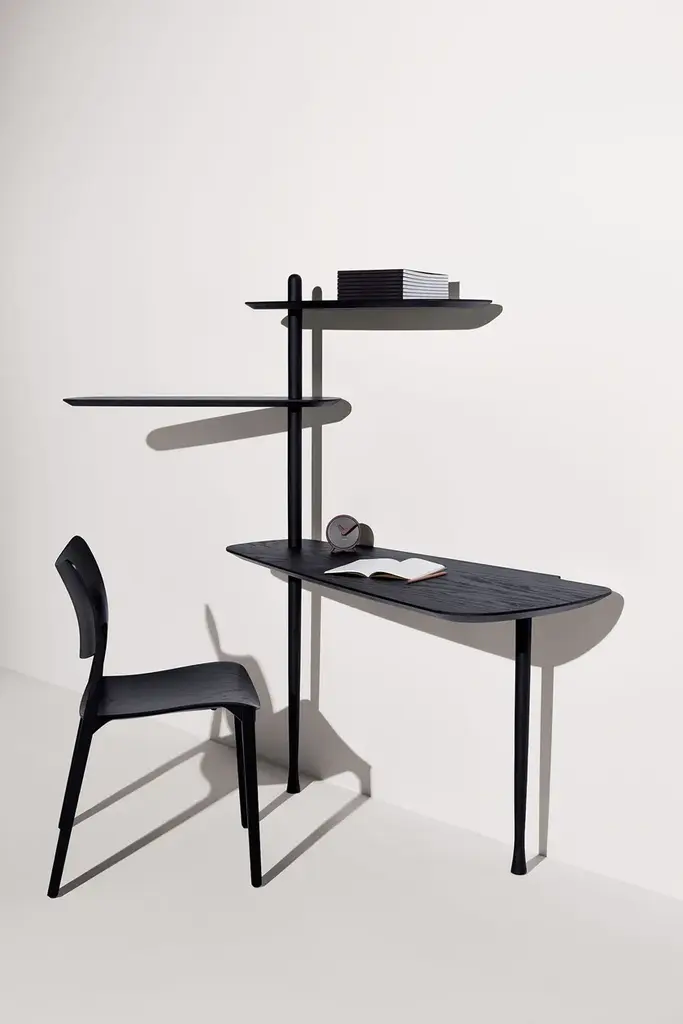 UNICA is a MDF desk with bookcase. Available finishes: walnut veneer or black ash veneer.Stylish and complete minimalist desk. It reduces its elements to the indispensable, remaining only with two legs. One of them, rises to incorporate two practical rotating shelves. The table, attached to the wall, becomes the perfect place for inspiration, whether at home or in a hotel room.Unica Collection is born with the aim of the user to participate in the design of the furniture, offering in a simple and intuitive way infinite possibilities.