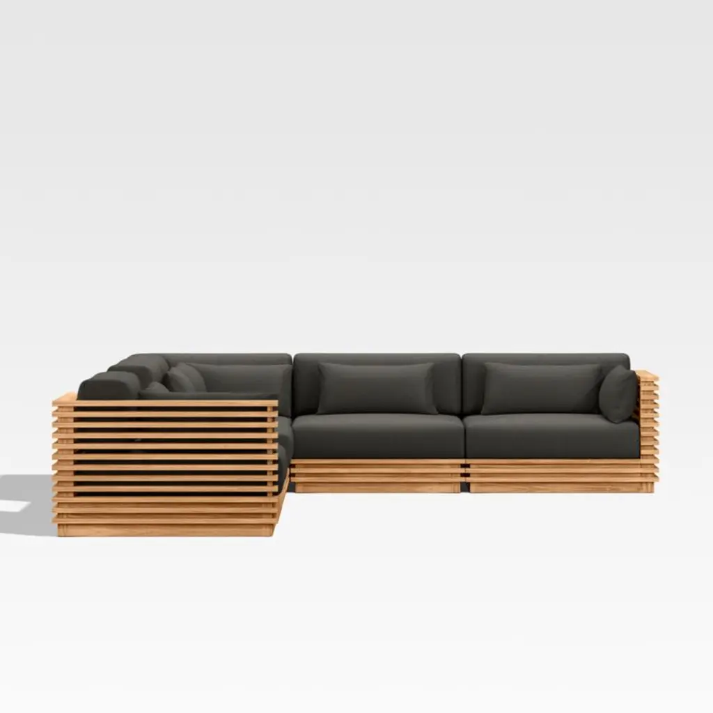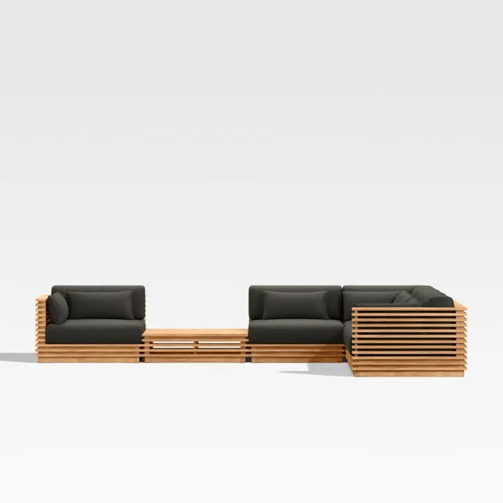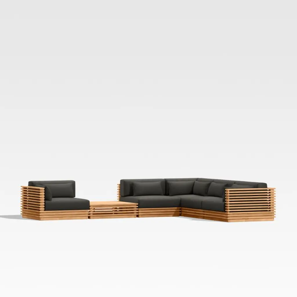 Modern, modular and made for the outdoors, our Batten sectional riffs on our popular indoor storage and bedroom collection to outfit your alfresco living space with clean lines and real teak. The bold slats of sustainable teak that define the linear profile and minimalist silhouette of the sectional componentsright- and left-arm chairs, two armless chairs, corner and one side coffee tableline up seamlessly to form the L-shaped sectional. Layered with charcoal grey seat, back and lumbar cushions and throw pillows covered in UV-resistant polyester, the six-piece sectional sits deep and comfortable day into night.By choosing FSC®-certified furniture, you are supporting responsible management of the world's forests.If left uncovered and untreated, natural teak will patina to a beautiful silvery grey.