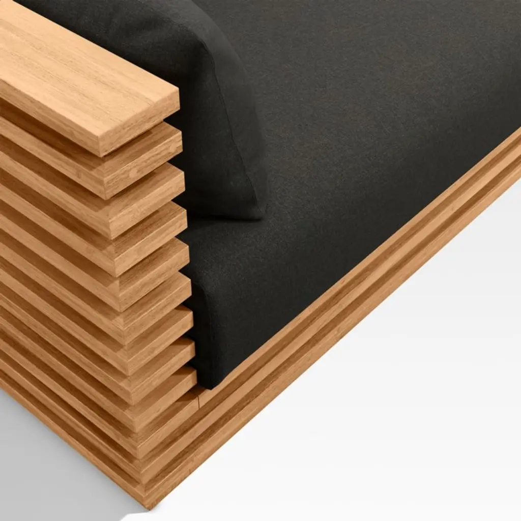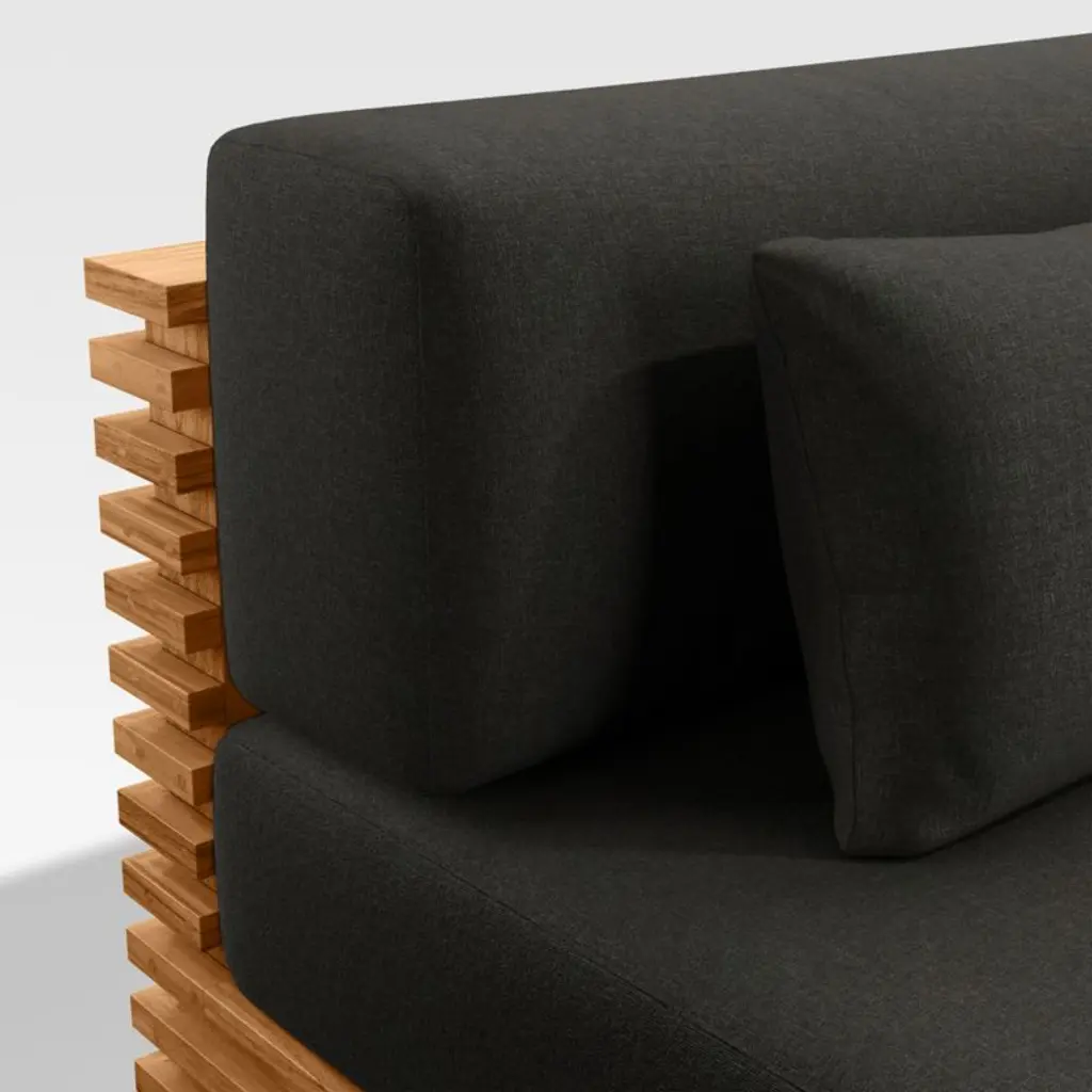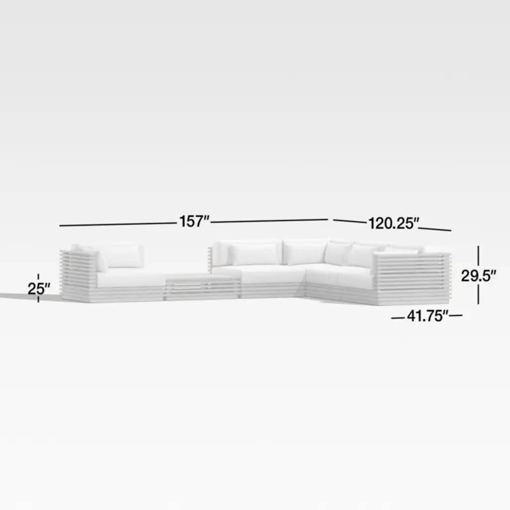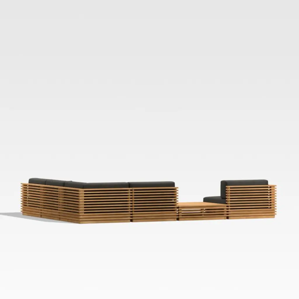Modern, modular and made for the outdoors, our Batten sectional riffs on our popular indoor storage and bedroom collection to outfit your alfresco living space with clean lines and real teak. The bold slats of sustainable teak that define the linear profile and minimalist silhouette of the sectional componentsright- and left-arm chairs, two armless chairs, corner and one side coffee tableline up seamlessly to form the L-shaped sectional. Layered with charcoal grey seat, back and lumbar cushions and throw pillows covered in UV-resistant polyester, the six-piece sectional sits deep and comfortable day into night.By choosing FSC®-certified furniture, you are supporting responsible management of the world's forests.If left uncovered and untreated, natural teak will patina to a beautiful silvery grey.