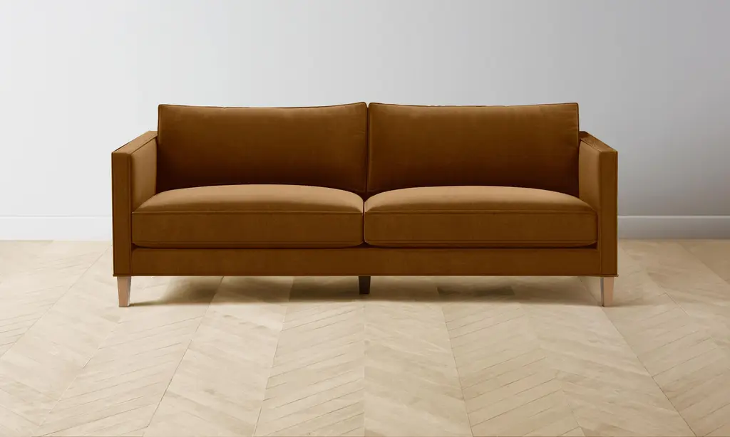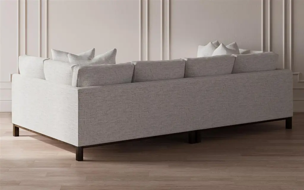 Nestle into the cozy comfort of the 116” Adelle double bumper sectional. With an extra-deep seat, gently angled arms, and large throw pillows, it's the ultimate lounge sectional for any TV room. A beautiful wood rail grounds the timeless transitional silhouette. Plush, comfortable seating is soft yet supportive, with a foam core surrounded by a blend of fiber, down, and feather fill. Choose from a variety of upholstery options, including linen, velvet, and performance fabrics.