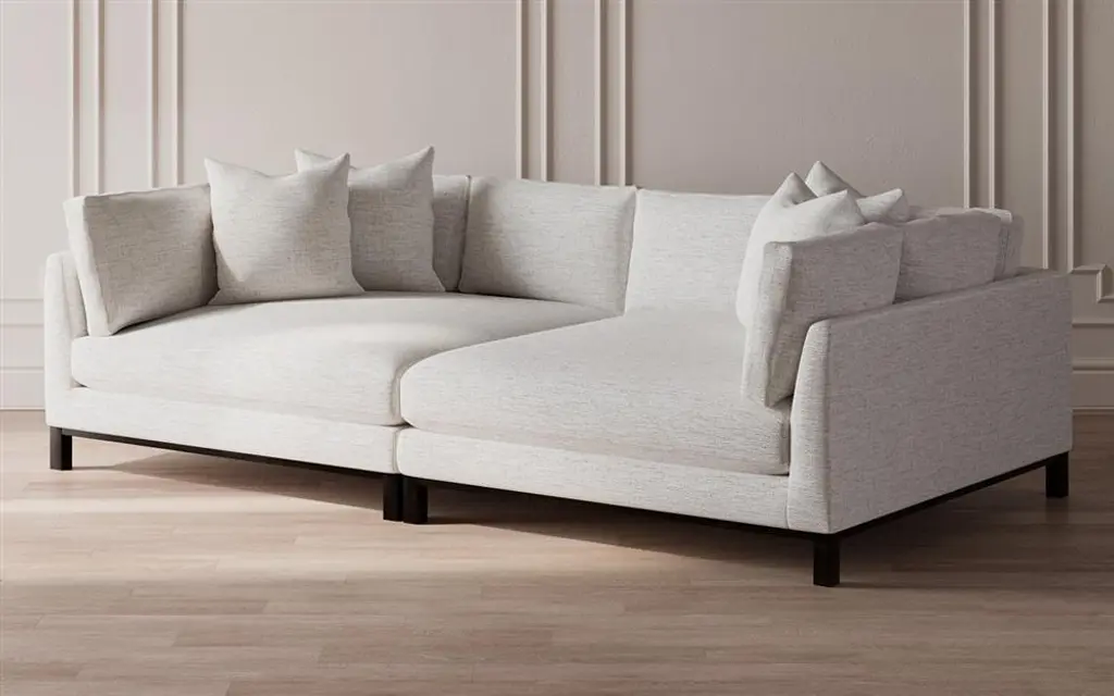 Nestle into the cozy comfort of the 116” Adelle double bumper sectional. With an extra-deep seat, gently angled arms, and large throw pillows, it's the ultimate lounge sectional for any TV room. A beautiful wood rail grounds the timeless transitional silhouette. Plush, comfortable seating is soft yet supportive, with a foam core surrounded by a blend of fiber, down, and feather fill. Choose from a variety of upholstery options, including linen, velvet, and performance fabrics.