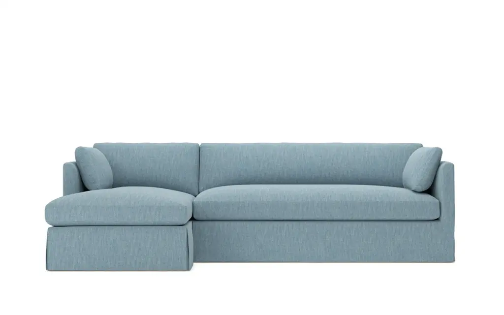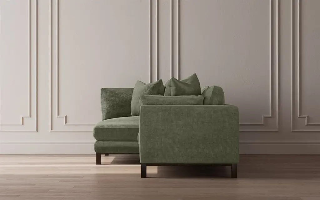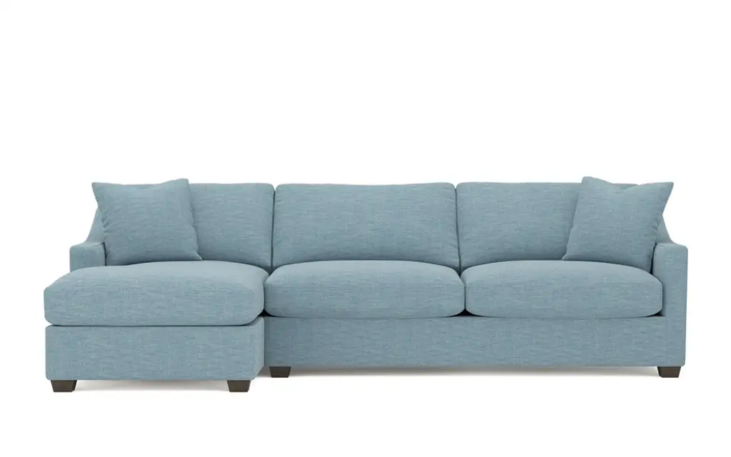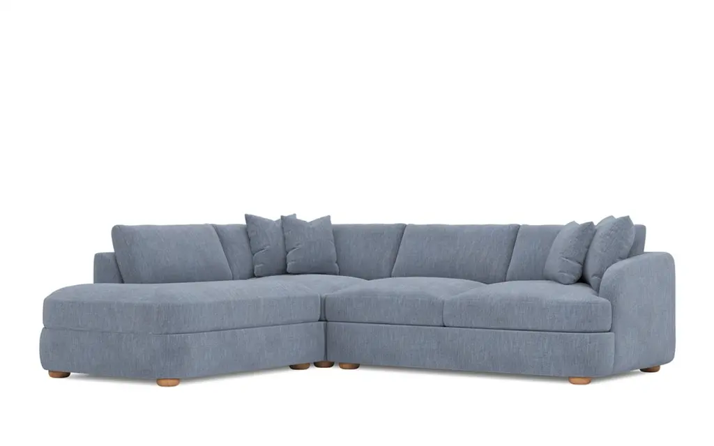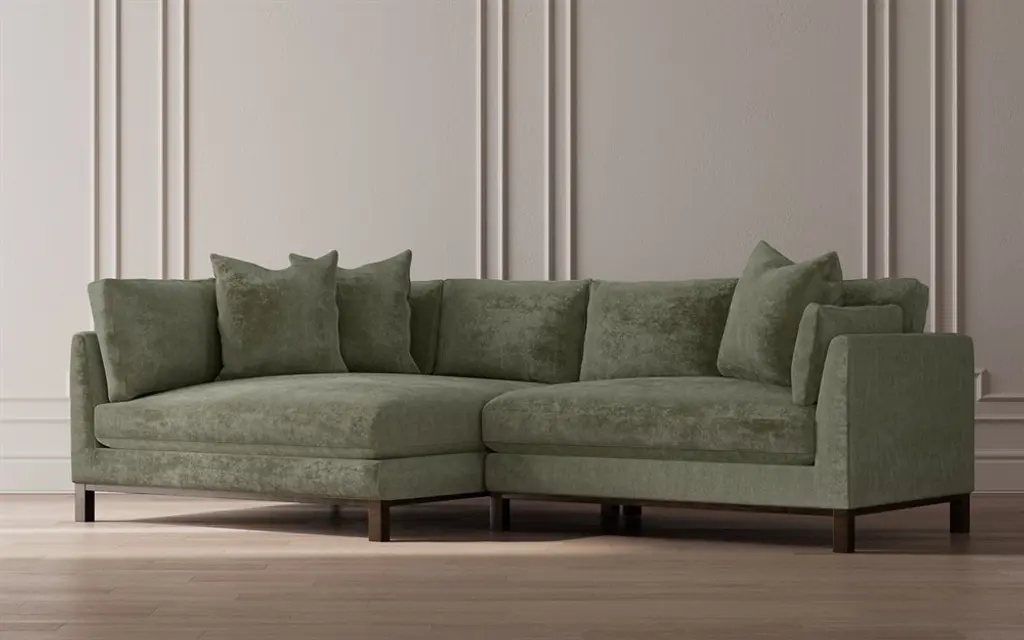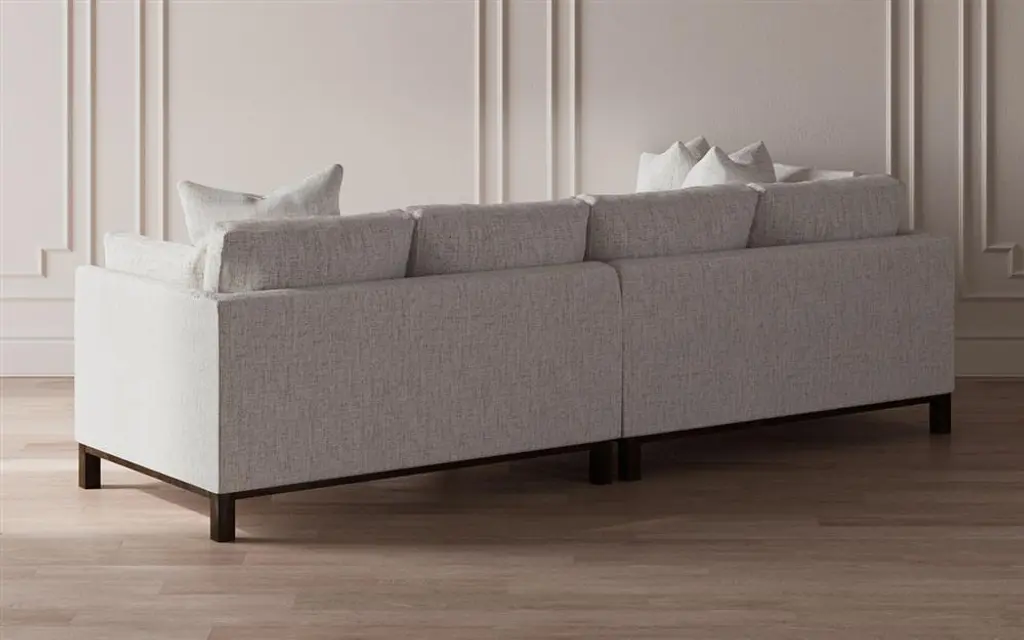 Designed with generous proportions, gently angled arms, and large throw pillows, the left 116” Adelle bumper sectional invites relaxation. A beautiful wood rail grounds the timeless transitional silhouette. Plush, comfortable seating is soft yet supportive, with a foam core surrounded by a blend of fiber, down, and feather fill. Choose from a variety of upholstery options, including linen, velvet, and performance fabrics.