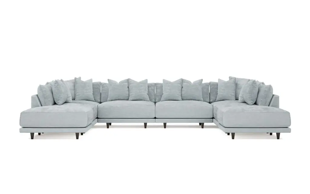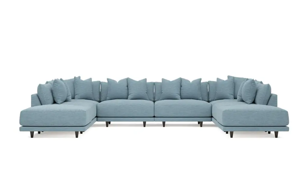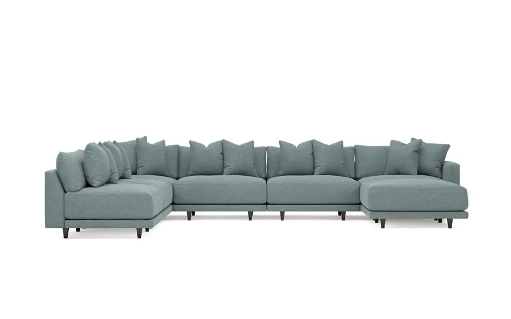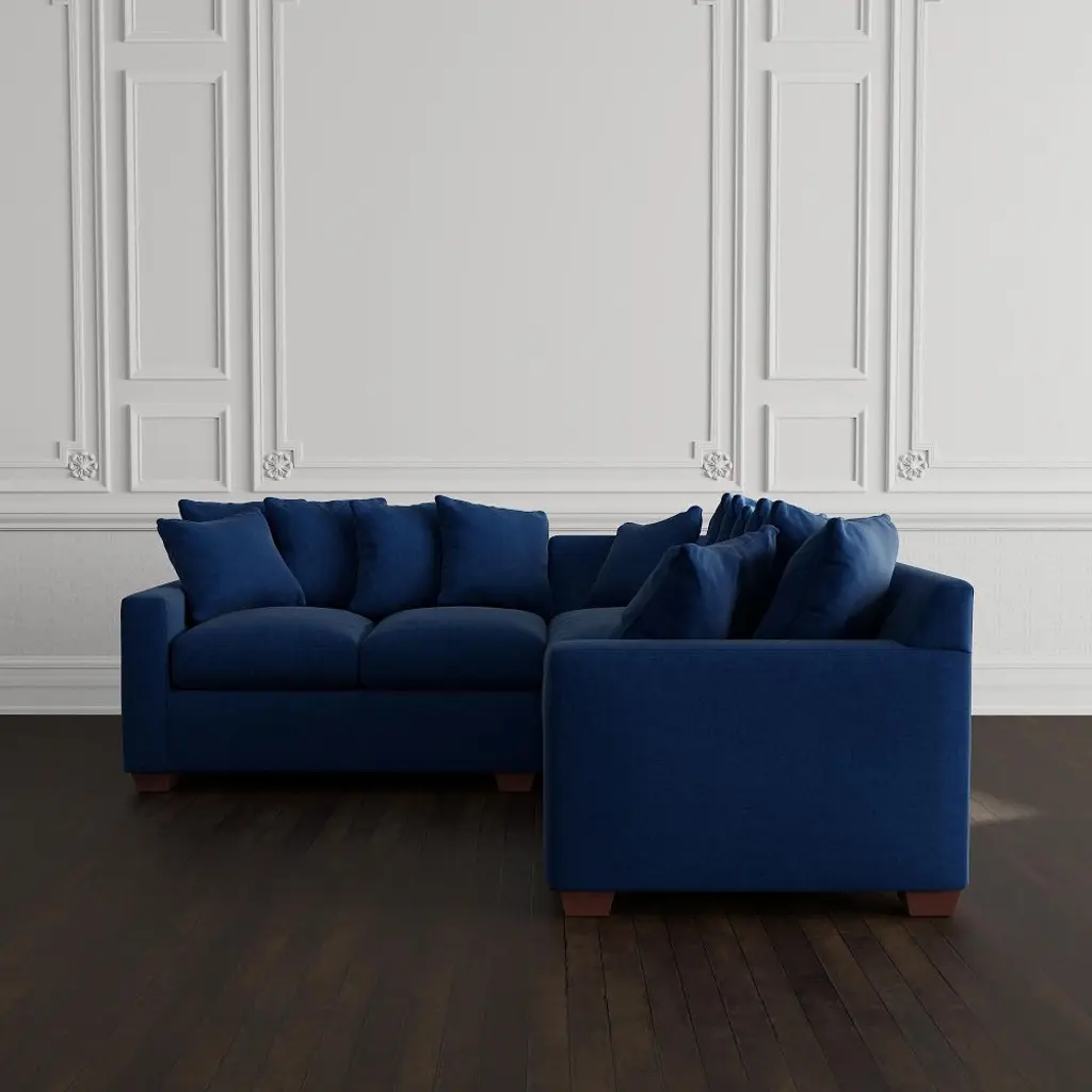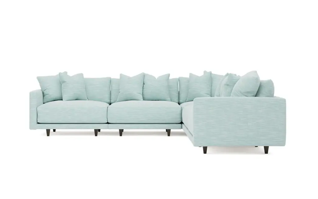Designed with generous proportions, gently angled arms, and large throw pillows, the left 116” Adelle bumper sectional invites relaxation. A beautiful wood rail grounds the timeless transitional silhouette. Plush, comfortable seating is soft yet supportive, with a foam core surrounded by a blend of fiber, down, and feather fill. Choose from a variety of upholstery options, including linen, velvet, and performance fabrics.