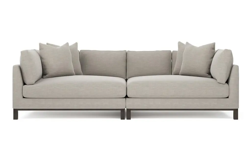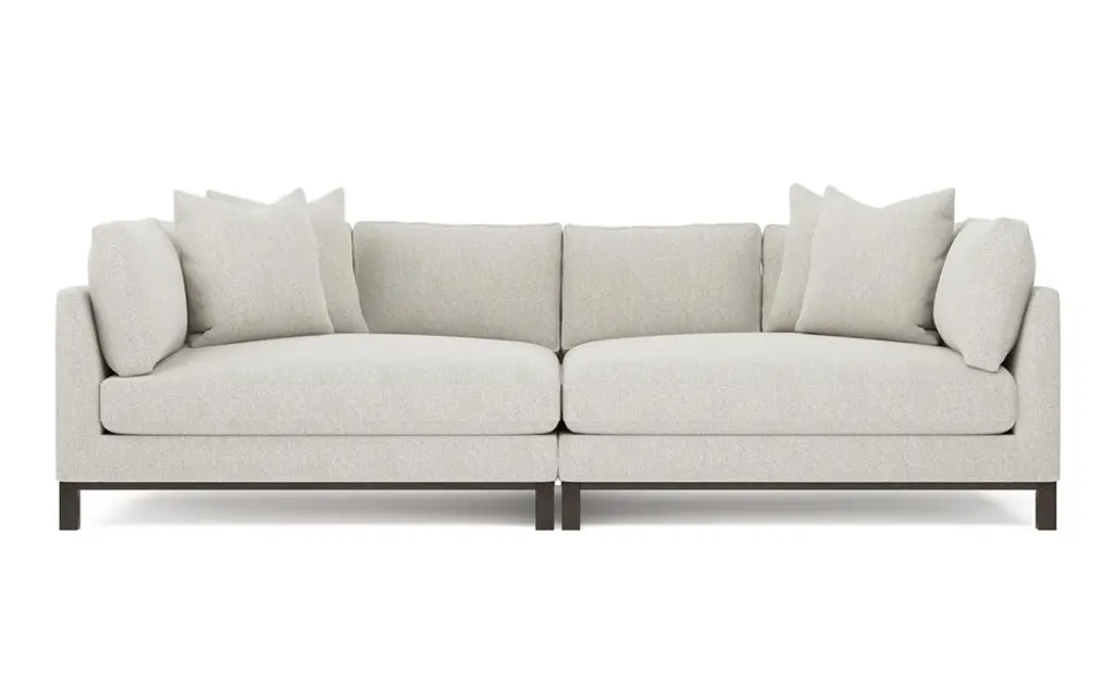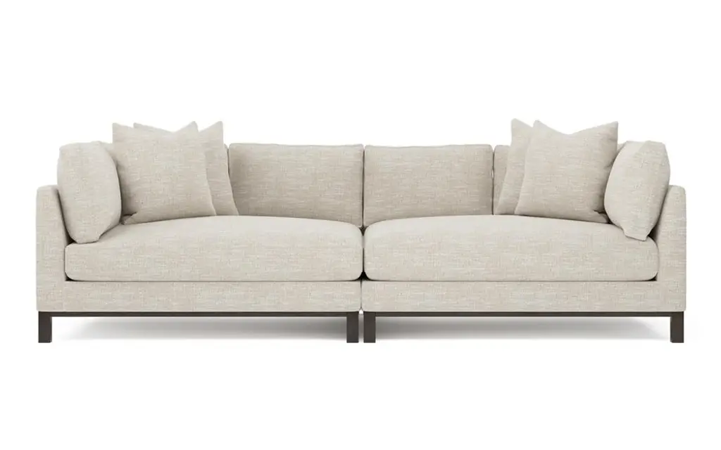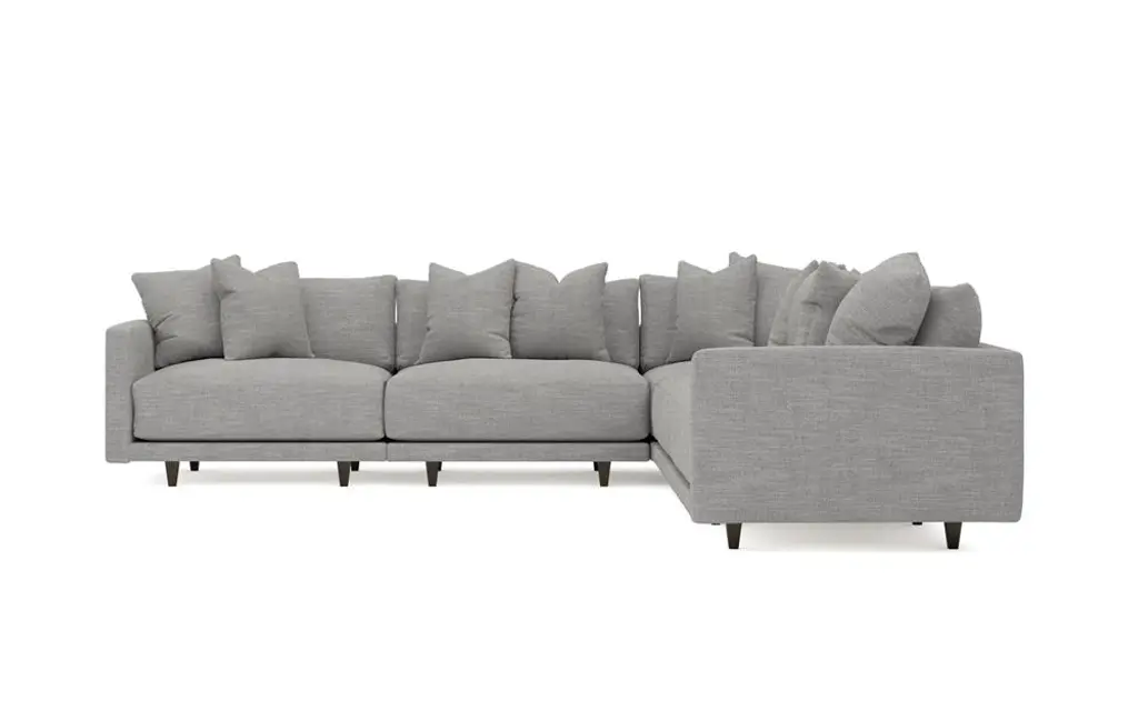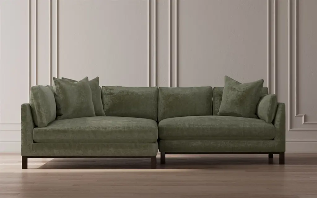 Designed with generous proportions, gently angled arms, and large throw pillows, the left 116” Adelle bumper sectional invites relaxation. A beautiful wood rail grounds the timeless transitional silhouette. Plush, comfortable seating is soft yet supportive, with a foam core surrounded by a blend of fiber, down, and feather fill. Choose from a variety of upholstery options, including linen, velvet, and performance fabrics.