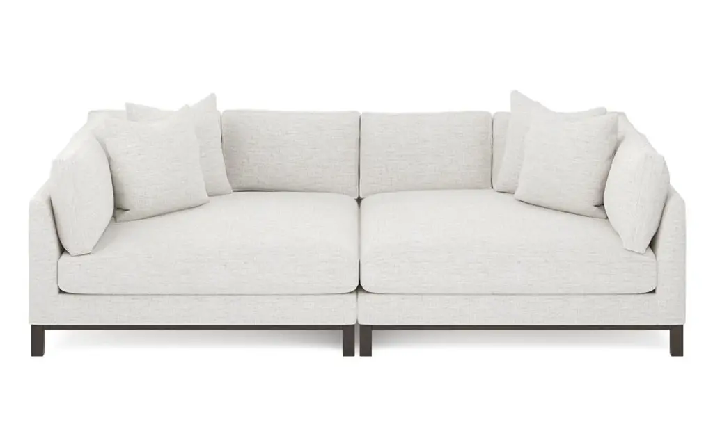 Nestle into the cozy comfort of the 116” Adelle double bumper sectional. With an extra-deep seat, gently angled arms, and large throw pillows, it's the ultimate lounge sectional for any TV room. A beautiful wood rail grounds the timeless transitional silhouette. Plush, comfortable seating is soft yet supportive, with a foam core surrounded by a blend of fiber, down, and feather fill. Choose from a variety of upholstery options, including linen, velvet, and performance fabrics.