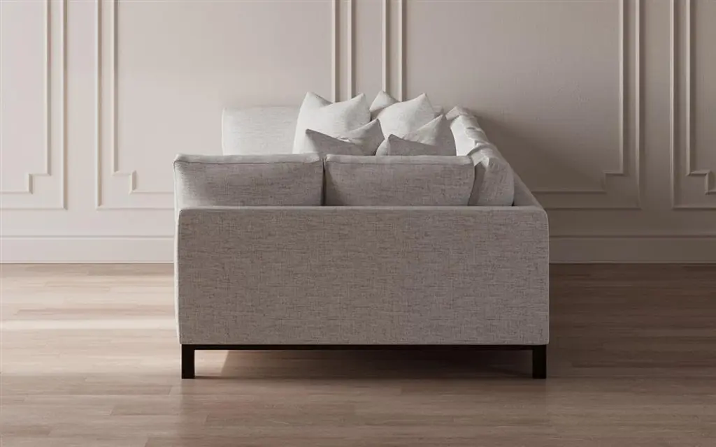Nestle into the cozy comfort of the 116” Adelle double bumper sectional. With an extra-deep seat, gently angled arms, and large throw pillows, it's the ultimate lounge sectional for any TV room. A beautiful wood rail grounds the timeless transitional silhouette. Plush, comfortable seating is soft yet supportive, with a foam core surrounded by a blend of fiber, down, and feather fill. Choose from a variety of upholstery options, including linen, velvet, and performance fabrics.