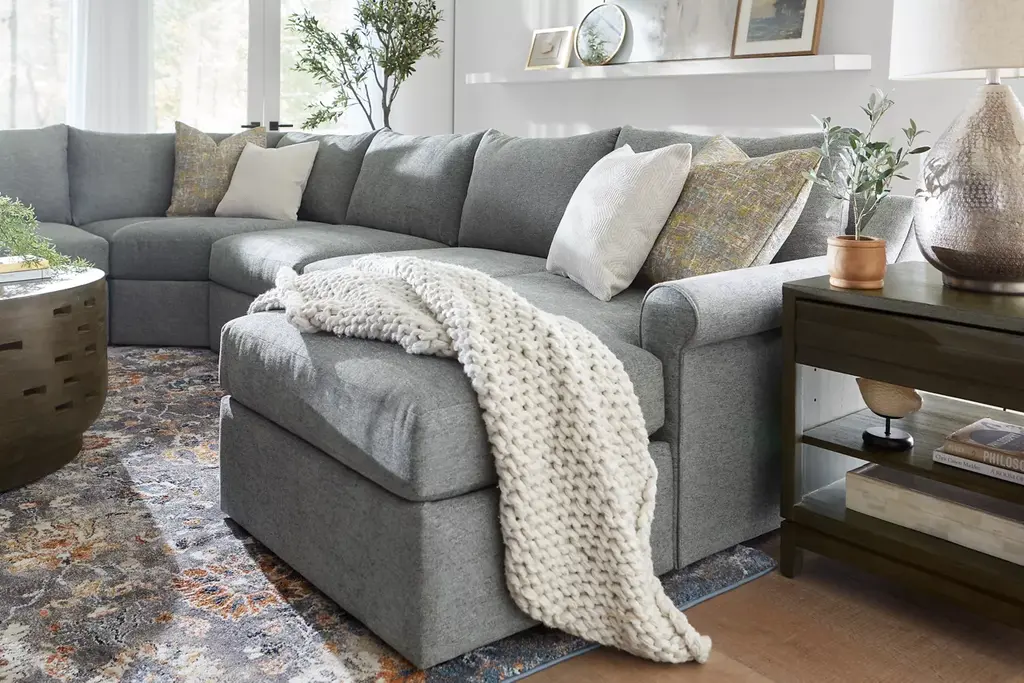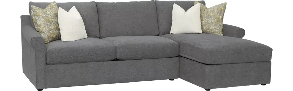 Exceptionally comfortable and effortlessly stylish, our Alaina sectional offers high-density seat cushions to create the ideal lounging spot. The traditional rolled arms and contemporary hidden feet blend together for a timeless, transitional design. Choose from a variety of configurations to suit your living room space.