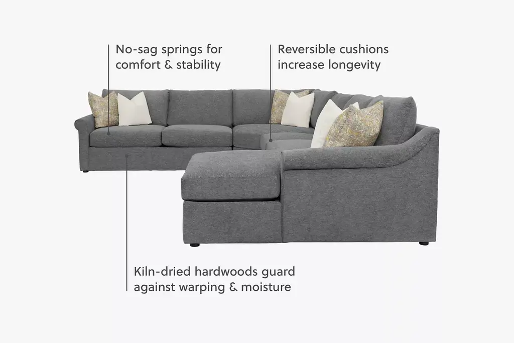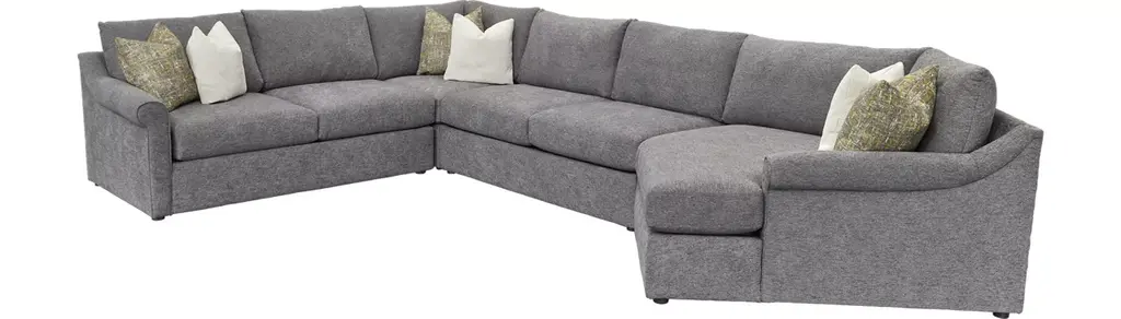 Exceptionally comfortable and effortlessly stylish, our Alaina sectional offers high-density seat cushions to create the ideal lounging spot. The traditional rolled arms and contemporary hidden feet blend together for a timeless, transitional design. Choose from a variety of configurations to suit your living room space.
