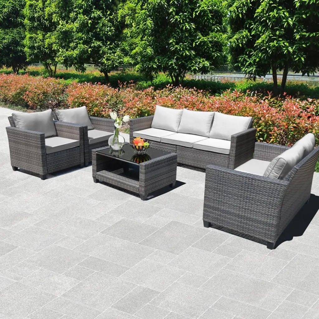This high-quality ALAULM outdoor woven rattan sofa set brings joy to your outdoor living! Hand-woven PE rattan is waterproof and fade-resistant, while the powder-coated steel frame ensures stability and balance. High-density fabric makes the cushions and pillows fade-resistant and waterproof, and the thickened 4-inch memory foam core effectively relieves body pressure! Modular patio sofa—your one-of-a-kind choice! Please Note: The product will be shipped in 8 separate packages, and delivery times may vary.