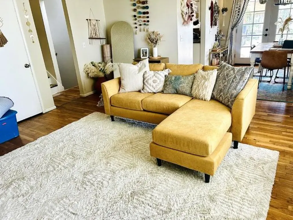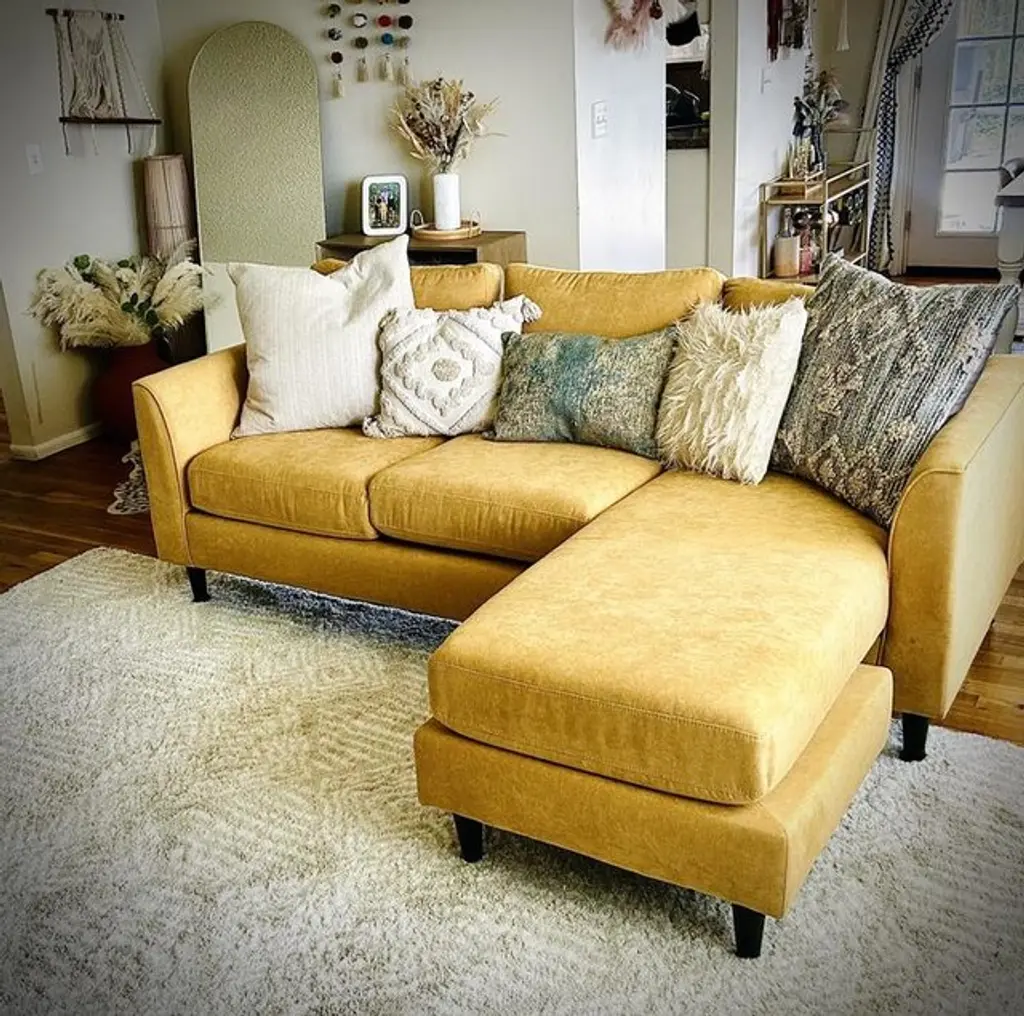 Introducing the Ami Sun Yellow Fabric 83" Sofa with Reversible Chaise, a perfect blend of modern style and comfort. This sofa features a vibrant sun yellow color that adds a cheerful touch to any living space. Crafted from 100% polyester fabric, it ensures durability and easy maintenance.