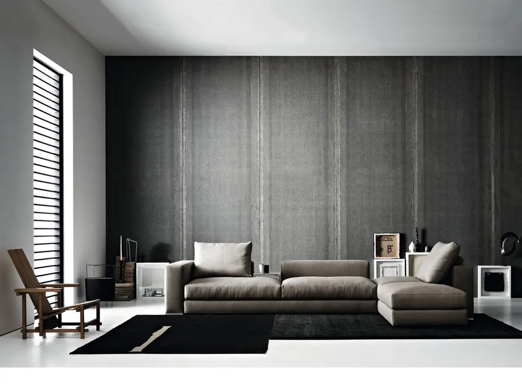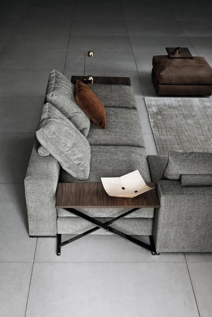 Ananta Class is an informal and versatile modular range that allows endless combinations of the independent backrests and bases available in 80, 120, 160, 200 and 240 cm lengths. The collection, whose very name evokes the idea of infinity, is based on the idea of simplified construction: free from the constraints of armrests and backrests, the seating can be arranged to suit individual needs. It is completed with a side table available in two sizes. The black chrome rest holds up a table top available either in walnut veneer or regenerated leather. The line offers a new, individualistic, modern way of shaping things to fit people’s needs. Fully removable covers.Born in 1953 he left formal education and began, almost by chance, his experience in the field of the padded furniture. Fascinated by the world that surrounded him, he eagerly devoted himself to researching building forms and techniques which have borne fruit for the companies in which he worked. In 1991 he opened his studio as an independent designer and in 1993 he came across Saba Italia. New challenges and new incentives lead to the creation of the “nomad sofa”: Taos, Ananta, Limes, Nesting, Pixel. Creations that were born from reflection of new desires that encourage us to live in a less formal way, equipped with systems that enable change with simple gestures, by playing with shapes.Structure: In wood padded with variable-density polyurethane foam (21IP, 25P, 30P e 40IP), covered with velfodera on a resin-coated backing 200 gr/sqm. The seat is sprung with elastic straps reinforced with polypropylene.Feet: The bases have feet in ABS, while the feet of the backs are in Black nickel finish.Padding: The back cushions are padded with washed and sterilized goose down and 100% polyester fiber divided into sections. Ananta Class proposes two kinds of seats: feather and polyurethane foam versions.Feather version: The seat cushions are filled with washed and sterilized goose feather divided into sections and covered with white 100% cotton fabric with variable-density polyurethane foam (30IP, 35IM).Foam version: The seat cushions are padded with variable-density polyurethane foam (30IP, 25IM), covered with fine velvet coupled with dacron 380 gr/sqm.Additional information:Material: Polyurethane foam, upholstery, ABSUpholstery: Cat. Lusso, Lima A13 - col.11Frame finish: Black nickelDimensions: Low table: 35 W x 50 D x 47 H cmSofa: 215 W x 95 D x 58 H cmSeat height: 42 cmAvailable in other upholstery options: C, E, special, vip, top, elite, royal, pelle club, extra, pelle master, pelle floridaAvailable in other frame option: CortenAvailable in other size options: Small, largeAvailable in other structural options