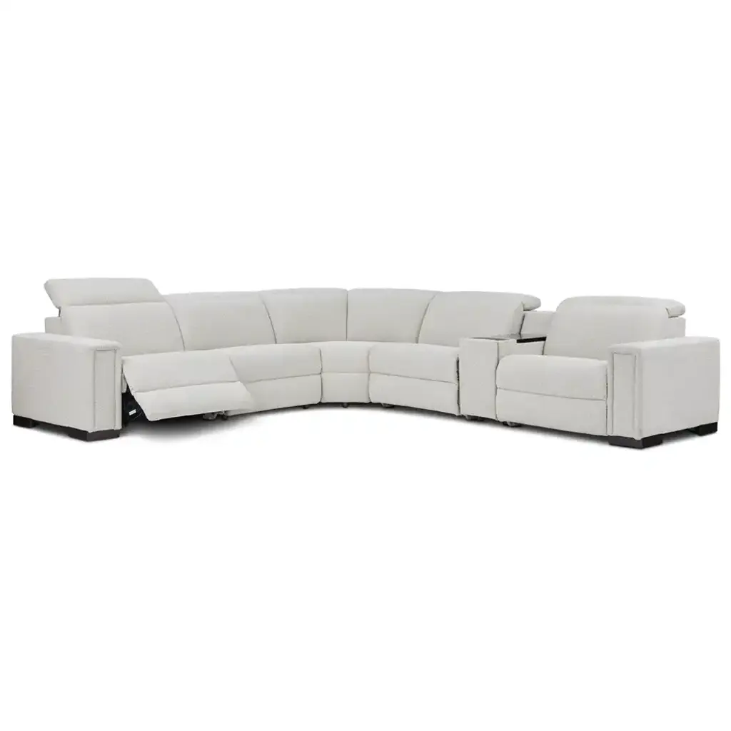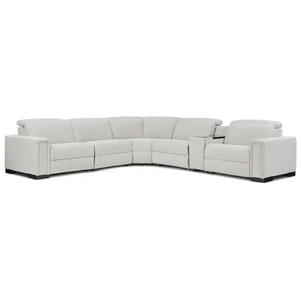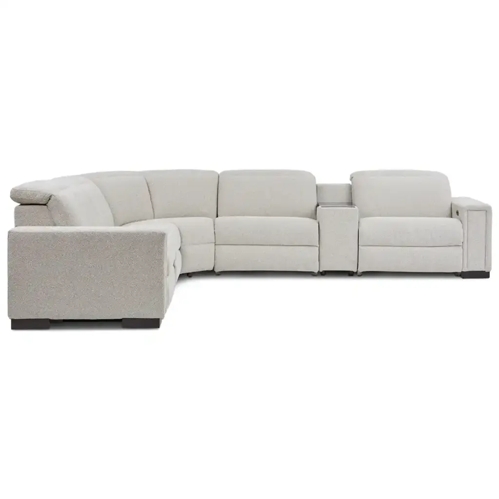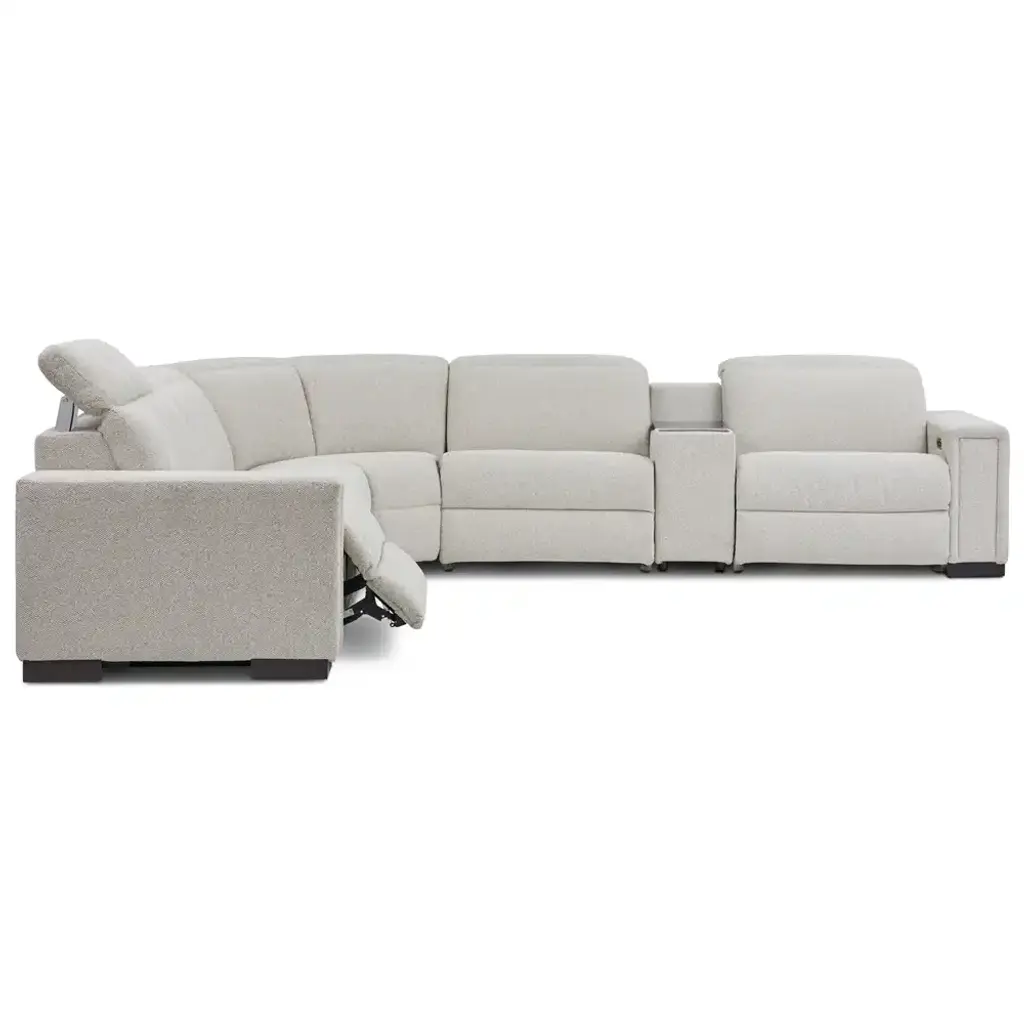 A smooth, low-slung design and bold track arms give the Armitage sectional a chic minimal aesthetic. Power controls elevate legs and recline backs to zero-gravity comfort. The headrests raise for support or lower to maintain the lush low-back allure.