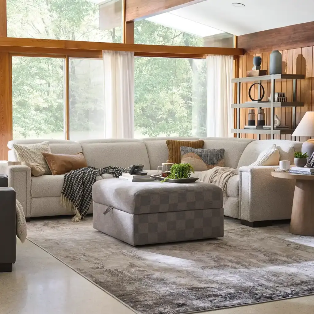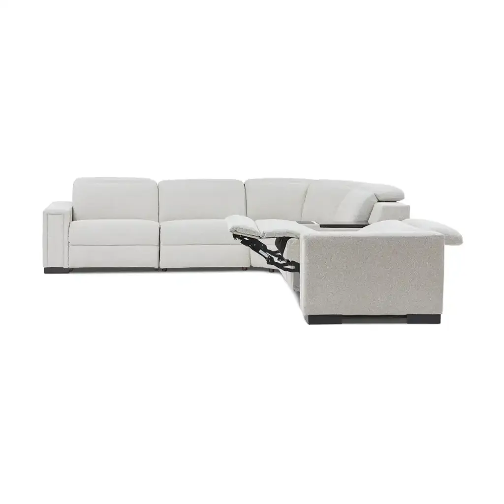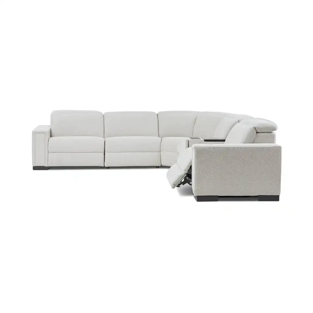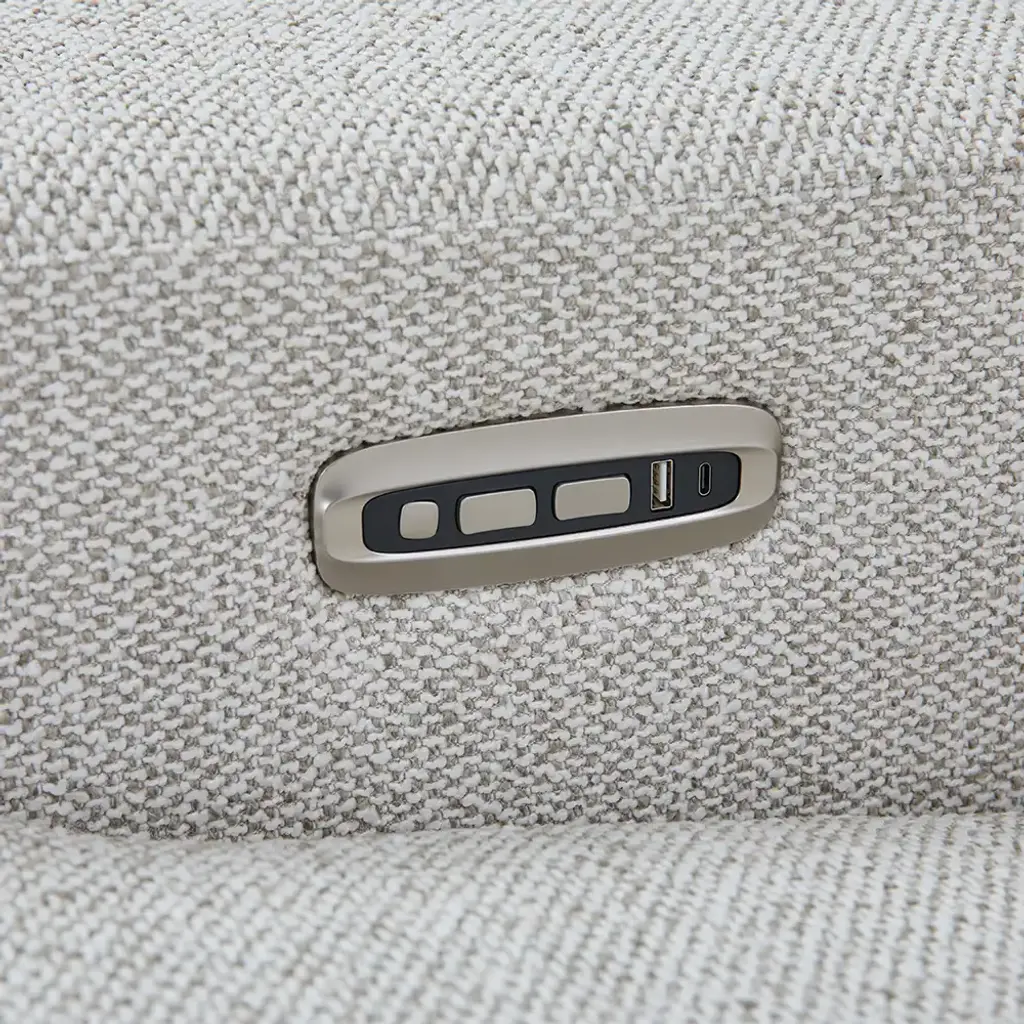 A smooth, low-slung design and bold track arms give the Armitage sectional a chic minimal aesthetic. Power controls elevate legs and recline backs to zero-gravity comfort. The headrests raise for support or lower to maintain the lush low-back allure.