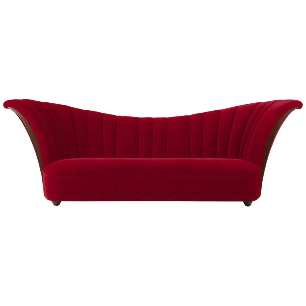 Art Deco Style Sectional Sofa In Ruby Red Velvet With Toned Piping
