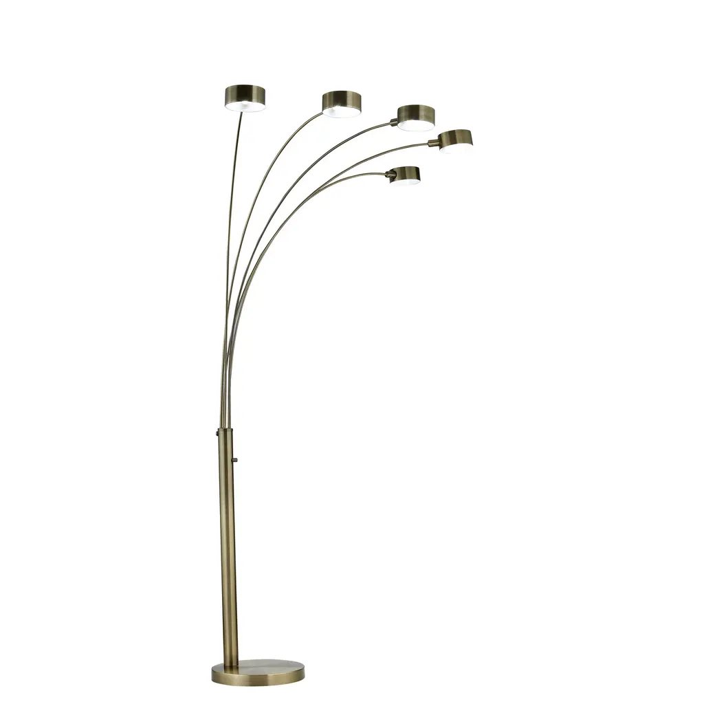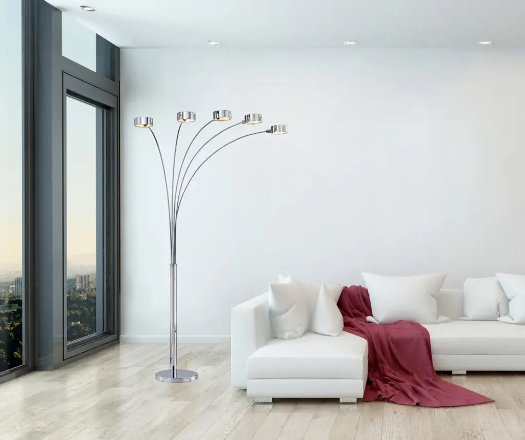 Micah is an excellent match for modern and contemporary decors and shows off the beauty of simple designs. The curved design adds a soft note to your decor. Standing over 7 feet, the fixture has a statuesque appearance and draws your eyes upwards. This floor lamp directs the light wherever you need it and creates just the right atmosphere with a convenient full-range dimmer switch. Micah provides ample lighting suitable for reading, writing, or creating a spot light in the setting. It features 360� Rotatable Shades which work as filters and screens to avoid direct eye contact with light bulbs. The Heavy-Weighted base grants perfect balance and prevents the lamp from tipping or falling. Smart Outlet CompatibleMicah measures 88" tall, 48" wide, with a 15" diameter base; Weighs 40 lbs - Recommend 2 people for assembly.,Shades: Metal 5.5-inch diameterThe Shades direct lights in different directions and work as filters and screens to avoid eye contact with light bulbPerfect behind sectional couch or accent sofa in a Dining Room, Living Room, or Bedroom as Reading Lamp or Primary Sourch of LightFive (5) E12 40-watts dimmable candelabra light bulbs (INCLUDED) - Equivalent to 9-watts CFL or 5-watts LED bulbs (must use dimmable bulbs)Beautiful Modern Chrome Finish with Full Range DimmerSmart Outlet Compatible . Works with Smart outlets that are Alexa, Google Home assistant or Apple HomeKit enabled to turn the lamp on/off.US Patented Design. US Patent # US D753,867 S