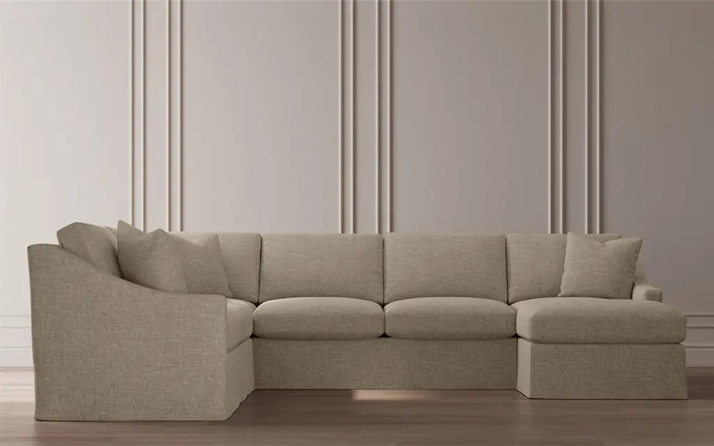 Comfortable and generously proportioned, the right 145” Avery slipcovered U-chaise sectional plays host to lively gatherings and quiet moments at home. With gently sloped arms and simple lines, its versatile silhouette pairs nicely with any style. Soft yet supportive with a slightly firm sit, the low-maintenance seat cushions feature a foam core surrounded by plush fiber fill. Cozy throw pillows make for easy lounging. Choose from washable slipcover fabrics in a variety of serene hues.