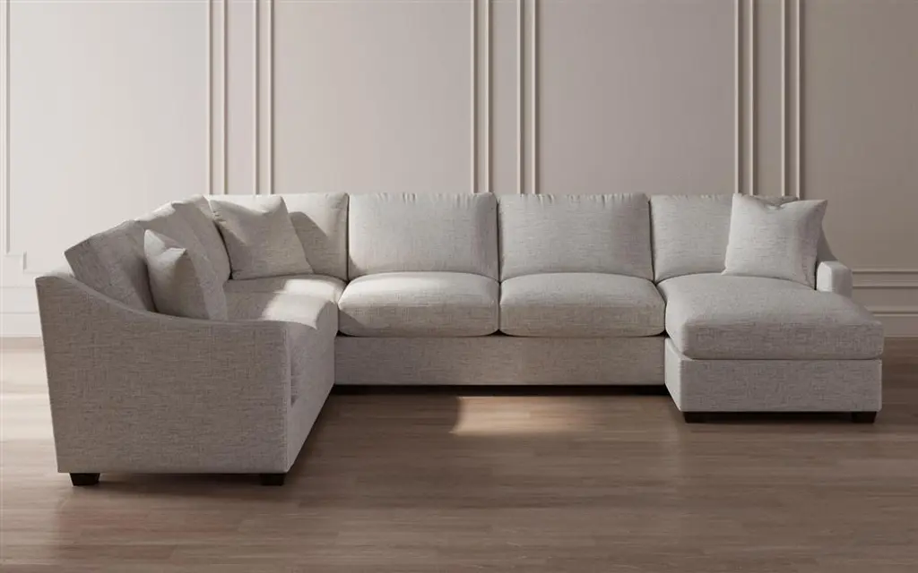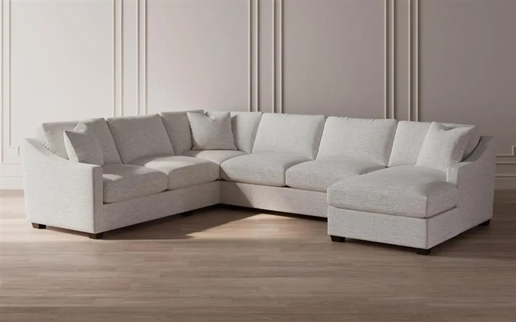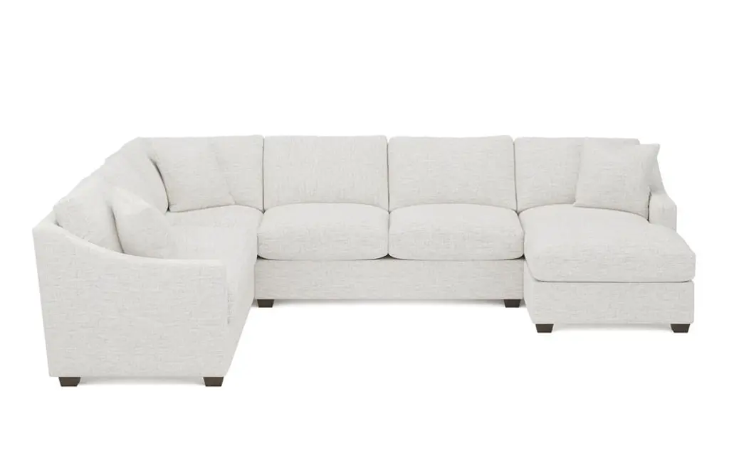 Generously proportioned and delightfully comfortable, the right 145” Avery U-chaise sectional encourages relaxation. The simple, timeless silhouette includes tapered wood legs and gently sloped arms. Soft yet supportive with a slightly firm sit, the low-maintenance seat cushions feature a foam core surrounded by plush fiber fill. Cozy throw pillows make for easy lounging. Choose from a variety of upholstery options, including linen, velvet, and performance fabrics.