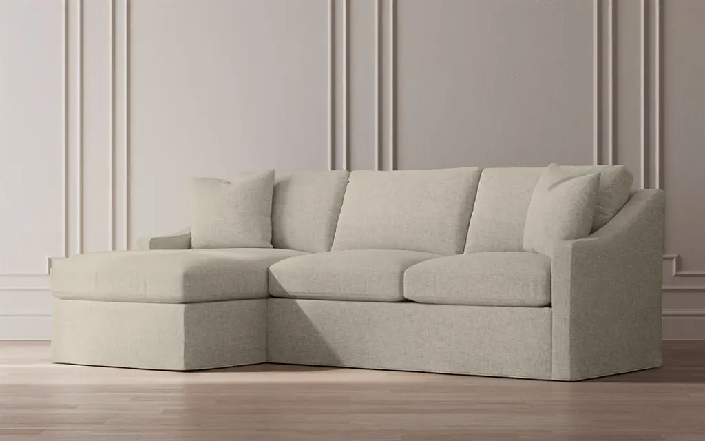 Timeless and inviting, the left 110" Avery slipcovered chaise sectional pairs seamlessly with any living space. Gently sloped arms bring subtle curvature to the simple, versatile silhouette. Soft yet supportive with a slightly firm sit, the low-maintenance seat cushions feature a foam core surrounded by plush fiber fill. Cozy throw pillows make for easy lounging. Choose from washable slipcover fabrics in a variety of serene hues.