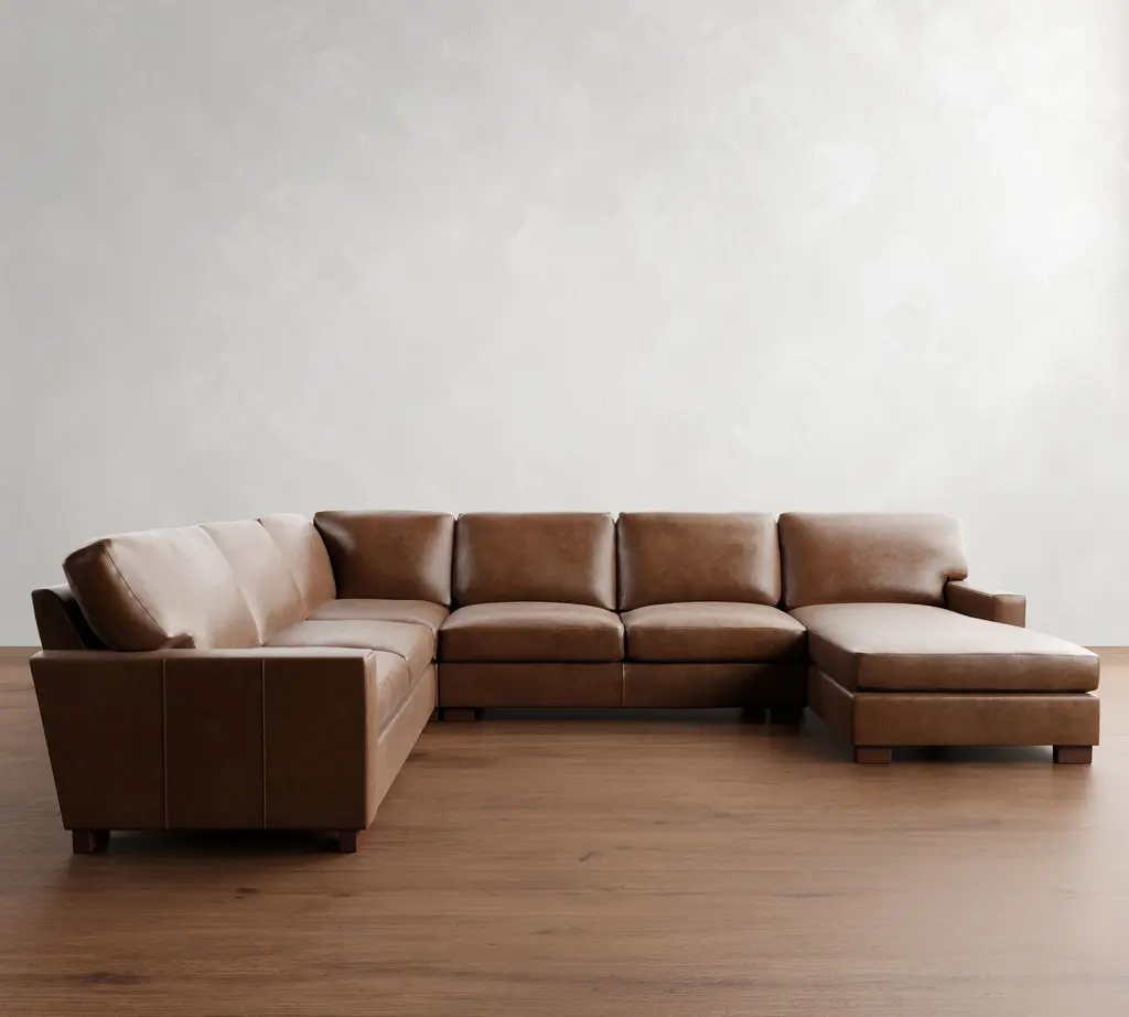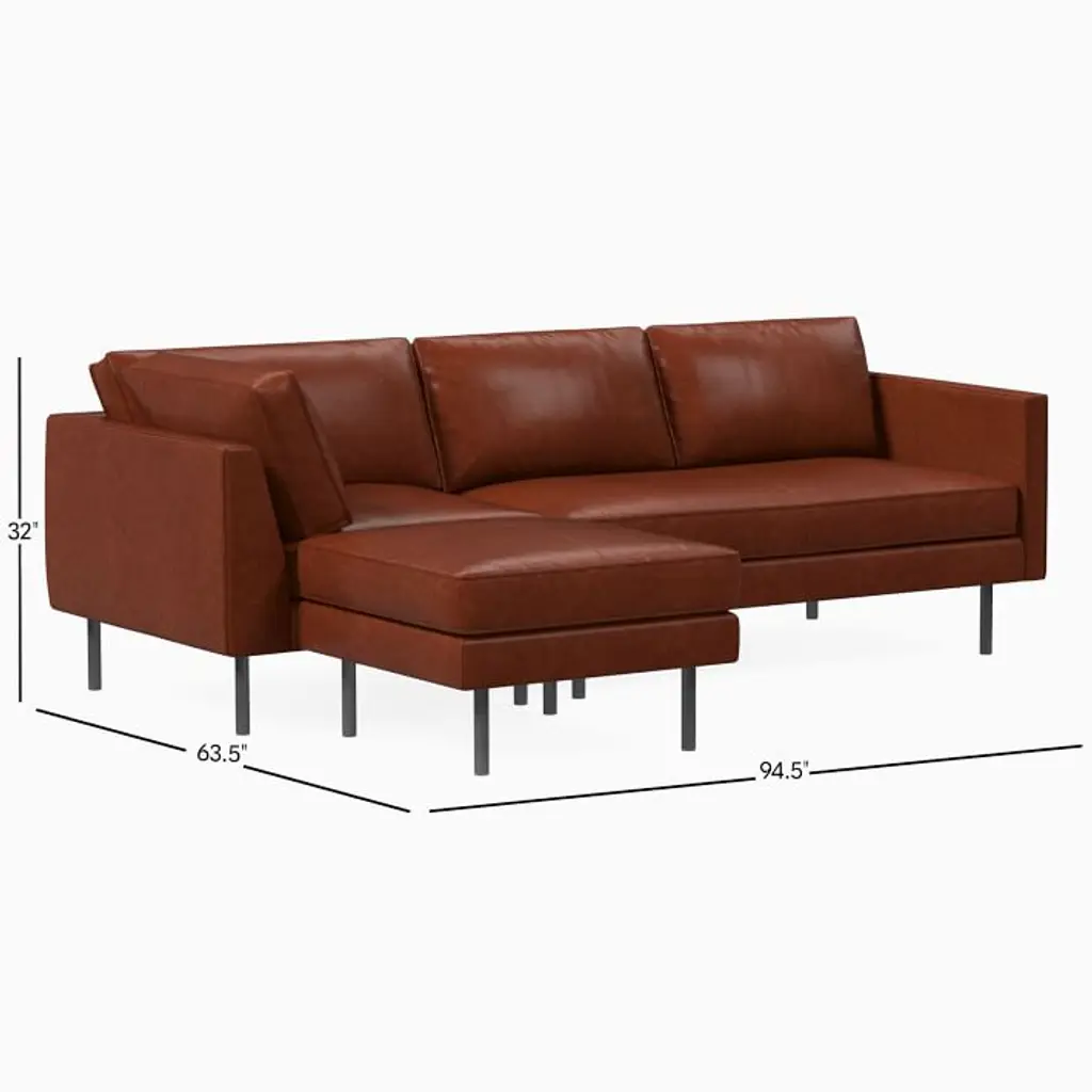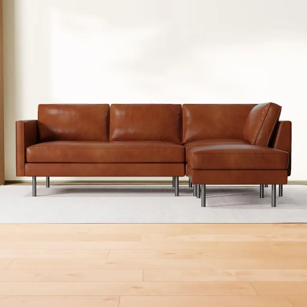 Metal legs in a Burnished Bronze finish. Solid and engineered hardwood frame with reinforced joinery. All wood is kiln-dried for added durability. Top-grain leather upholstery. Leather is a natural product. Variation in color and texture are inherent to each hide; no two pieces are exactly alike. High-gauge sinuous springs provide cushion support. Seat cushions have fiber-wrapped, high-resiliency polyurethane foam cores. Seat firmness: Medium. On a scale from 1 to 5 (5 being firmest), we rate it a 4. Back cushions are fiber filled. Seat cushions are attached; back cushions are loose but nonreversible. Removable legs. Sectional pieces attach via alligator clips (included). Imported.