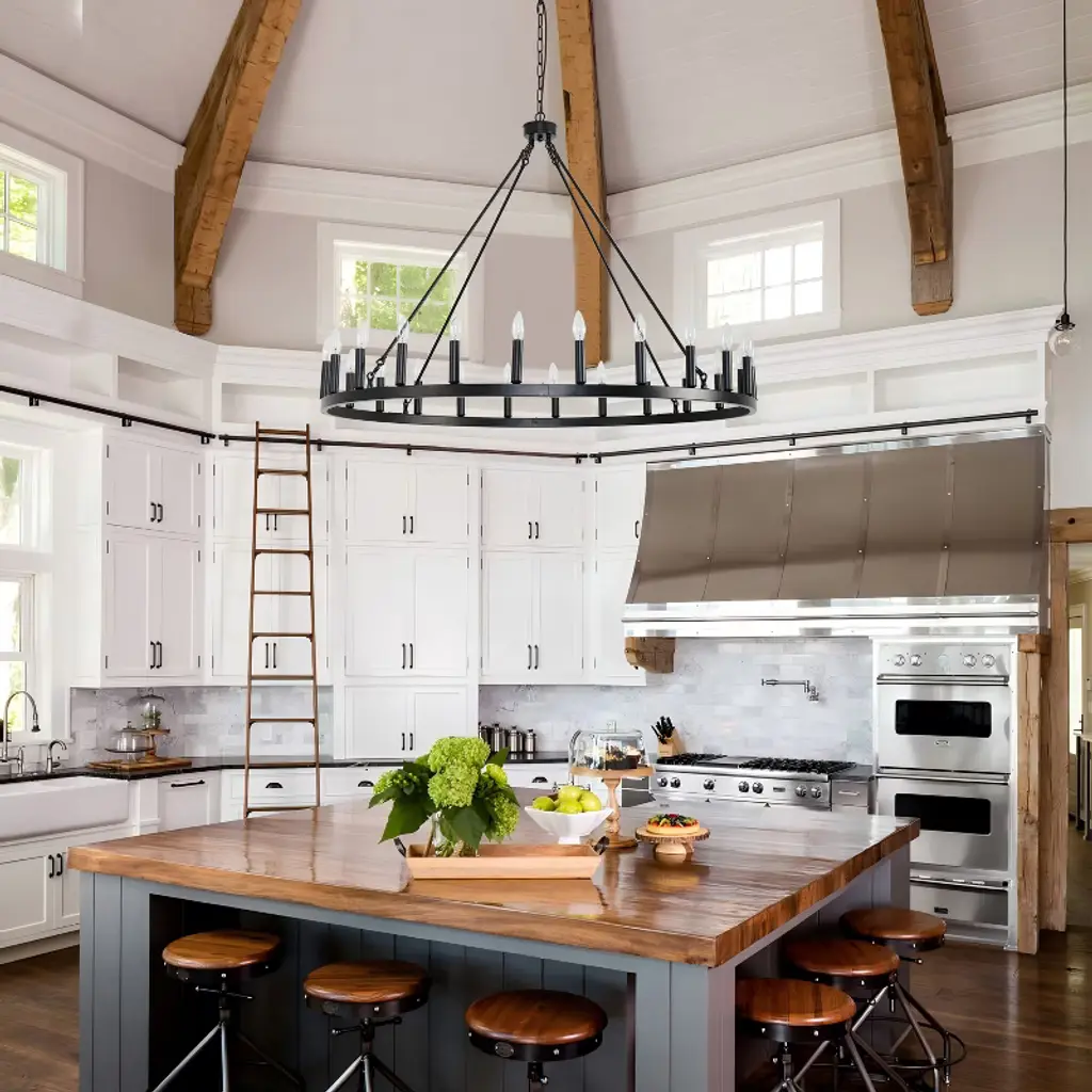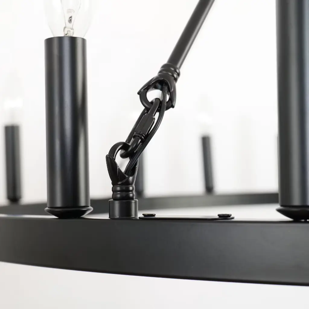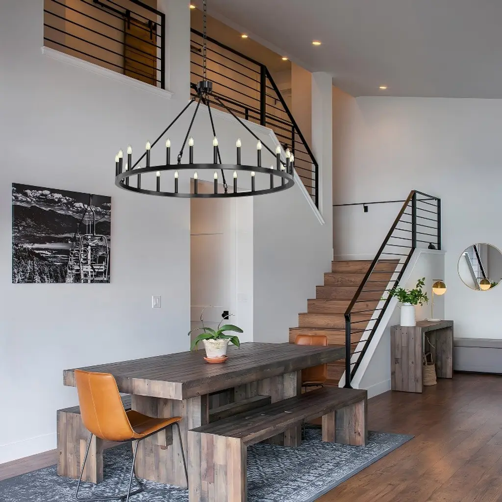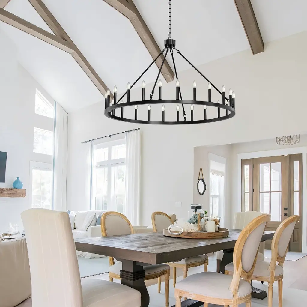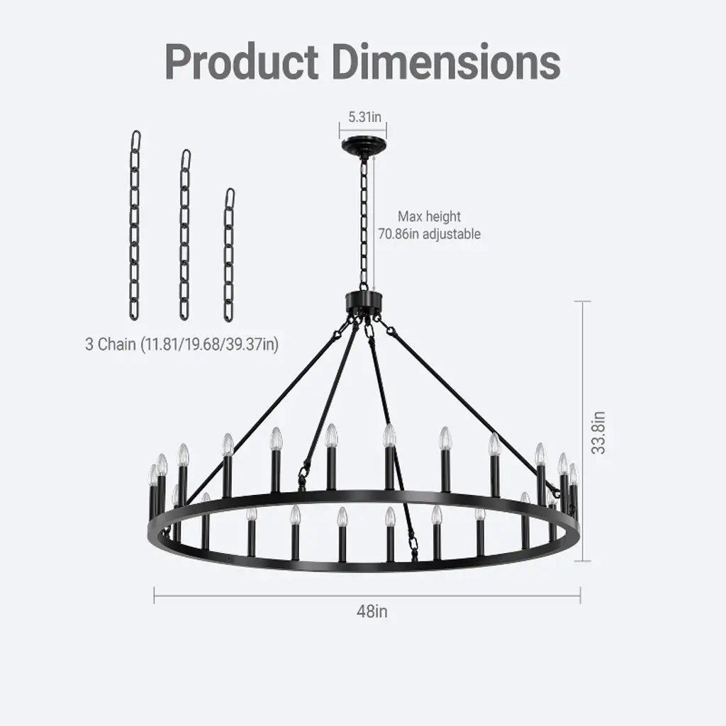 48" Matte Black Wagon Wheel Chandelier – Industrial Farmhouse Focal Point for Grand SpacesCommand attention in lofty rooms with this oversized wagon wheel ceiling fixture, where hand-forged iron craftsmanship meets 24-bulb brilliance. Designed for high-ceiling homes, luxury lodges, or boutique hotels, its 48-inch diameter frame delivers 360° warm illumination – 70% brighter than standard wagon wheel designs, yet retains rustic charm through matte black finishes.Technical Specifications▸ Dimensions: 48” (D) × 33.8” (H)▸ Canopy: 5.31”▸ Voltage: 110-120V (USA Standard)▸ Bulbs: 24 x E12 Base (LED/CFL/Halogen Compatible, Not Included)▸ Adjustable Drop: 3-chain system (11.81”/19.68”/39.37”)▸ Max Height: 70.86”▸ Finish: Rust-proof matte blackPerfect for:• Grand Entry: Hang 70 inches high in a timber-framed foyer for a cottage feel.• Open Living: Center a sofa sectional with dimmable LED lighting for movie night.• Hospitality Venues: Mount the fixture above a barn door for a café vibe.