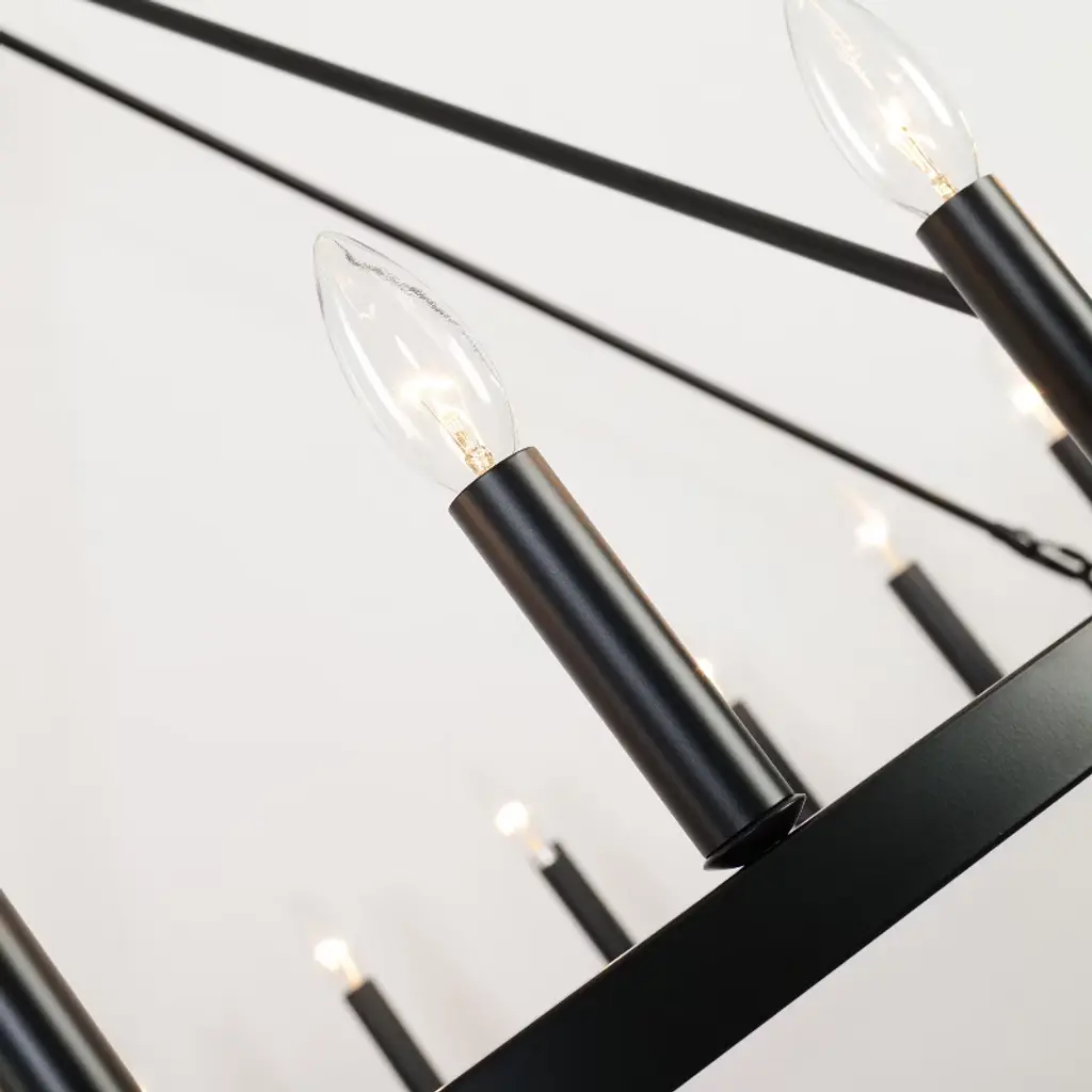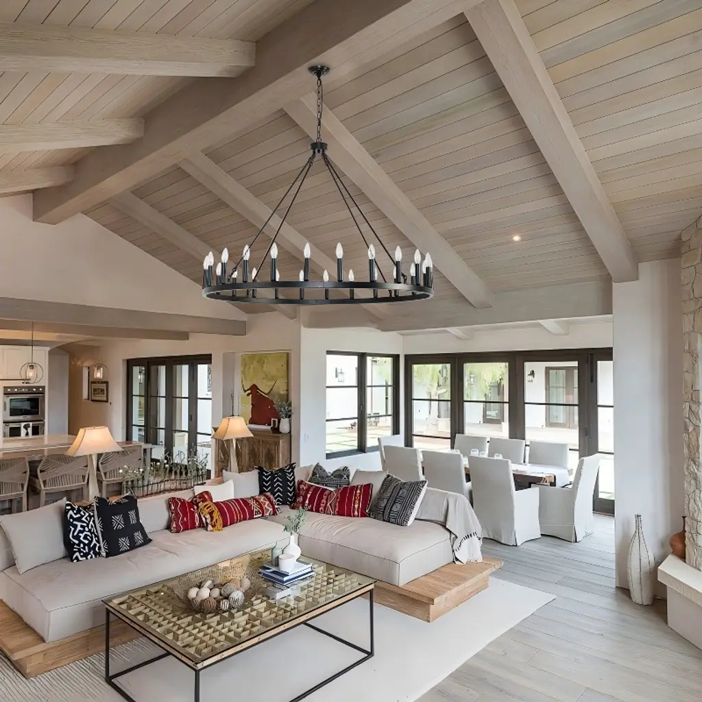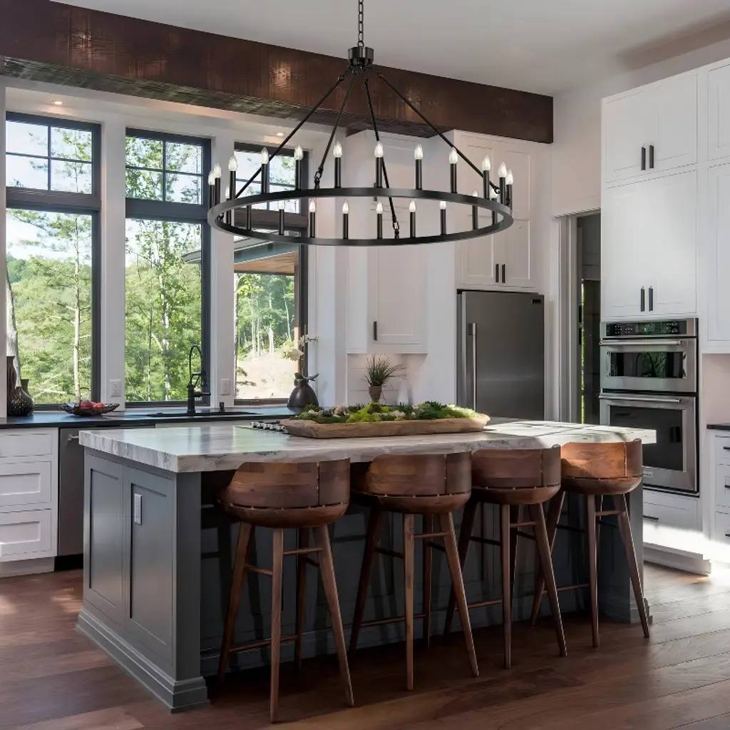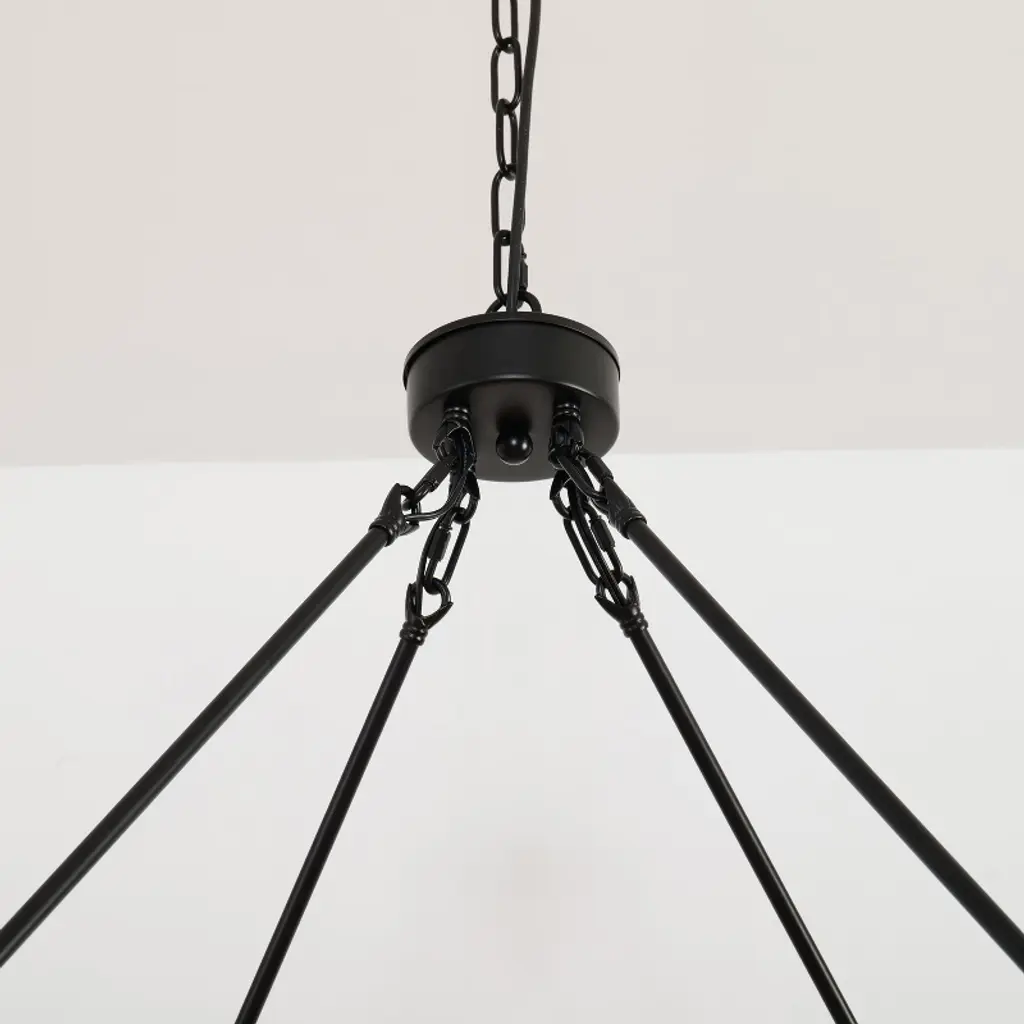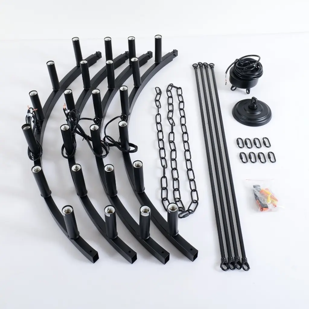48" Matte Black Wagon Wheel Chandelier – Industrial Farmhouse Focal Point for Grand SpacesCommand attention in lofty rooms with this oversized wagon wheel ceiling fixture, where hand-forged iron craftsmanship meets 24-bulb brilliance. Designed for high-ceiling homes, luxury lodges, or boutique hotels, its 48-inch diameter frame delivers 360° warm illumination – 70% brighter than standard wagon wheel designs, yet retains rustic charm through matte black finishes.Technical Specifications▸ Dimensions: 48” (D) × 33.8” (H)▸ Canopy: 5.31”▸ Voltage: 110-120V (USA Standard)▸ Bulbs: 24 x E12 Base (LED/CFL/Halogen Compatible, Not Included)▸ Adjustable Drop: 3-chain system (11.81”/19.68”/39.37”)▸ Max Height: 70.86”▸ Finish: Rust-proof matte blackPerfect for:• Grand Entry: Hang 70 inches high in a timber-framed foyer for a cottage feel.• Open Living: Center a sofa sectional with dimmable LED lighting for movie night.• Hospitality Venues: Mount the fixture above a barn door for a café vibe.
