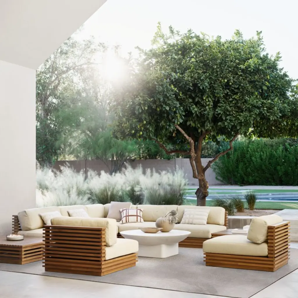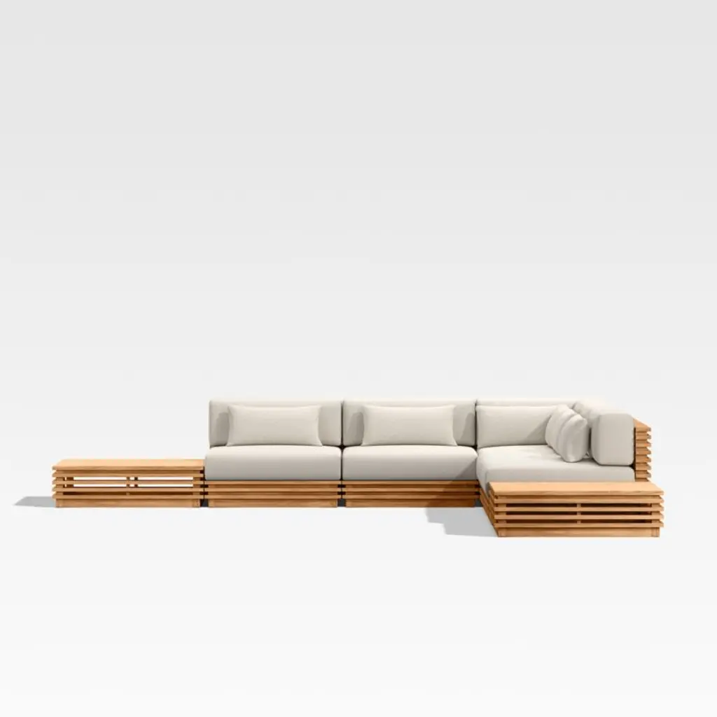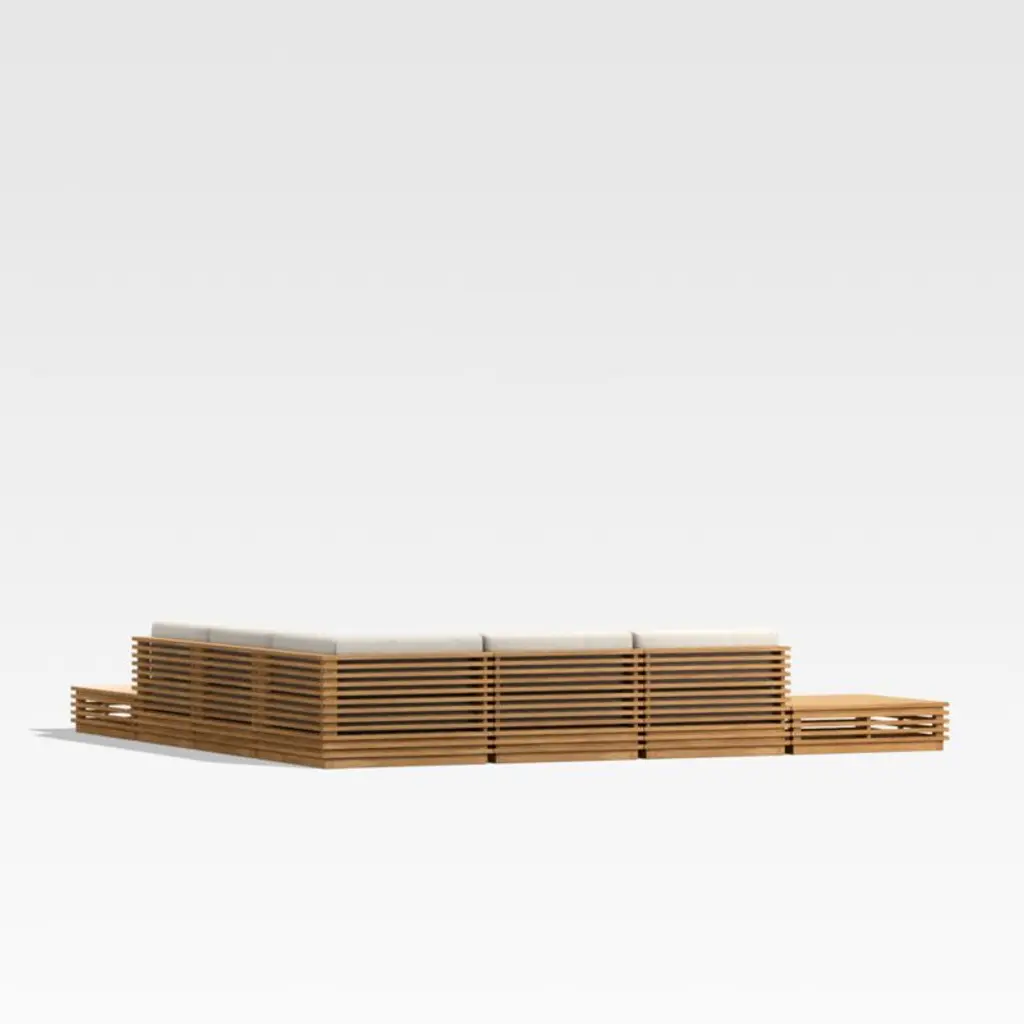 Modern, modular and made for the outdoors, our Batten sectional riffs on our popular indoor storage and bedroom collection to outfit your alfresco living space with clean lines and real teak. The bold slats of sustainable teak that define the linear profile and minimalist silhouette of the sectional componentsfour armless chairs, corner and two side coffee tableline up seamlessly to form the L-shaped sectional. Layered with neutral-toned seat, back and lumbar cushions covered in UV-resistant polyester, the seven-piece sectional sits deep and comfortable day into night.By choosing FSC®-certified furniture, you are supporting responsible management of the world's forests.If left uncovered and untreated, natural teak will patina to a beautiful silvery grey.