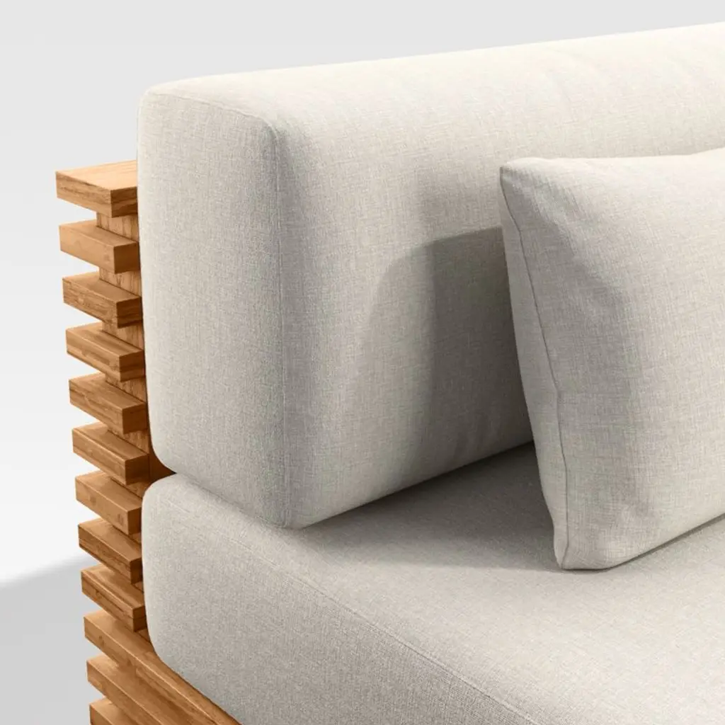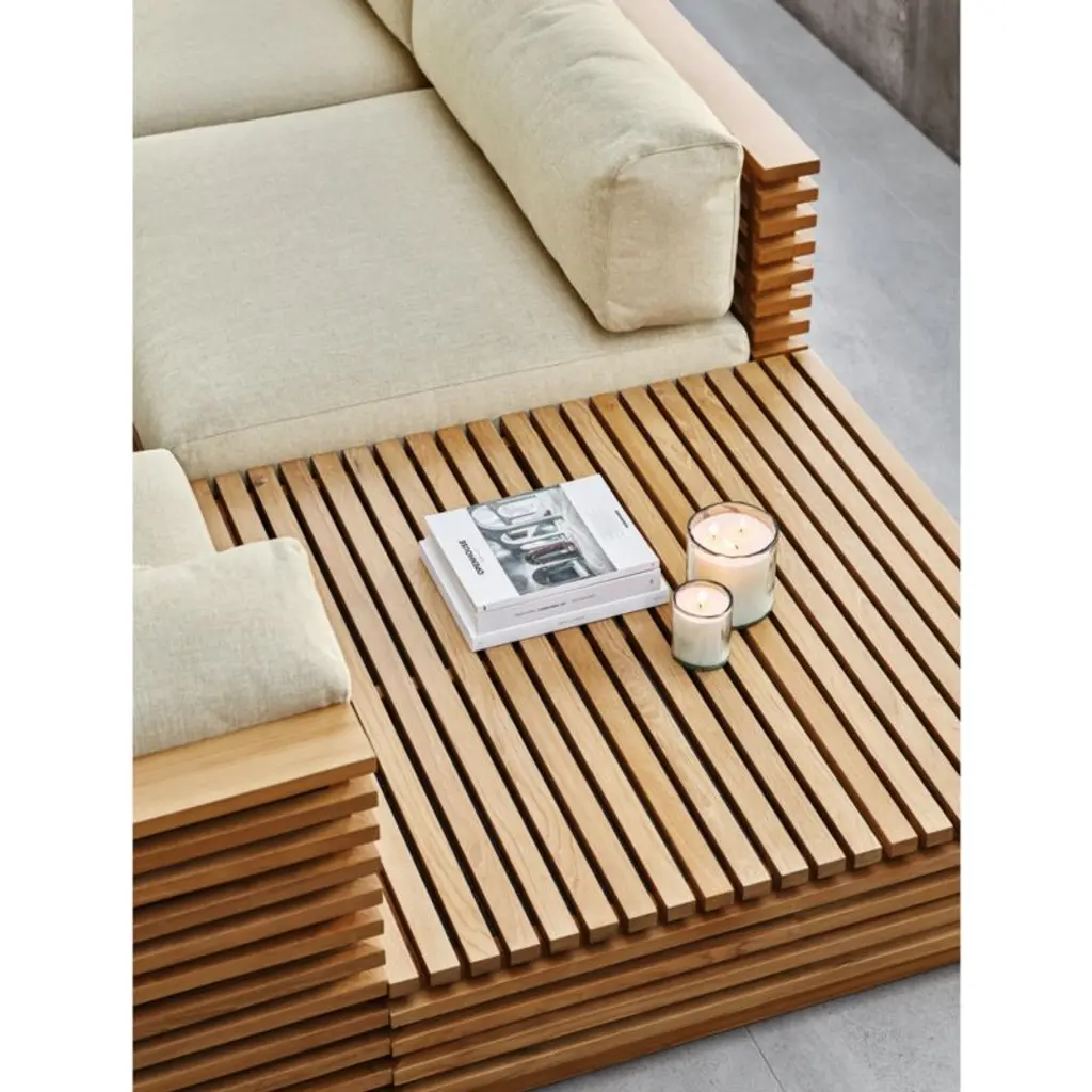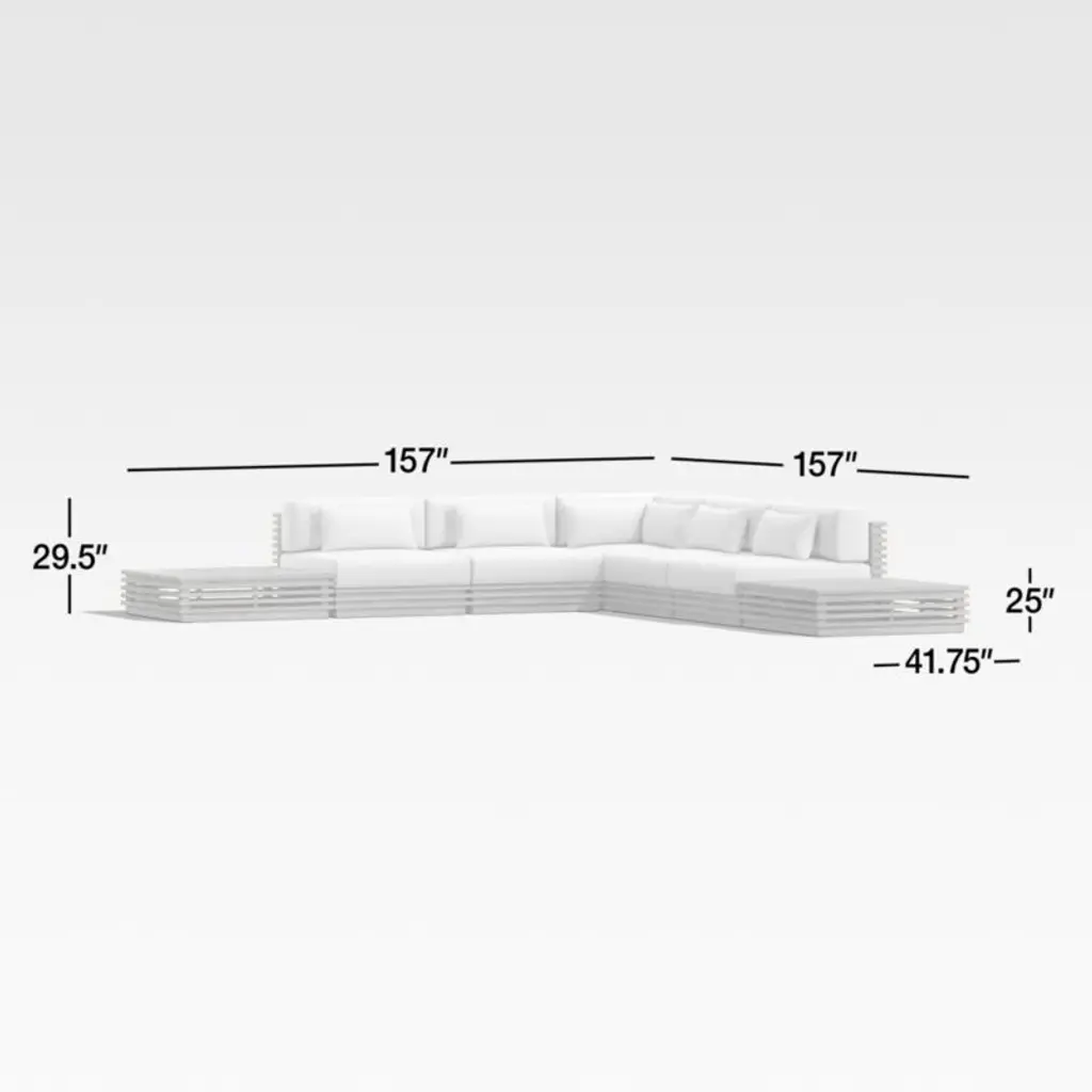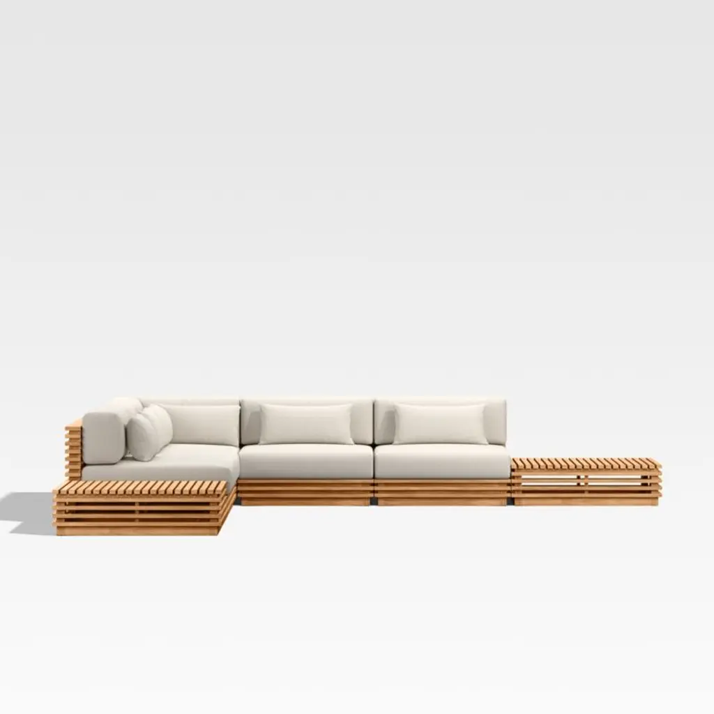 Modern, modular and made for the outdoors, our Batten sectional riffs on our popular indoor storage and bedroom collection to outfit your alfresco living space with clean lines and real teak. The bold slats of sustainable teak that define the linear profile and minimalist silhouette of the sectional componentsfour armless chairs, corner and two side coffee tableline up seamlessly to form the L-shaped sectional. Layered with neutral-toned seat, back and lumbar cushions covered in UV-resistant polyester, the seven-piece sectional sits deep and comfortable day into night.By choosing FSC®-certified furniture, you are supporting responsible management of the world's forests.If left uncovered and untreated, natural teak will patina to a beautiful silvery grey.