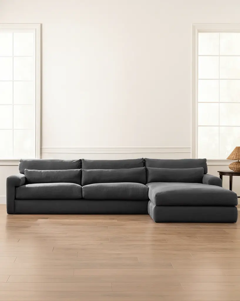 Our Beckstead Chaise Sectional 128" is inspired by modern design elements but with a classically approachable feel. Handcrafted with luxurious comfort and durability in mind, the sectional features an alder wood frame and cushions filled with a feather and down blend. The lumbar pillows create a welcoming feel while its squared arms lend an element of sophistication. Customizable in a wide array of fabrics, you can make this made-to-order piece entirely your own.