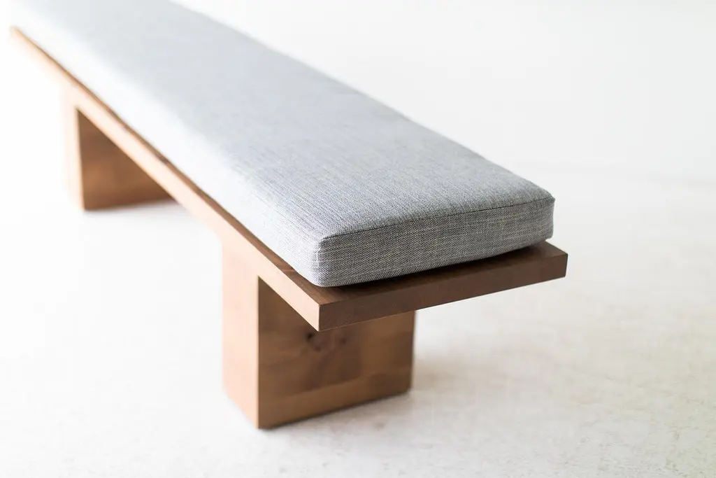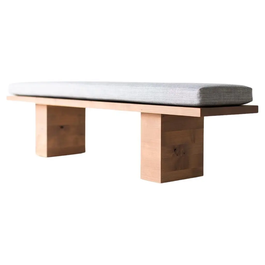 Bertu Bench, Suelo® Modern Wood Bench, Upholstered, Thick WeaveThis upholstered Suelo® Modern Wood Bench is beautifully constructed from solid wood in Ohio, USA. This silhouette is simple, modern, and sleek, topped with a comfortable cushion. This is the perfect bench for any space, indoor or outdoor. The Suelo® Collection consists of an arm chair, side chair, bench, daybed, loveseat, ottoman, dining chairs - both arm and side, and multiple orientations of sofas/sectionals for indoor or outdoor use. You can get any Suelo® piece in a solid or slatted version. This specific wood species is for indoor only; please contact for outdoor options. Price includes thick weave fabric and finish of your choice - natural, grey-wash, walnut, and black. Multiple fabric colors available.This bench is for indoor use! Please contact us or find our other Suelo® listings for the outdoor version.Designer Inspiration: "The Suelo® Collection was inspired by my love for travel. So many places that inspire me have very minimal furniture, often built-in sofas with big comfy cushions, hammocks, raw natural wood, etc. The feel is low-key, simple, and comfortable. The wood isn't refined, it just IS. Functionality always plays into my designs as well, represented here by lower seating for a more intimate talking or lounging environment, and the platform wood extension detail on the sofa, which makes a great little table for your drink or cell phone. I envision this furniture used for indoor/outdoor spaces or any room that needs some comfort or relief. The Suelo® line reminds me of your own getaway - it has a natural, cool vibe and doesn't take itself too seriously. I imagine the sofa loaded up with pillows and some music playing in the background, of course." -Gretta JonesSpecsPeriod/Model: New; ModernIndoor/Outdoor: Indoor Specs: Solid Knotty Alder, Grey Wash Commercial Grade Finish, Thick Weave FabricDimensionsH: 18"L: 72"D: 16"SKU: Bertu Bench, Suelo® Modern Wood Bench, Upholstered, Thick Weave
