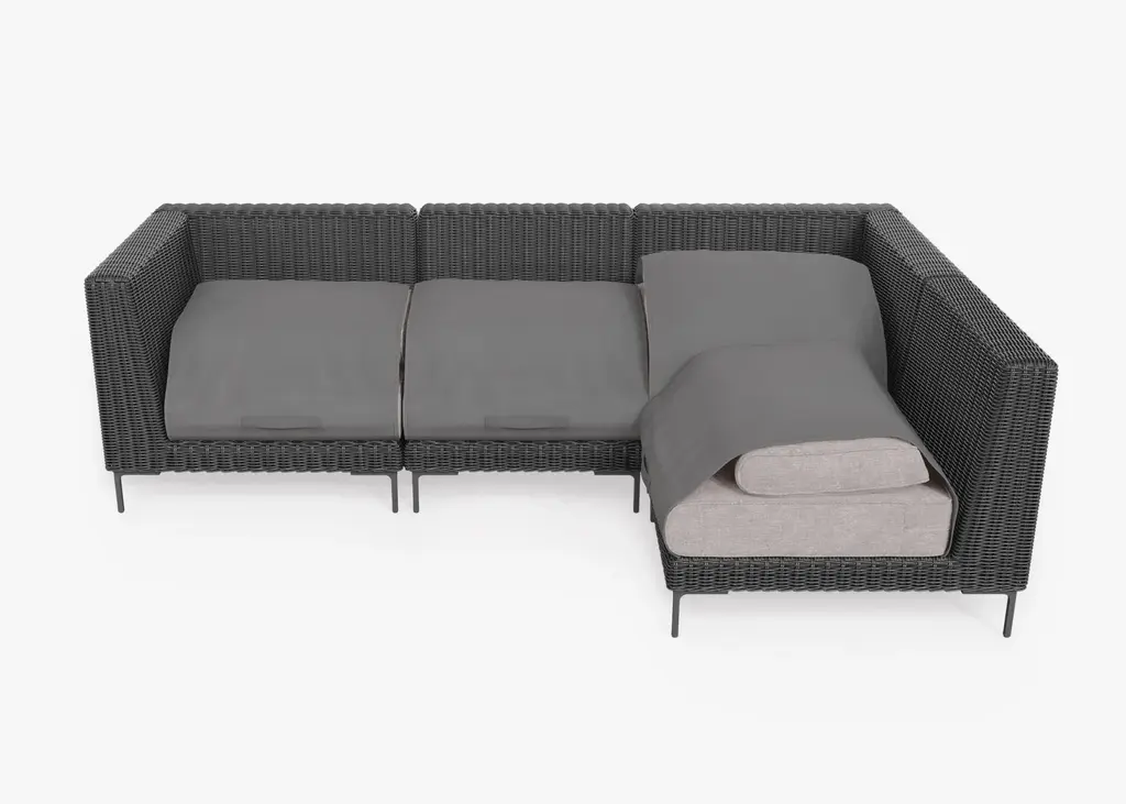 Enjoy indoor comfort outside. Stylish and durably designed from All-Weather Wicker, Outer’s modular patio furniture invites you to relax on luxuriously comfortable memory foam cushions. The built-in, easy to use OuterShell® cover protects the cushions when not in use, and features Velcro that secures it in place and a handle for convenient carrying and storage. Includes 1 corner chairs, 2 armless chairs, and 1 sectional chair that reconfigure easily.