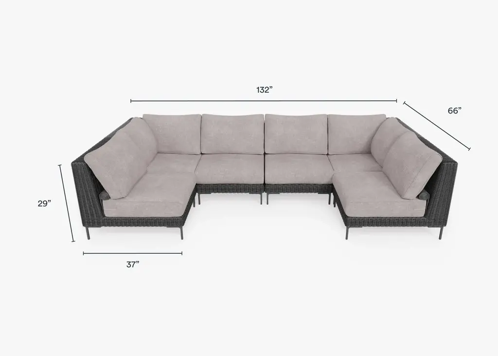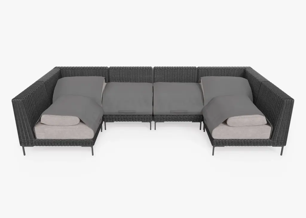 Enjoy indoor comfort outside. Stylish and durably designed from All-Weather Wicker, Outer’s modular patio furniture invites you to relax on luxuriously comfortable memory foam cushions. The built-in, easy to use OuterShell® cover protects the cushions when not in use, and features Velcro that secures it in place and a handle for convenient carrying and storage. Includes 2 sectional chairs and 4 armless chairs that reconfigure easily.