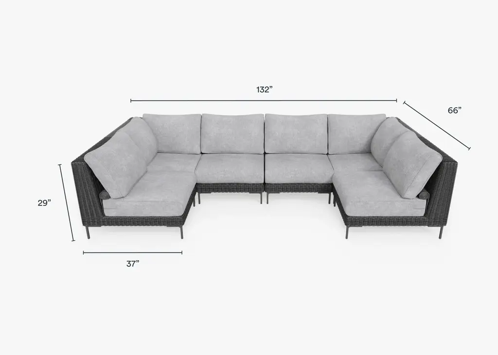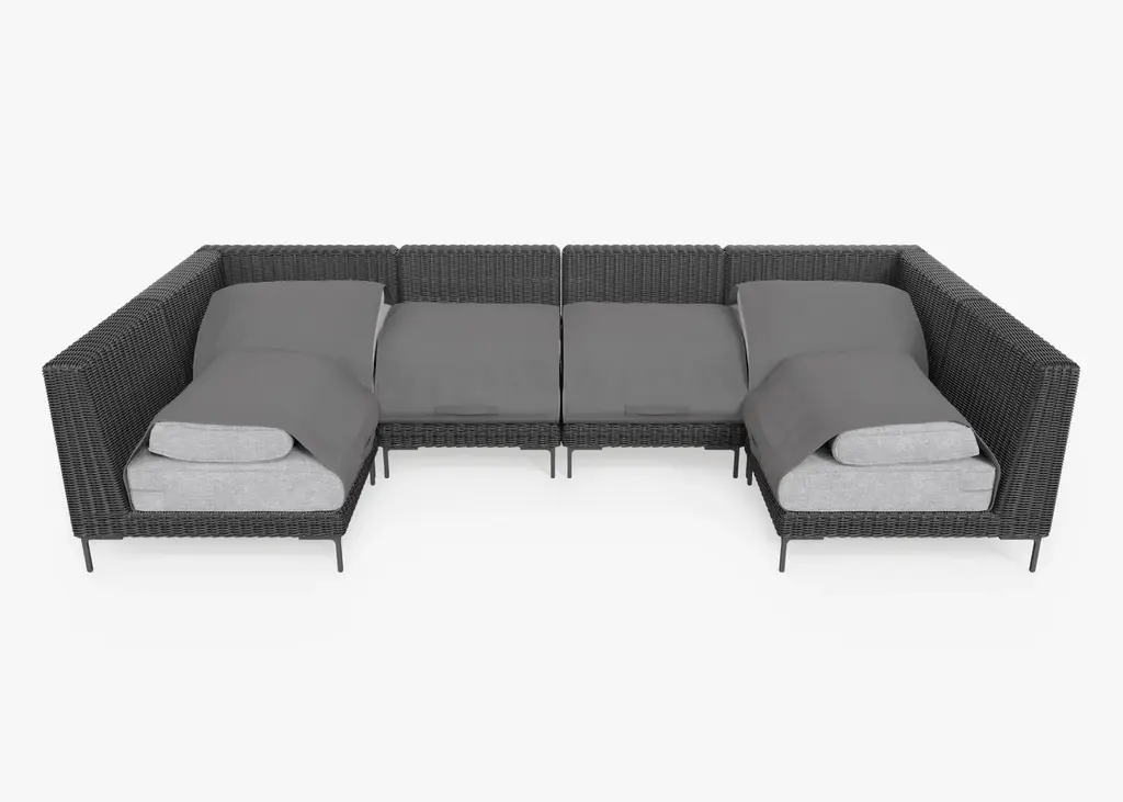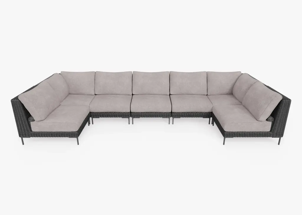 Enjoy indoor comfort outside. Stylish and durably designed from All-Weather Wicker, Outer’s modular patio furniture invites you to relax on luxuriously comfortable memory foam cushions. The built-in, easy to use OuterShell® cover protects the cushions when not in use, and features Velcro that secures it in place and a handle for convenient carrying and storage. Includes 2 sectional chairs and 4 armless chairs that reconfigure easily.