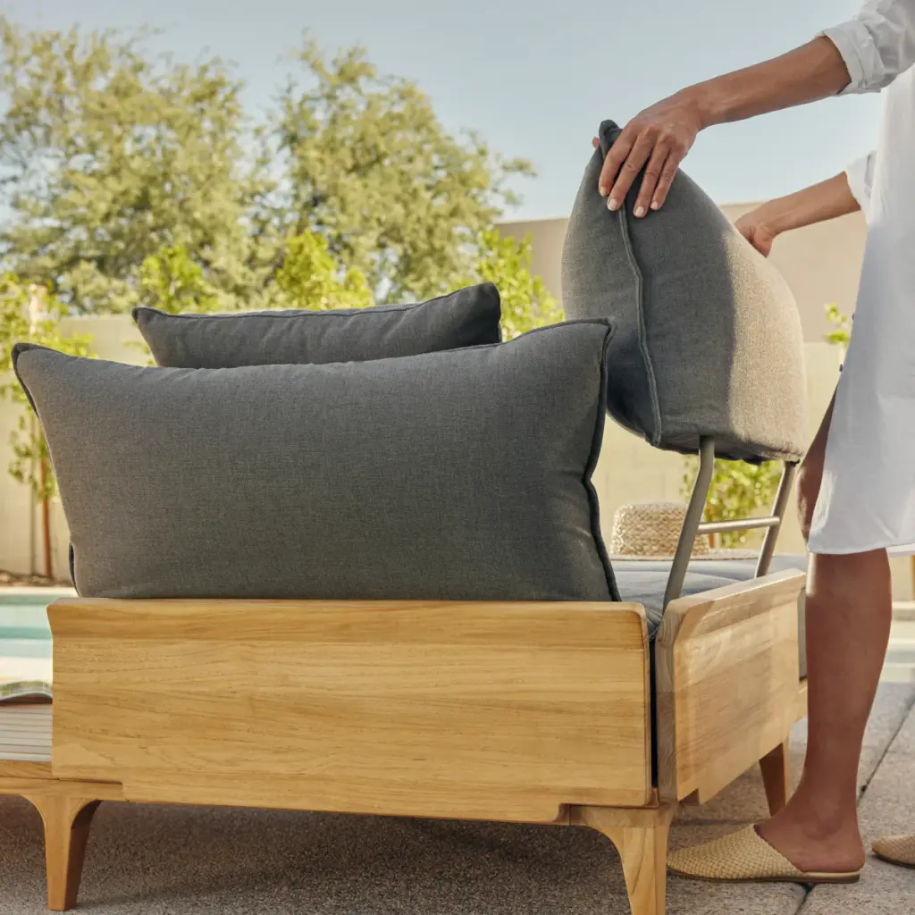 Luxurious in style and comfort, The Bluff collection is crafted with SVLK-certified teak, fade-proof Sunbrella® fabric and quick-dry cushions. Handcrafted details add elegance and highlight the beauty of the natural wood grain. Floating cushions, extra deep seats and down-like throw pillows make it a vacation-at-home favorite.