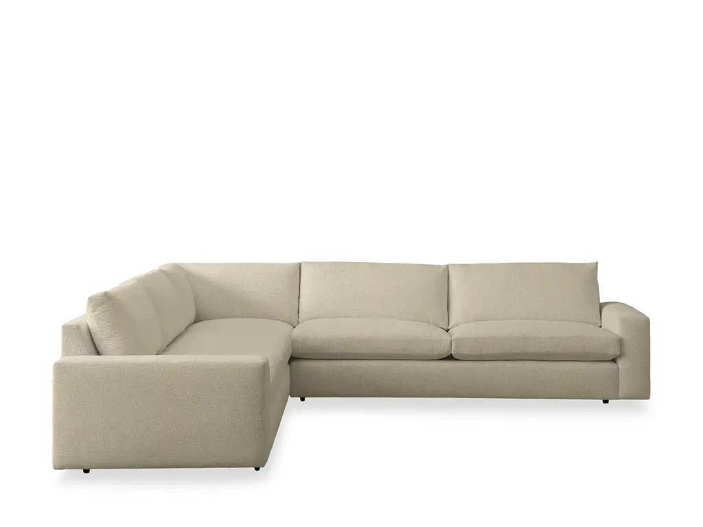 Settle into Blumen Bumper Sectional's modern, loungy frame. Piping on the arms, ample leg room, and a conveniently angled seat back come together to deliver a truly sleek, comfy lounge. Handcrafted in the US with your choice of fabric, filling, dimension, layout and leg style.