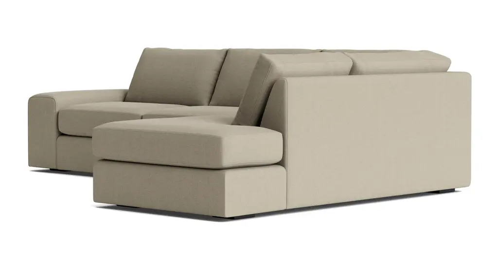Settle into Blumen Bumper Sectional's modern, loungy frame. Piping on the arms, ample leg room, and a conveniently angled seat back come together to deliver a truly sleek, comfy lounge. Handcrafted in the US with your choice of fabric, filling, dimension, layout and leg style.